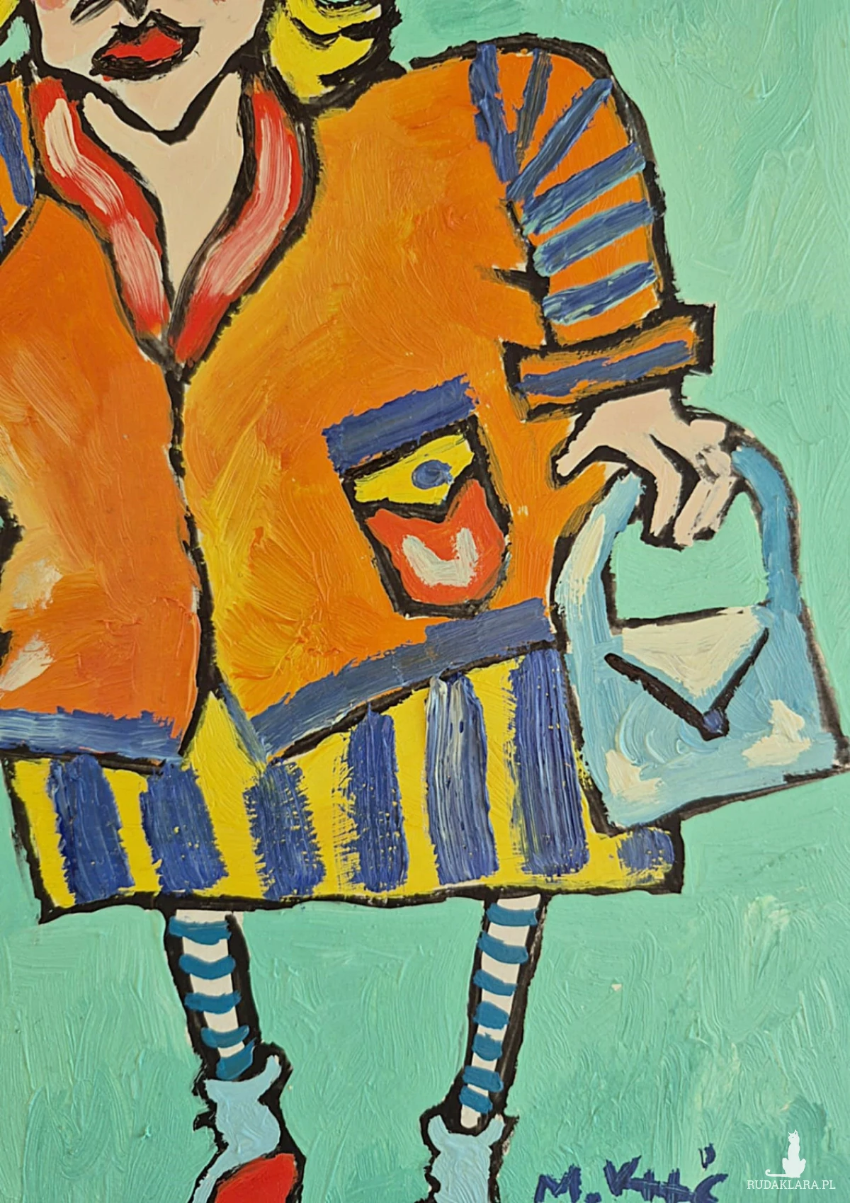 Na obrazie widzimy postać jak z bajki lub snu – kobietę o przerysowanych proporcjach, namalowaną grubą, zdecydowaną kreską. Jej sylwetka jest dynamiczna, jakby była w ruchu lub pozowała z teatralną pewnością siebie. Ma jasne, żółte włosy obcięte na prosto, ozdobione fantazyjnym piórkiem, a oczy skrywa za ciemnymi okularami, co dodaje jej tajemniczości i lekkiej ironii. Różowe rumieńce i czerwone usta podkreślają ekspresję twarzy.