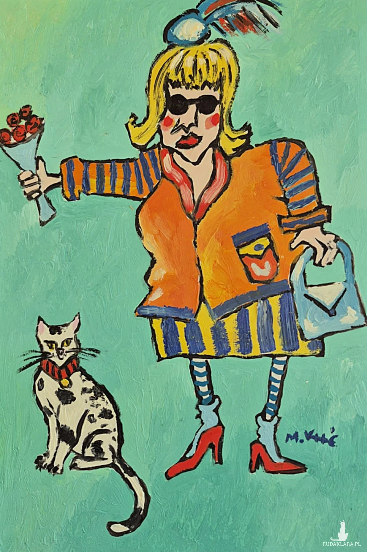 Obok niej siedzi kot, biały w czarne łaty, spokojny i czujny. Jego obecność równoważy kompozycję i wprowadza nutę domowego ciepła, a jednocześnie kontrastuje z ekstrawagancją postaci ludzkiej.