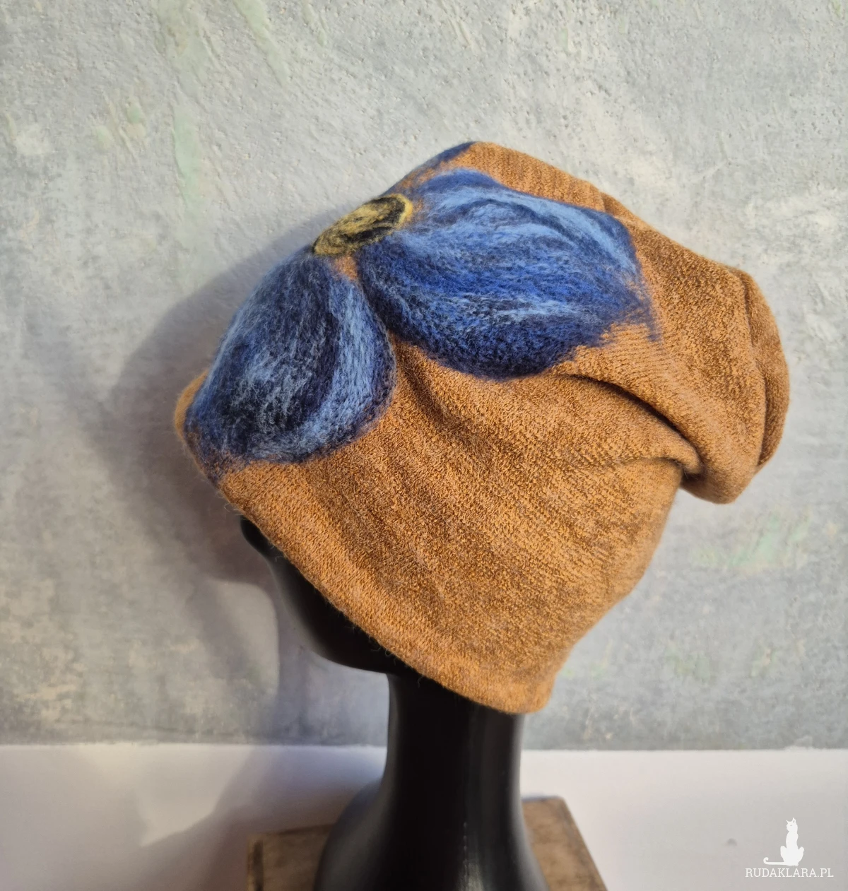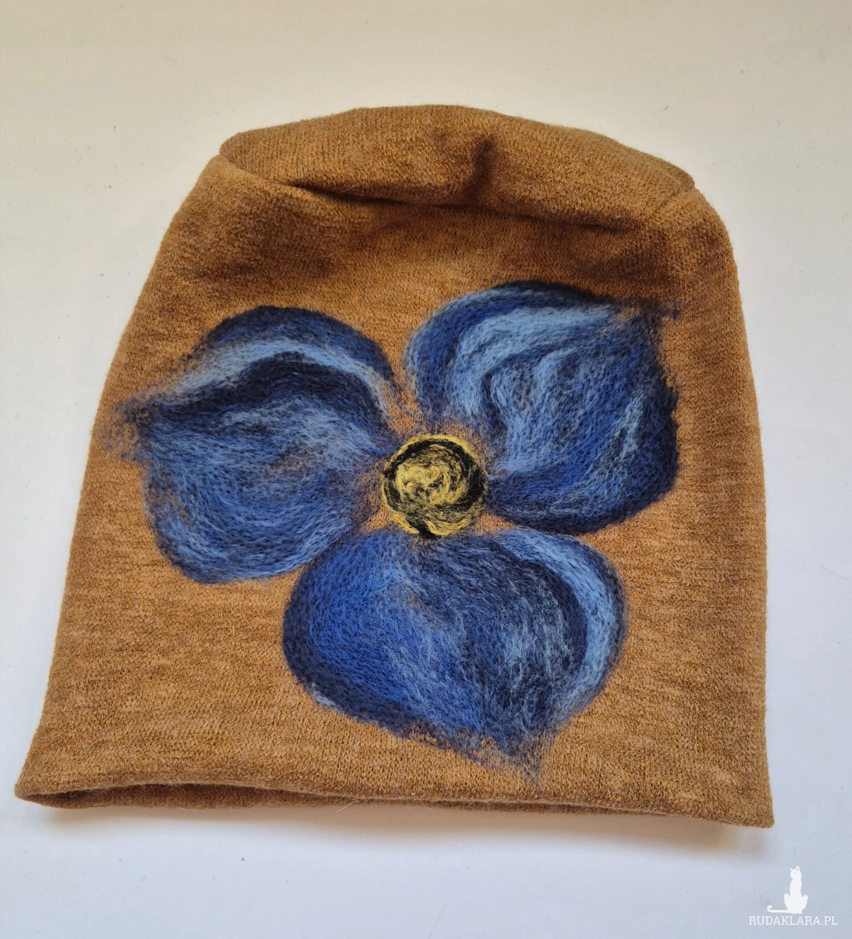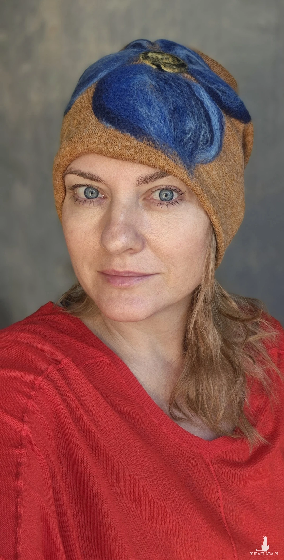 czapka wełniana filcowana zimowa miodowa handmade w kwiaty na podszewce-- rozmiar uniwersalny, wełniana, filcowana wełną merynosów, bardzo ciepła, fantastyczna, miła, miękko układa się na głowie, niesamowicie zwraca uwagę, doskonałą na codzienne noszenie jak i na prezent, zawsze możesz ją założyć po basenie i przeżyjesz,box 44