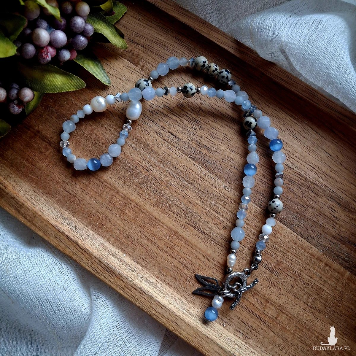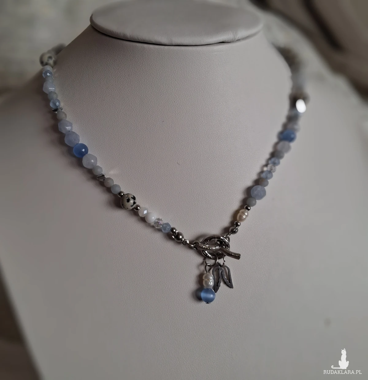 Naszyjnik wykonany z pereł słodkowodnych, kamieni, szklanych koralików i stali nierdzewnej (jubilerskiej). Użyte kamienie: