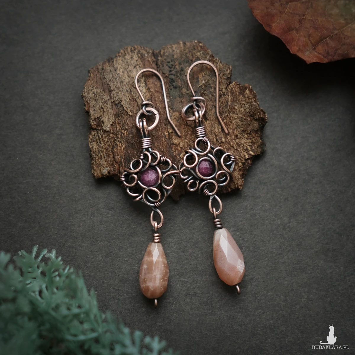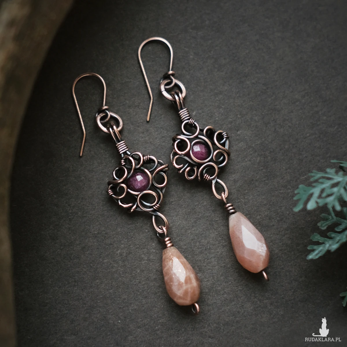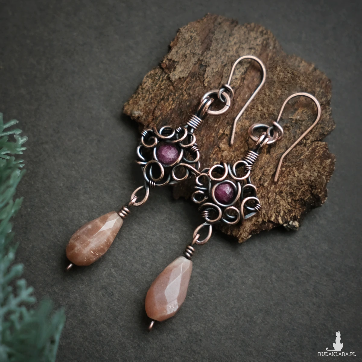 Kolczyki wykonałam pracochłonną techniką wire wrapping. Miedź poddałam oksydacji w celu nadania efektu patyny. Kolczyki posiadają przezroczyste zatyczki, co nie jest pokazane na zdjęciach.
