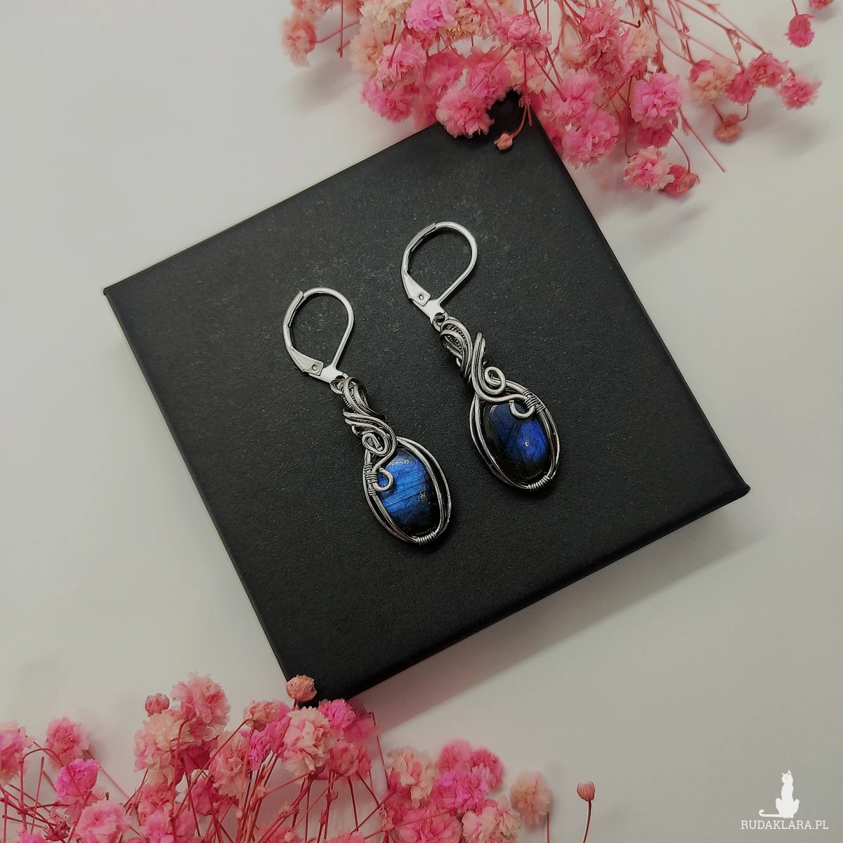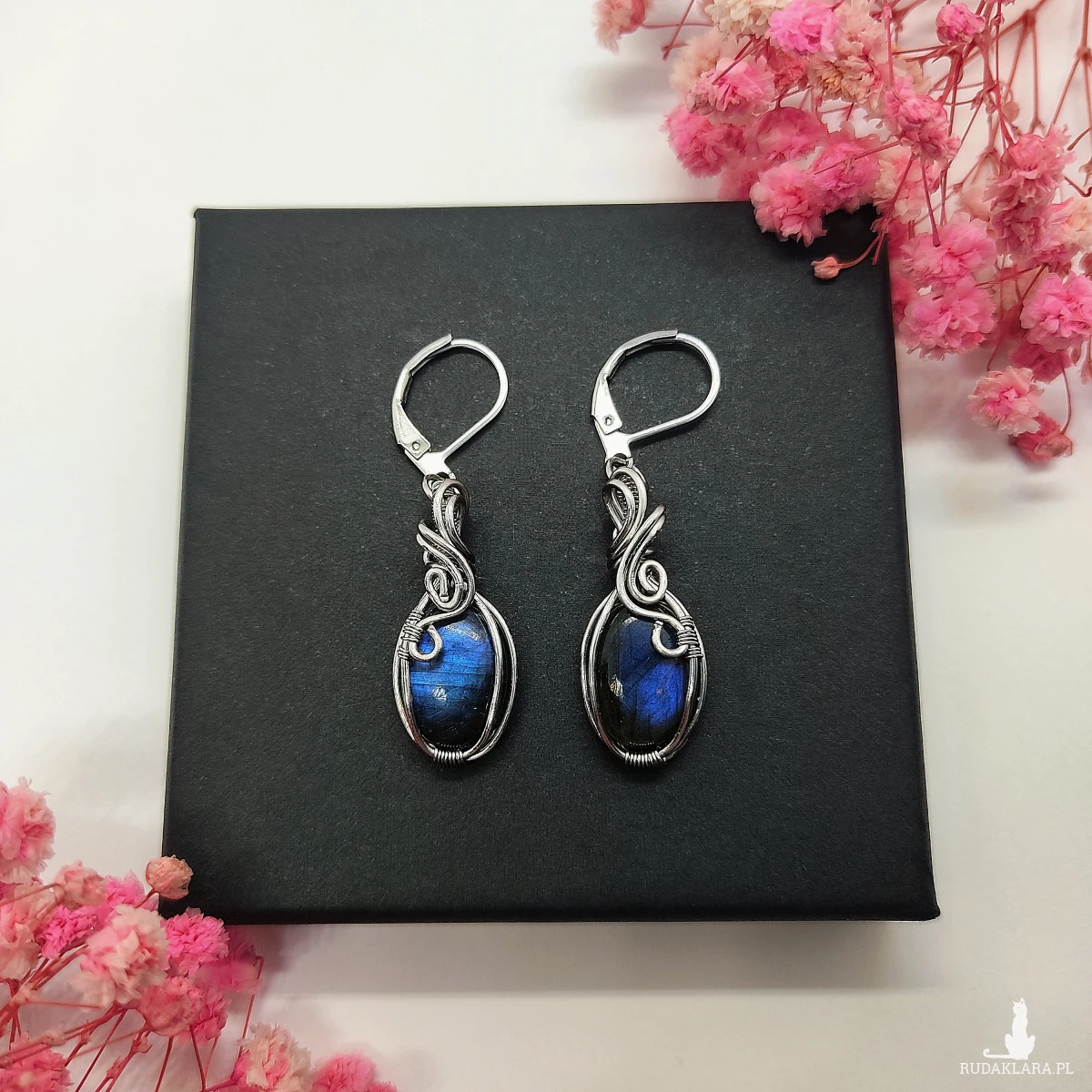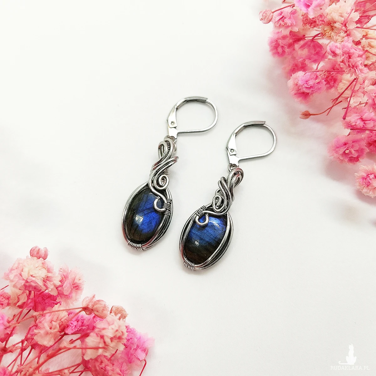 Kolczyki Labradoryt ręcznie robione. Wykonane techniką wirewrapping z drutów ze stali chirurgicznej.
