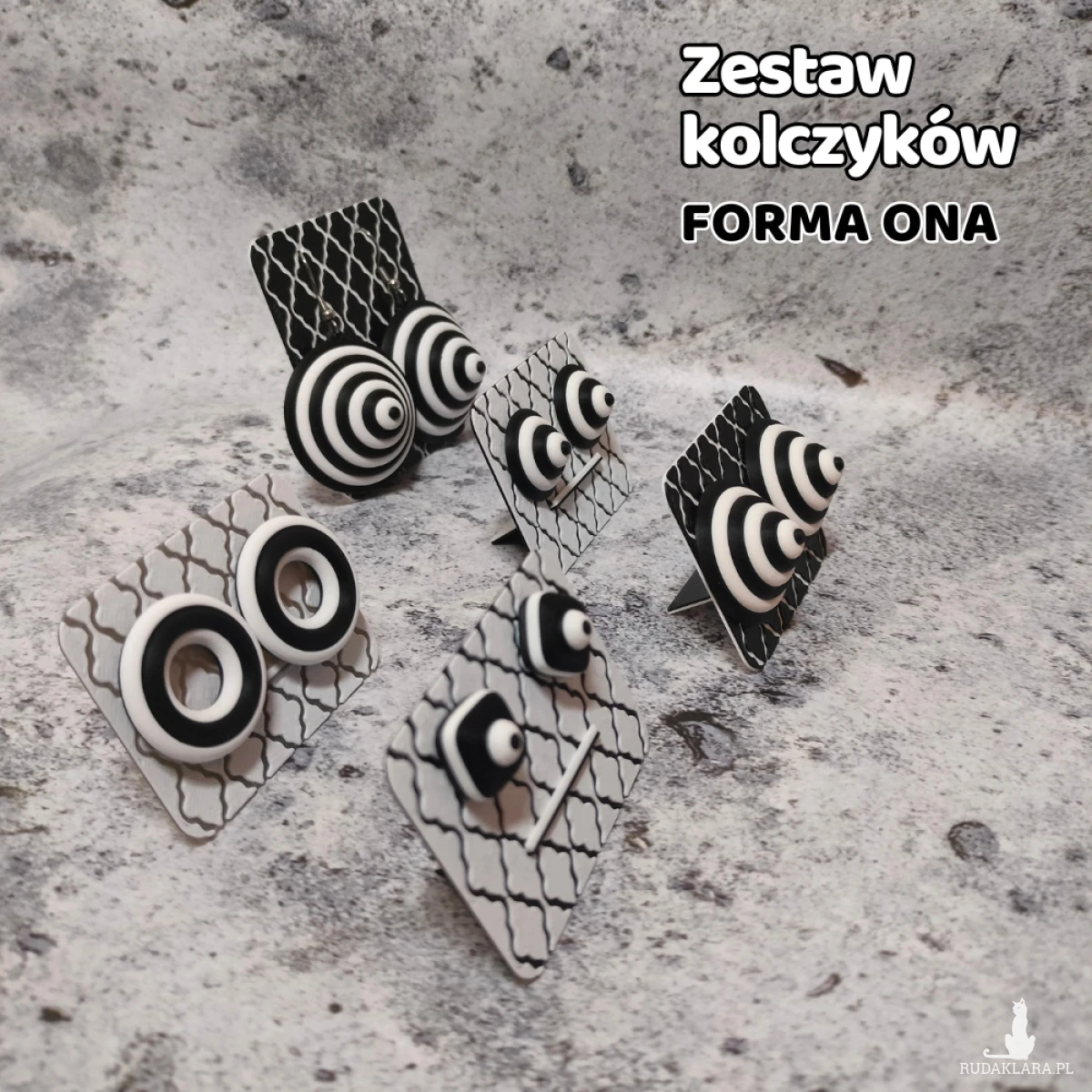 Cały zestaw wykonany z PLA - biodegradowalnego plastiku roślinnego a zapięcia ze stali chirurgicznej kolory srebrnego, sztyft (4 pary kolczyków), bigle (1 para kolczyków). Pomimo wyrazistego charakteru są lekkie, dzięki czemu pozostają komfortowe nawet przy całodziennym noszeniu.
