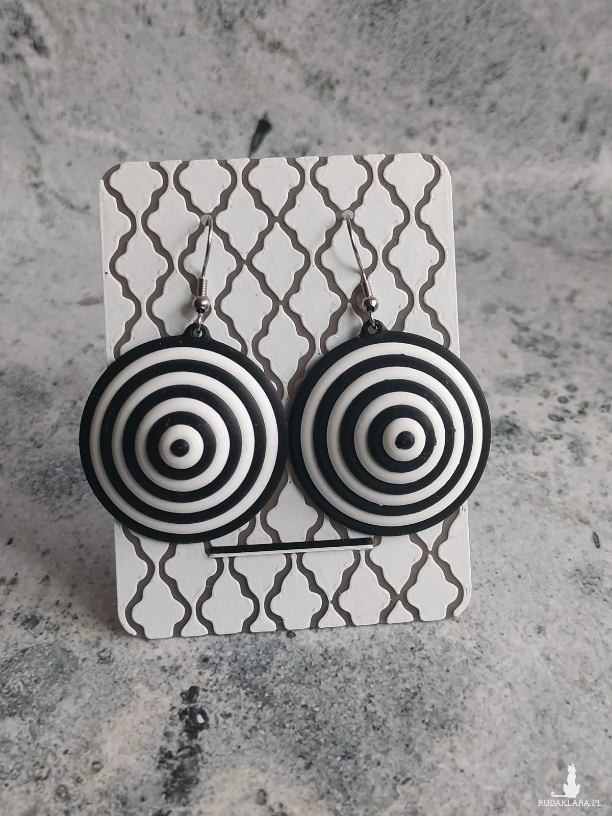 Te kolczyki przyciągają spojrzenie od pierwszej chwili. Koncentryczny wzór okręgów tworzy wyrazistą, trójwymiarową bryłę o stożkowej formie. To biżuteria, która nie potrzebuje koloru ani dodatkowych ozdób. Spodnia część kolczyka posiada gładką strukturę, delikatnie mieniącą się i układającą w geometryczne kształty.