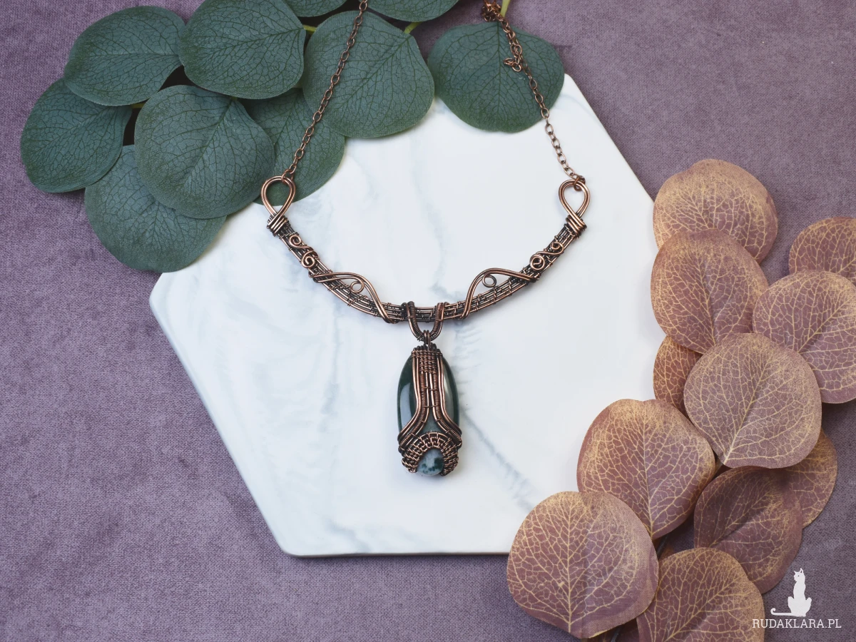 Naszyjnik wykonany techniką wire wrapping to unikatowe połączenie miedzi i agatu mszystego. Subtelne plecenie drutu miedzianego tworzy delikatny, lecz wyrazisty wzór, podkreślając naturalne piękno kamienia. Agat mszysty, bogaty w odcienie zieleni, dodaje naszyjnikowi harmonii i spokoju. To nie tylko elegancki dodatek, ale również talizman łączący siłę natury z ręcznie wykonanym designem.