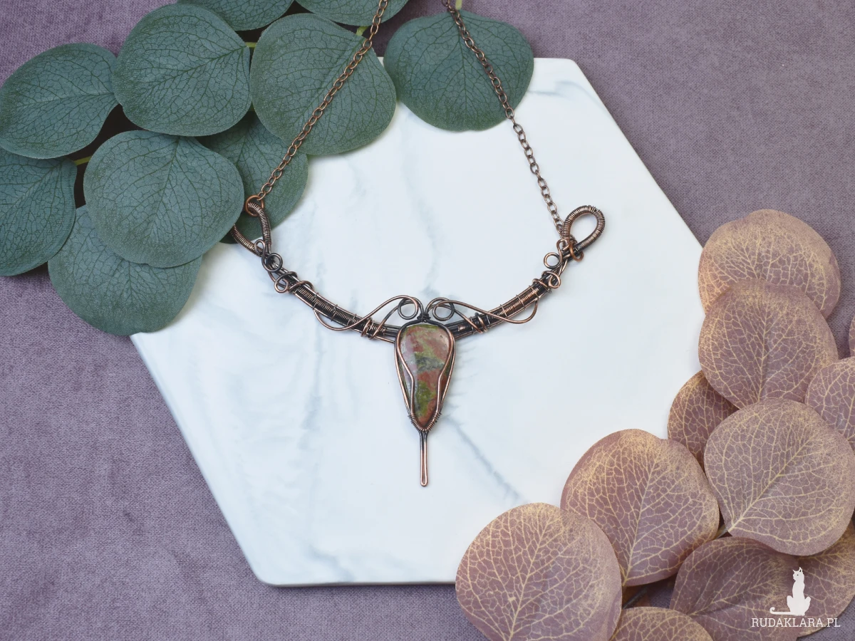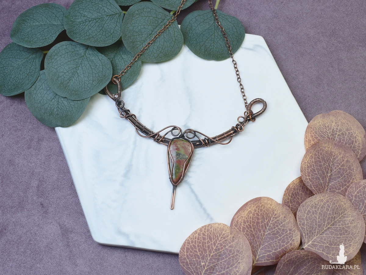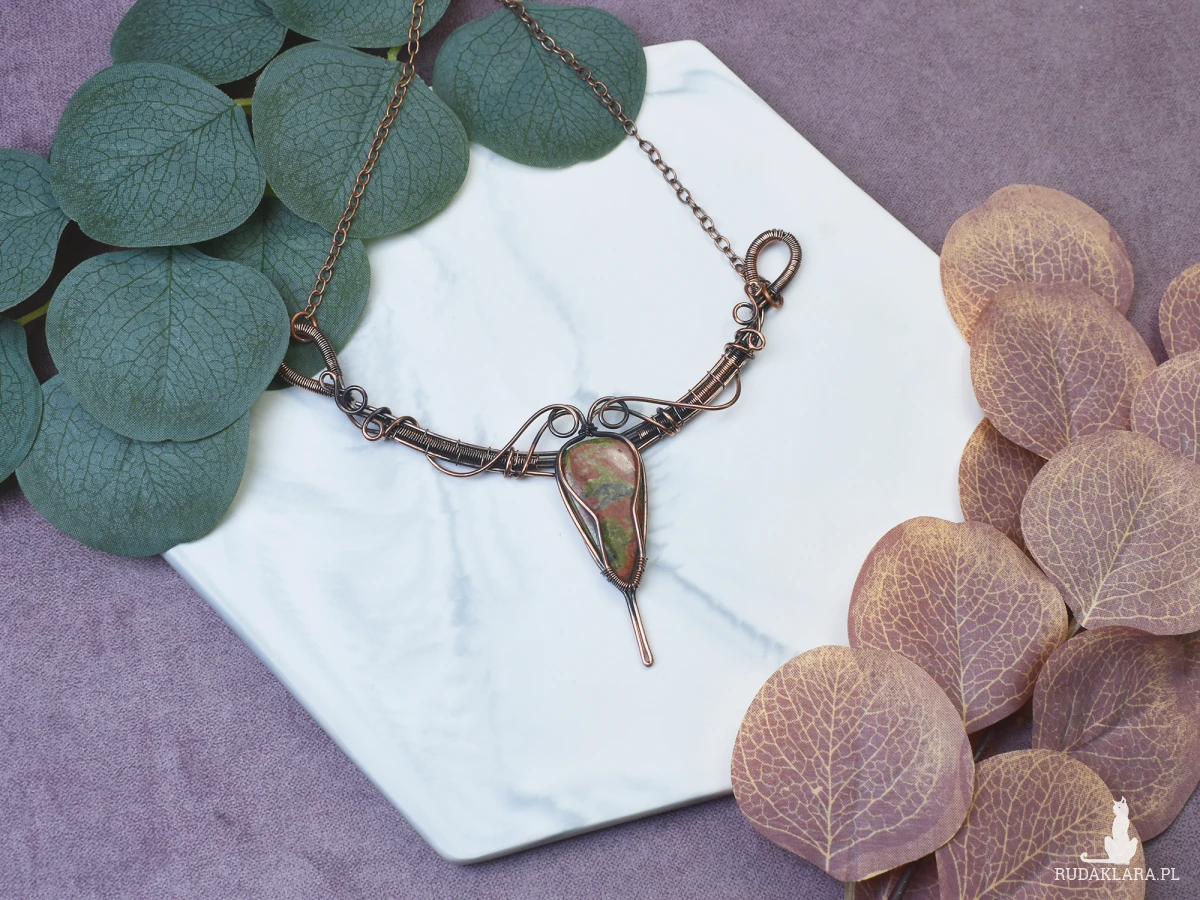 Ten uroczy naszyjnik wykonany jest techniką wire wrapping z miedzi i zdobi go piękny unakit. Ręczne plecenie drutu podkreśla delikatność i precyzję tego unikatowego projektu. Unakit, kamień serca, nadaje naszyjnikowi naturalny urok i jest uznawany za kamień wewnętrznego równowagi. Jego odcienie zieleni i różu tworzą harmonijną paletę, przyciągając wzrok. Ten naszyjnik nie tylko ozdabia, ale także podkreśla Twoją indywidualność i przywołuje pozytywne wibracje.