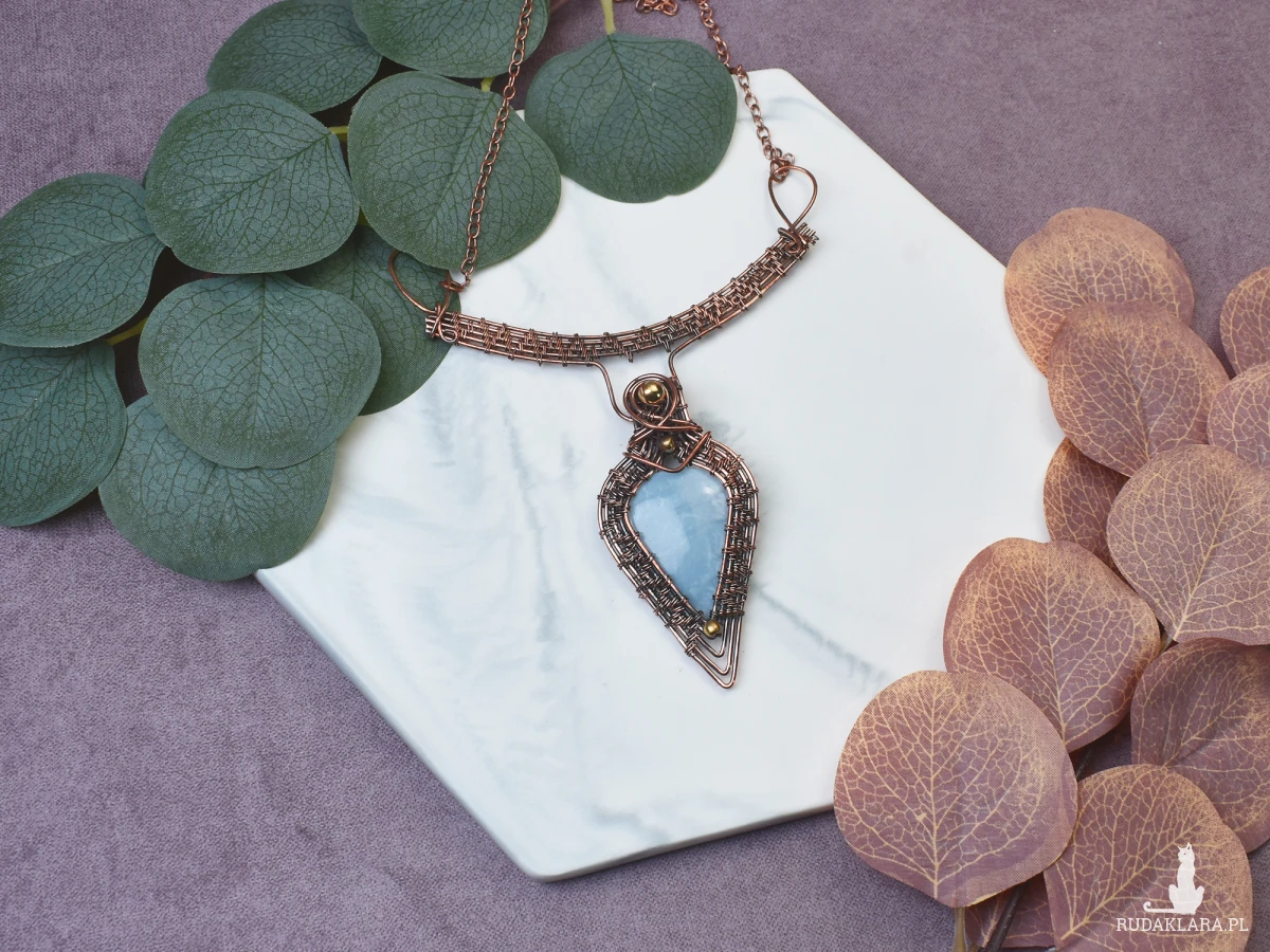 Ten miedziany naszyjnik wykonany techniką wire wrapping zachwyca prostotą i elegancją. Jego sercem jest piękny Owyhee Opal, który emanuje subtelnym blaskiem i niepowtarzalnymi refleksami. Miedź, starannie pleciona wokół kamienia, nadaje całości industrialnego uroku. Naszyjnik emanuje delikatnością i jednocześnie siłą natury, podkreślając unikalność noszącego.