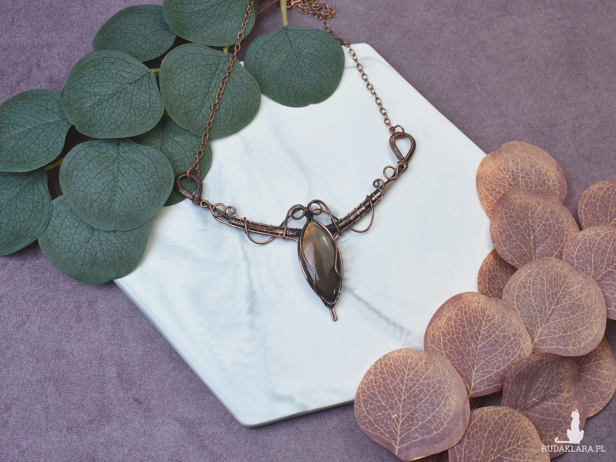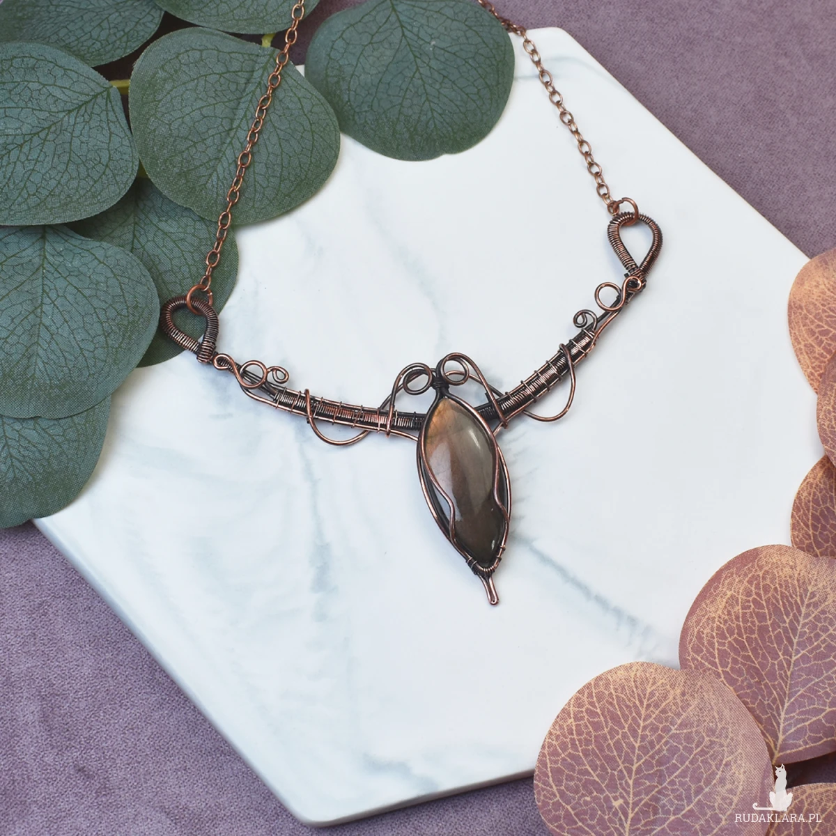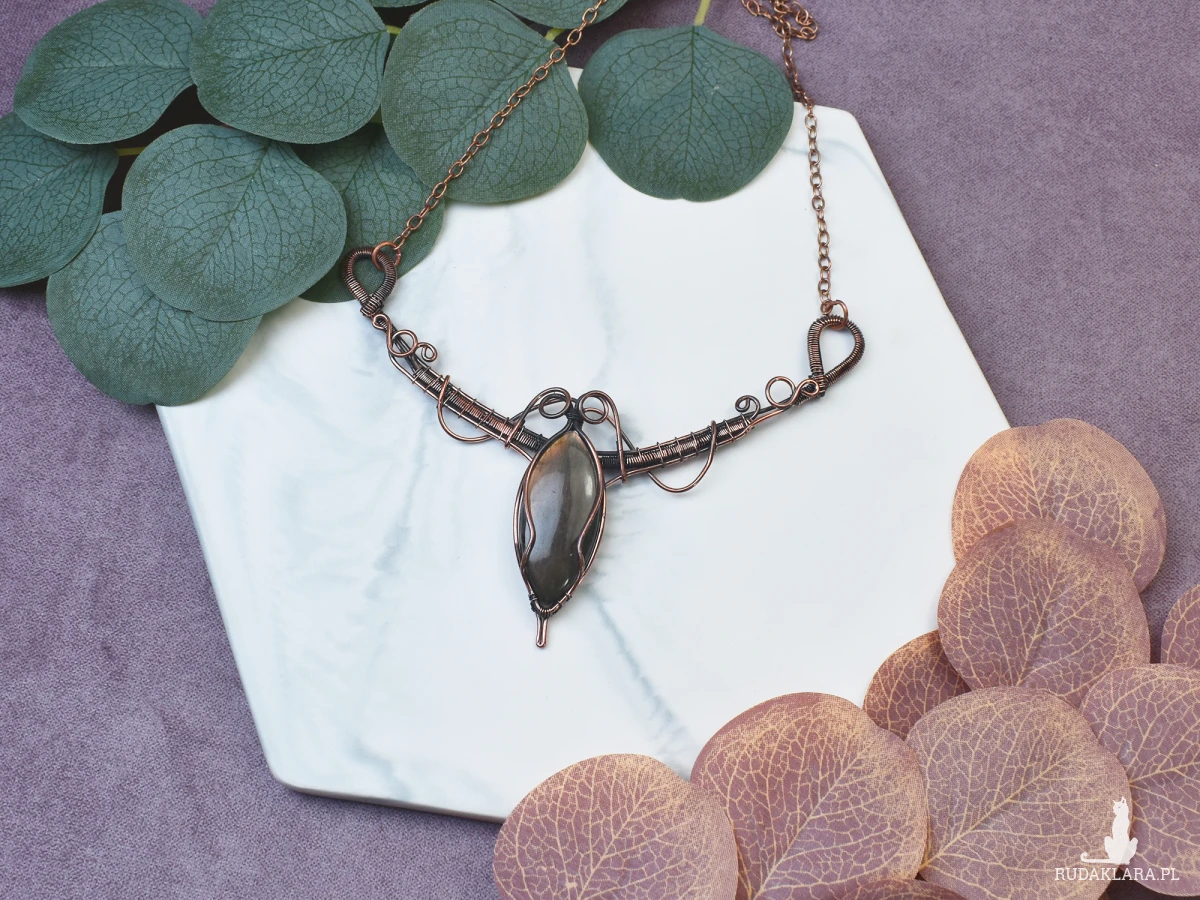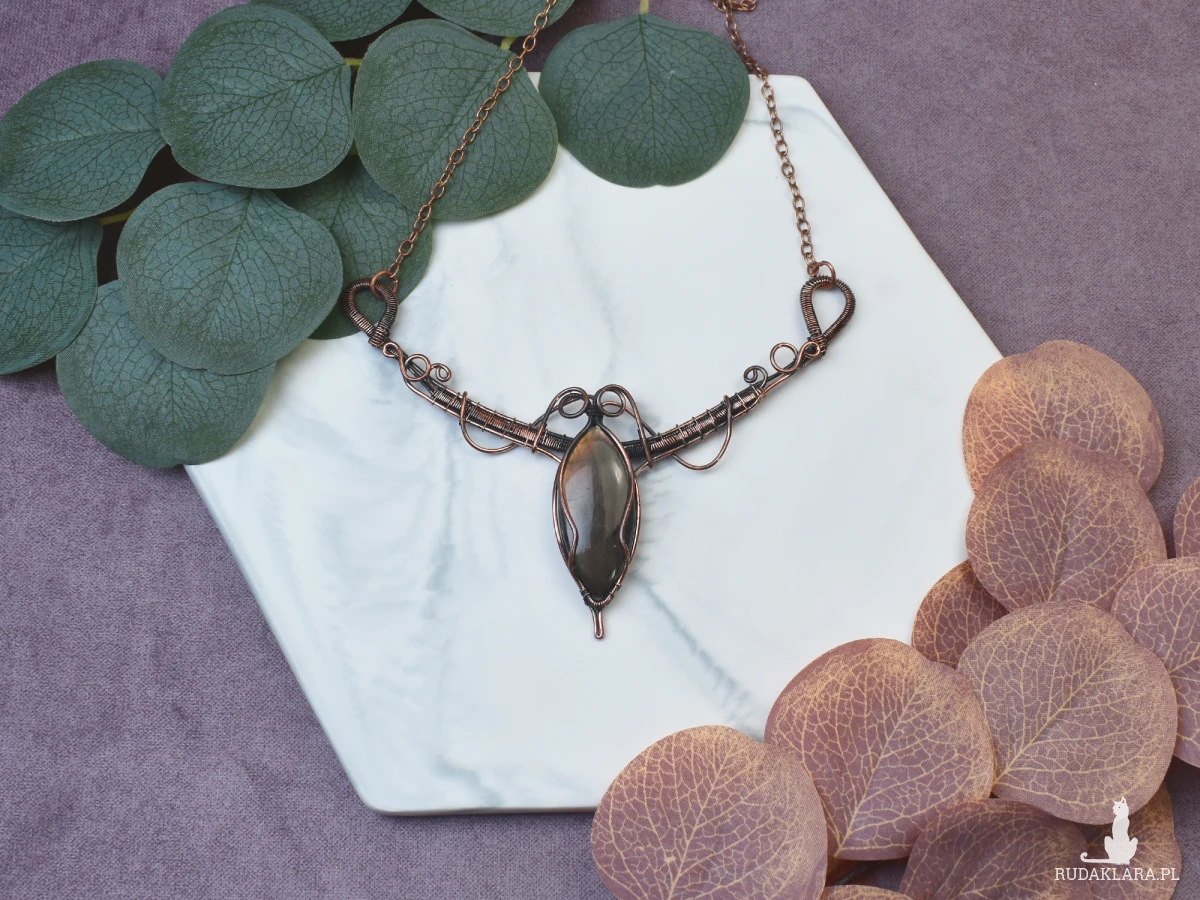 Ten uroczy naszyjnik wykonany techniką wire wrapping to delikatna kombinacja miedzi i labradorytu. Wisiorek w formie geometrycznej spirali oplata kamień, podkreślając jego naturalne piękno. Miedź nadaje całości rustykalny urok, a labradoryt, zmieniając kolory w świetle, dodaje niezwykłej magii. Kamień ten jest uznawany za symbol intuicji i ochrony, co czyni ten naszyjnik nie tylko modnym dodatkiem, ale również talizmanem energii pozytywnej. To wyjątkowe połączenie kunsztu ręcznej roboty i właściwości kamienia, które sprawia, że naszyjnik emanuje subtelnym pięknem i pozytywną energią.