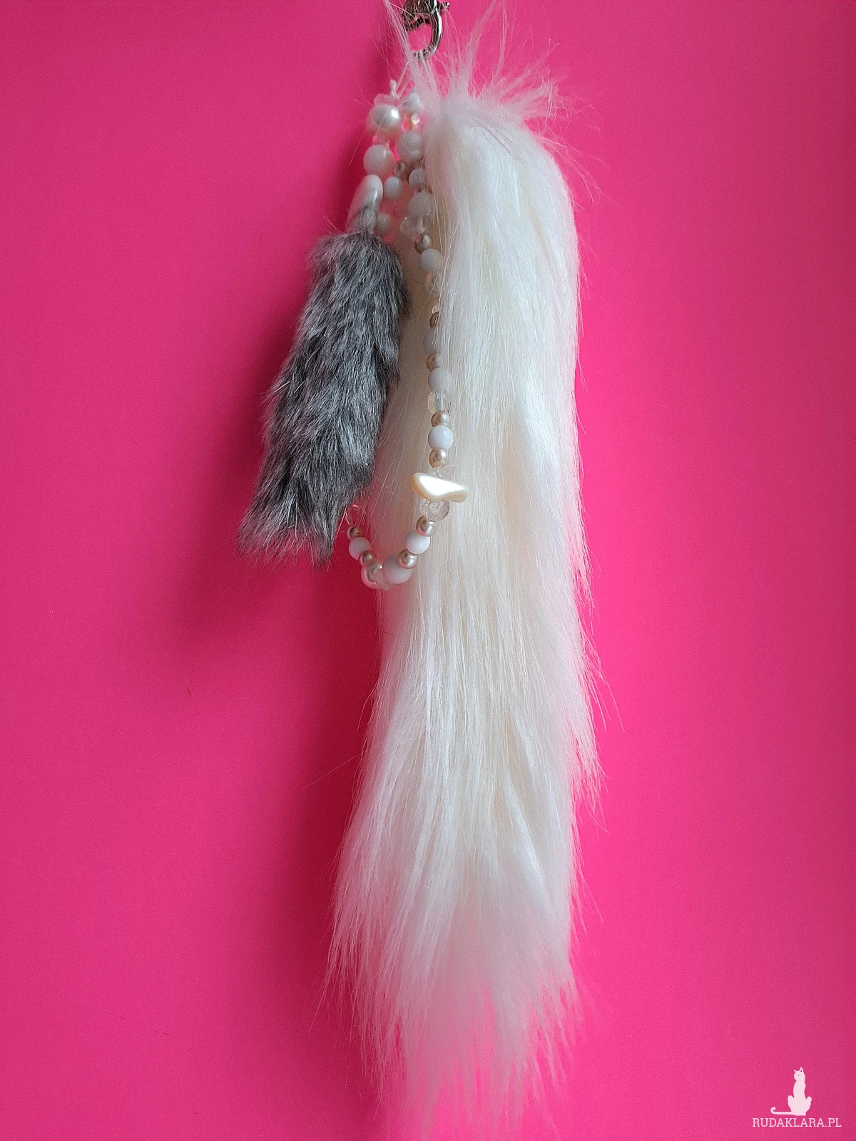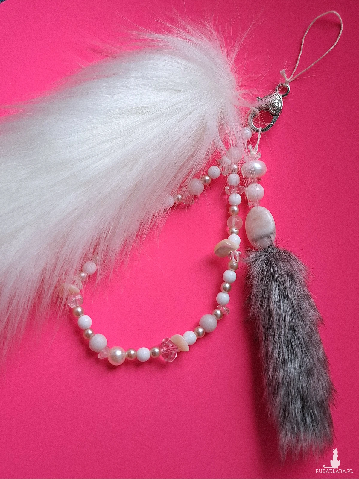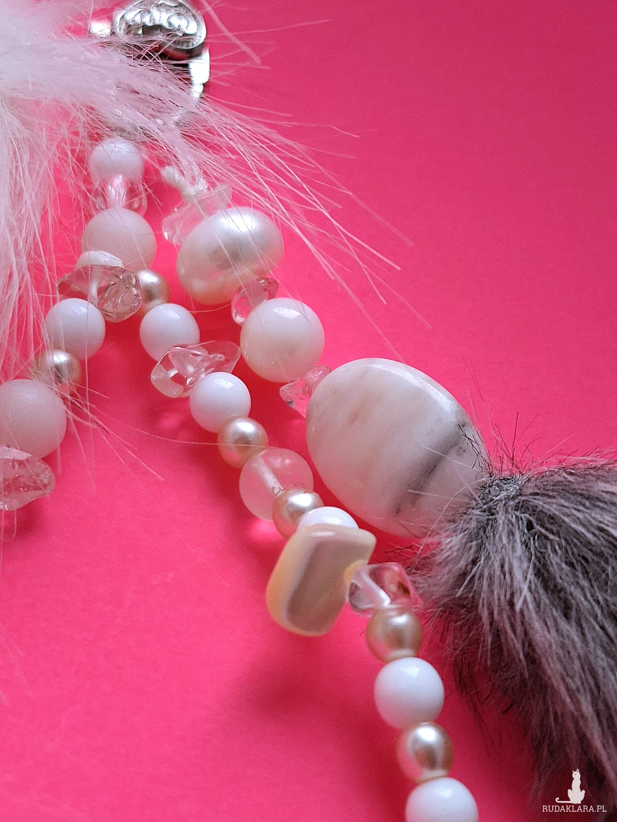 Puchaty brelok do telefonu składający się z trzech części: dużego futrzanego pompona, smyczki z białych szklanych koralików, howlitów i kryształków górskich, oraz mniejszego pomponika z koralikami. Elementy można nosić razem, lub każdy z osobna. Całość zamontowana jest na karabińczyku ze sznureczkem, który podpinamy do telefonu.