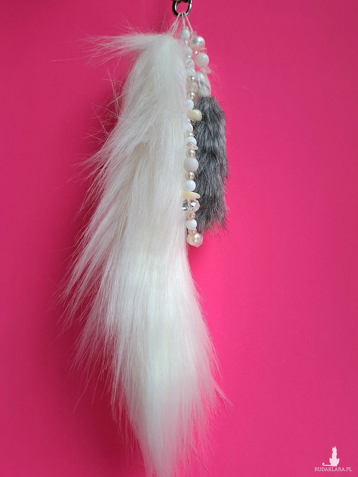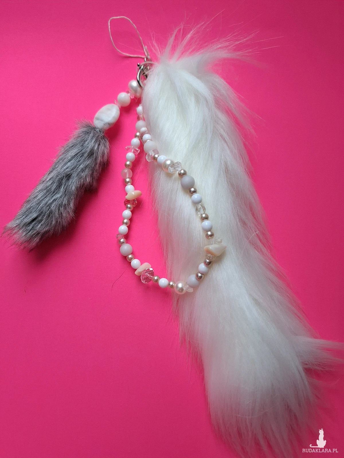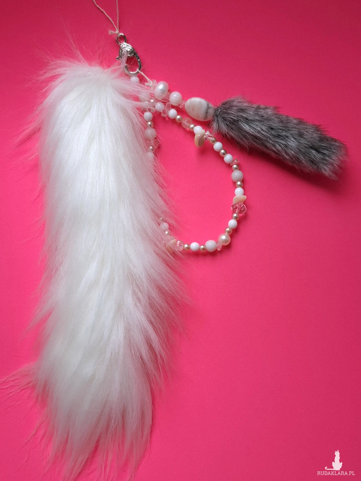 Puchaty brelok do telefonu składający się z trzech części: dużego futrzanego pompona, smyczki z białych szklanych koralików, howlitów i kryształków górskich, oraz mniejszego pomponika z koralikami. Elementy można nosić razem, lub każdy z osobna. Całość zamontowana jest na karabińczyku ze sznureczkem, który podpinamy do telefonu.