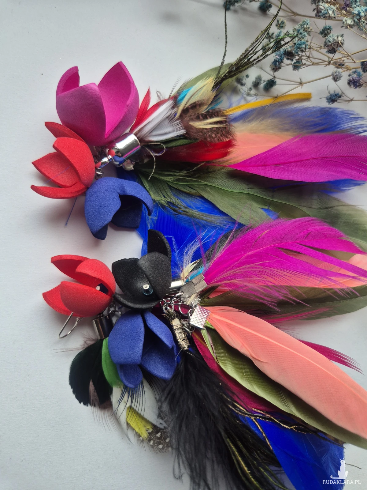 Kolczyki kolorowe energetyczne  pióra duże lekkie wykonane w pojedynczym egzemplarzu rękodzieło