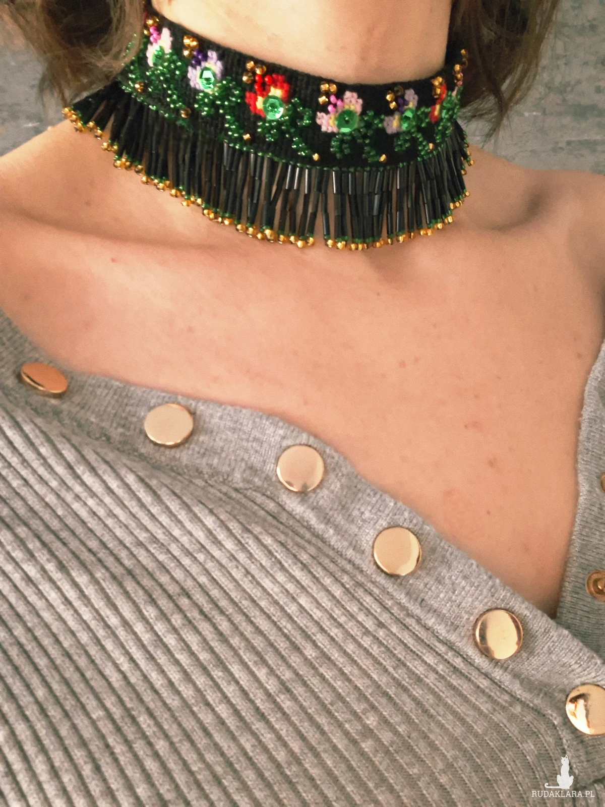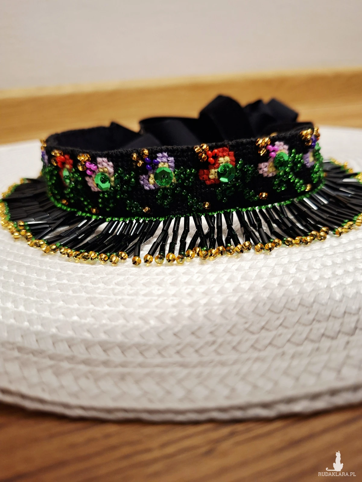 Śliczny naszyjnik haftowany. Ozdobiony koralikami. Wszystko przyszyte do taśmy aksamitnej. Oryginalny prezent dla bliskiej osoby.