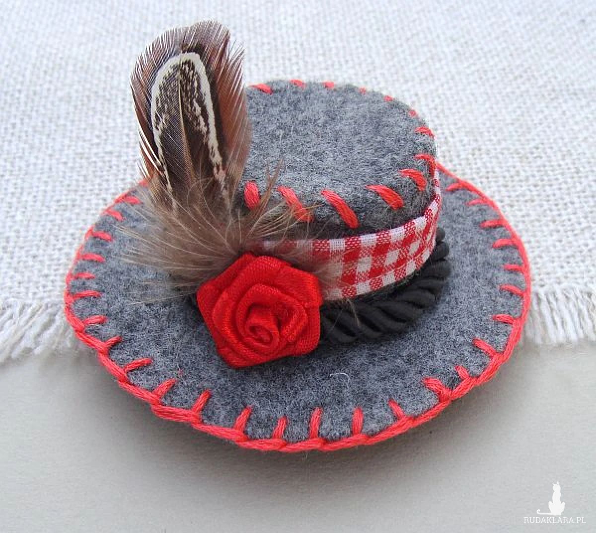 Mini filcowy kapelusz – urocza, ręcznie wykonana ozdoba, która idealnie uzupełni stylizację na Oktoberfest lub inne folkowe wydarzenia. Starannie dopracowany w każdym detalu, świetnie pasuje do tradycyjnych strojów ludowych.