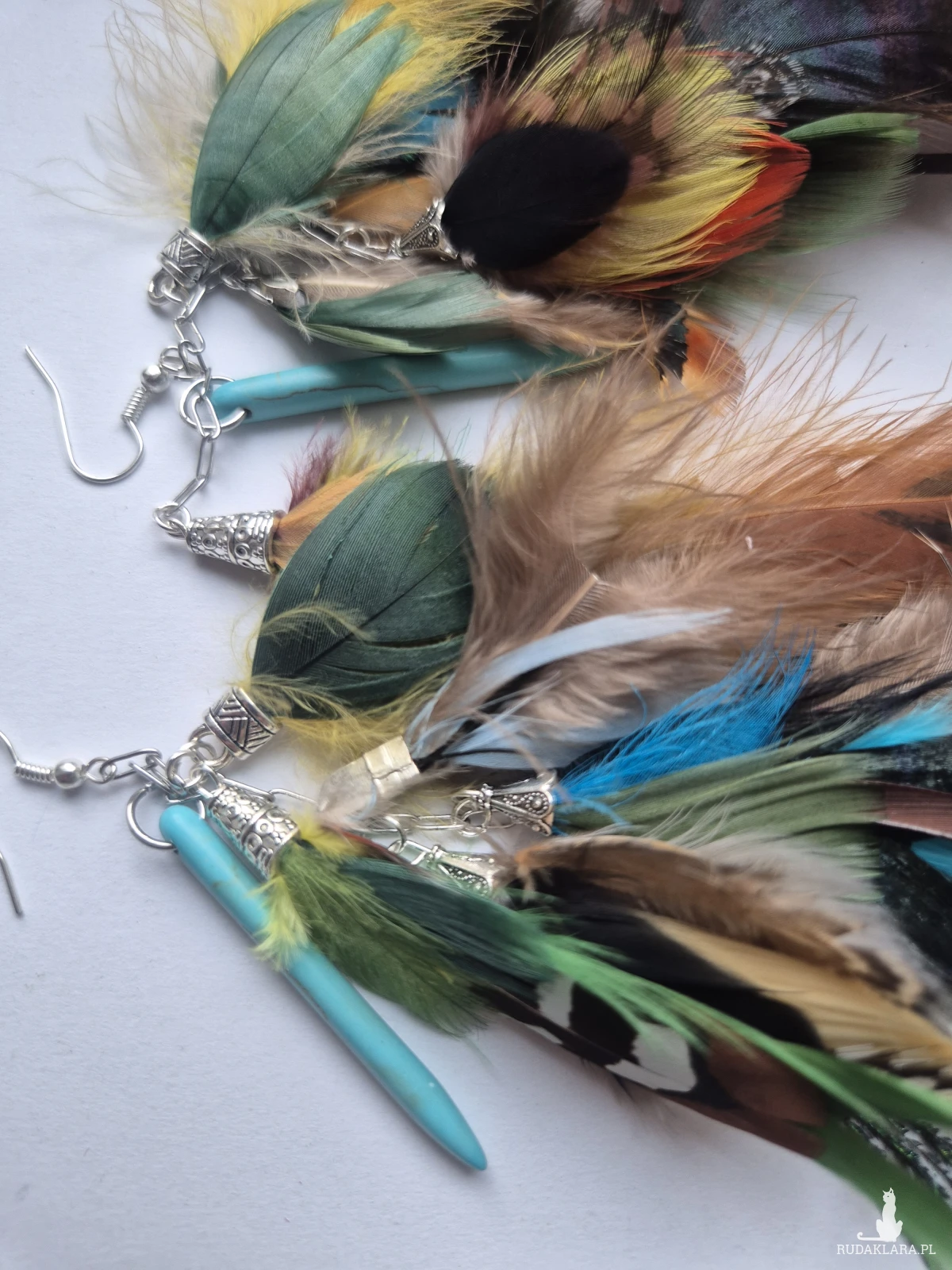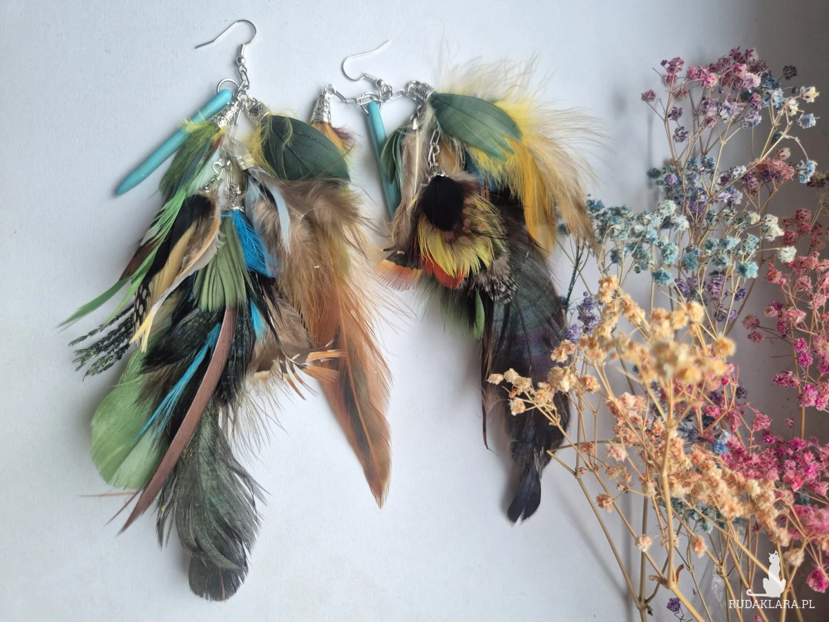 Kolczyki kolorowe energetyczne  pióra duże lekkie wykonane w pojedynczym egzemplarzu rękodzieło