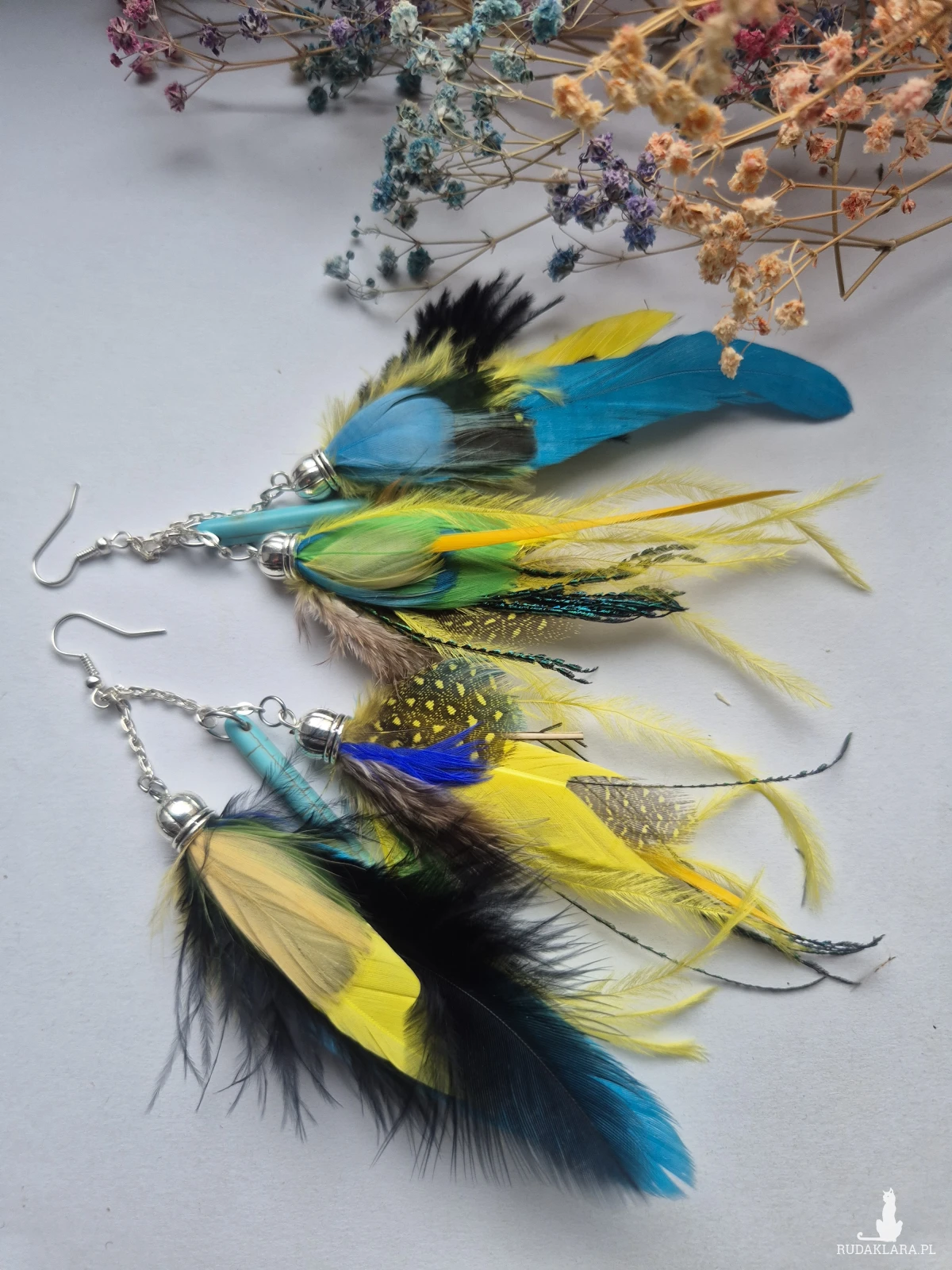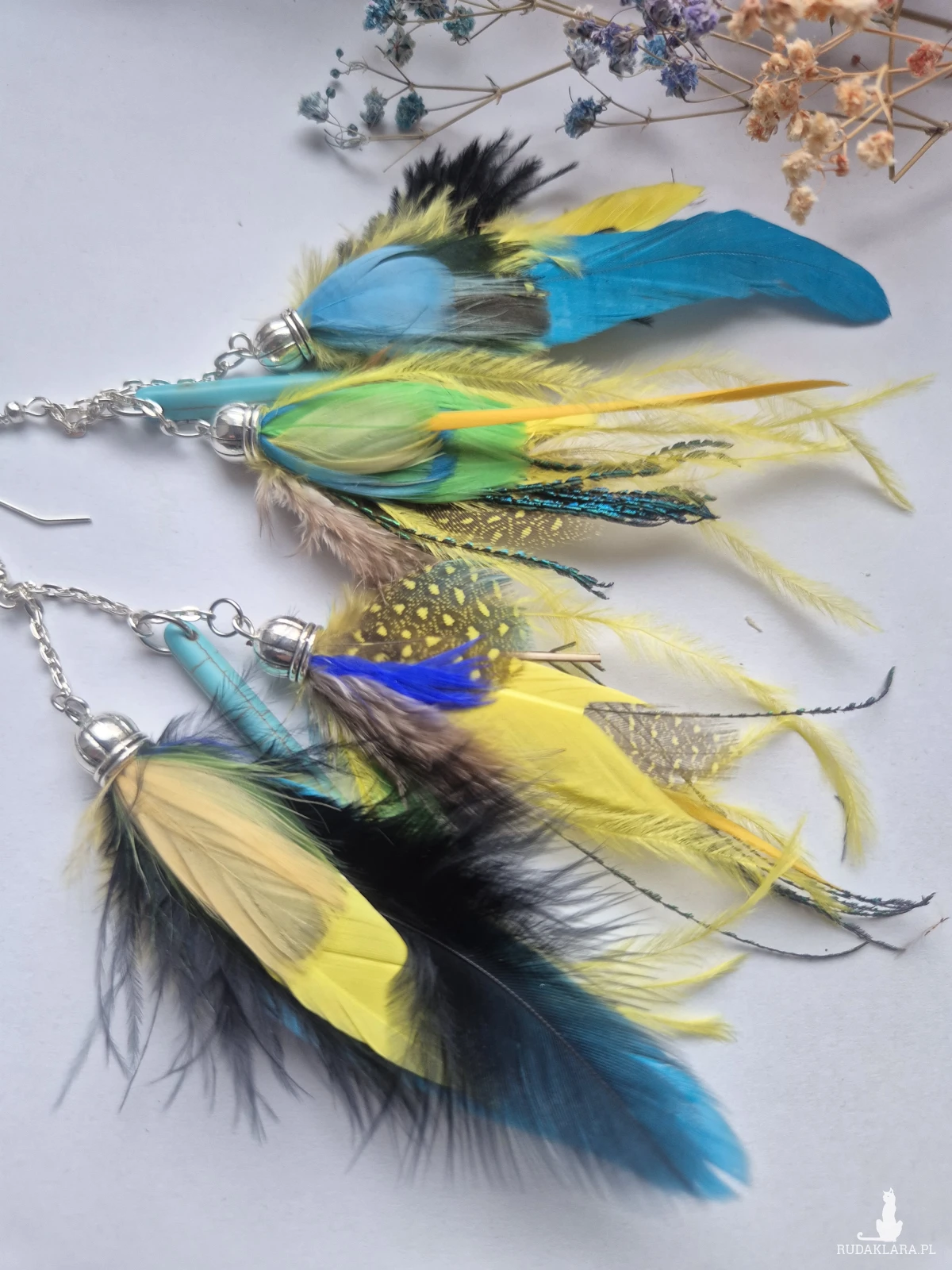 Kolczyki kolorowe energetyczne  pióra duże lekkie wykonane w pojedynczym egzemplarzu rękodzieło