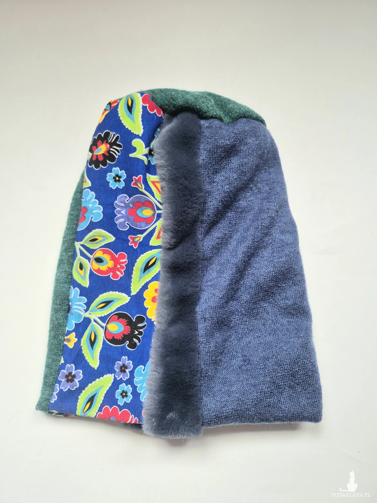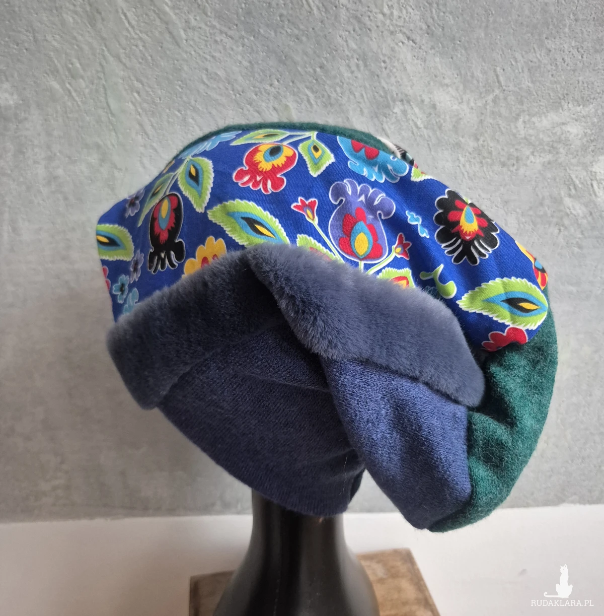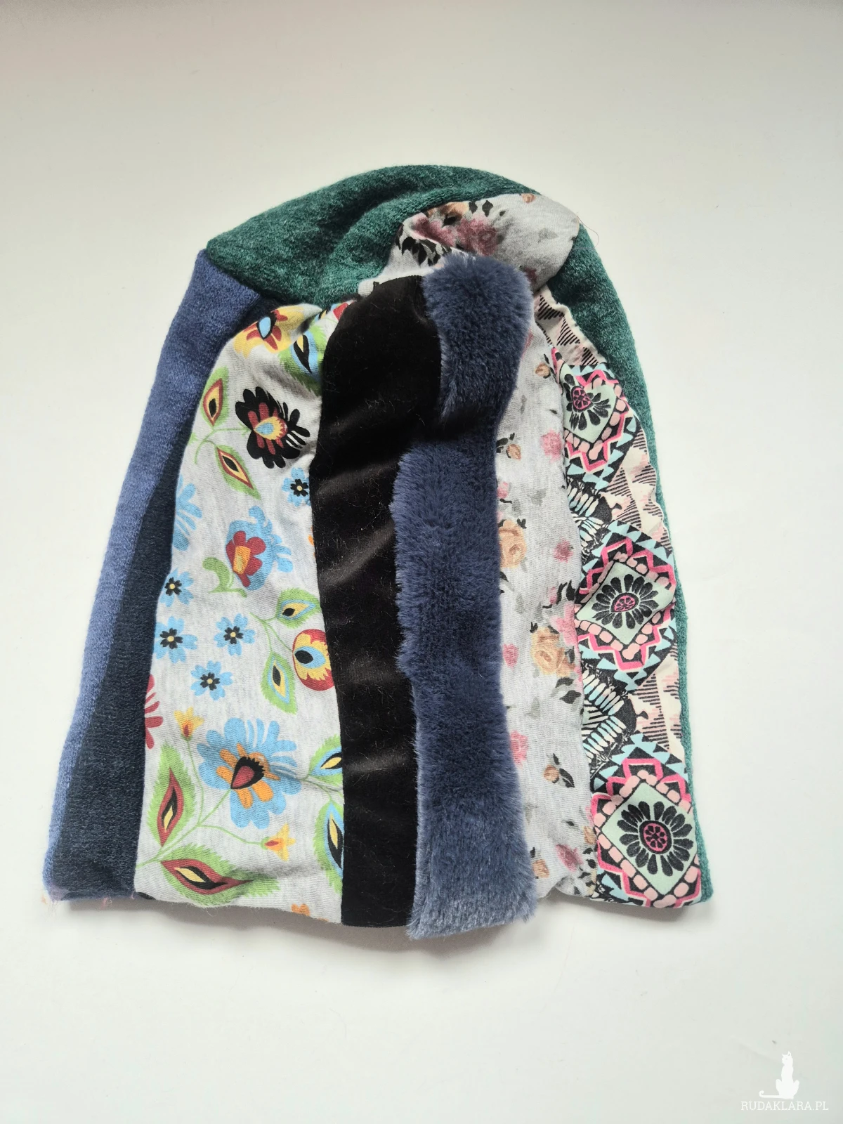 Czapka damska Smerfetka patchworkowa, na podszewce dobra na codzienne noszenie, wykonana w pojedynczym egzemplarzu rękodzieło polecam boks a1