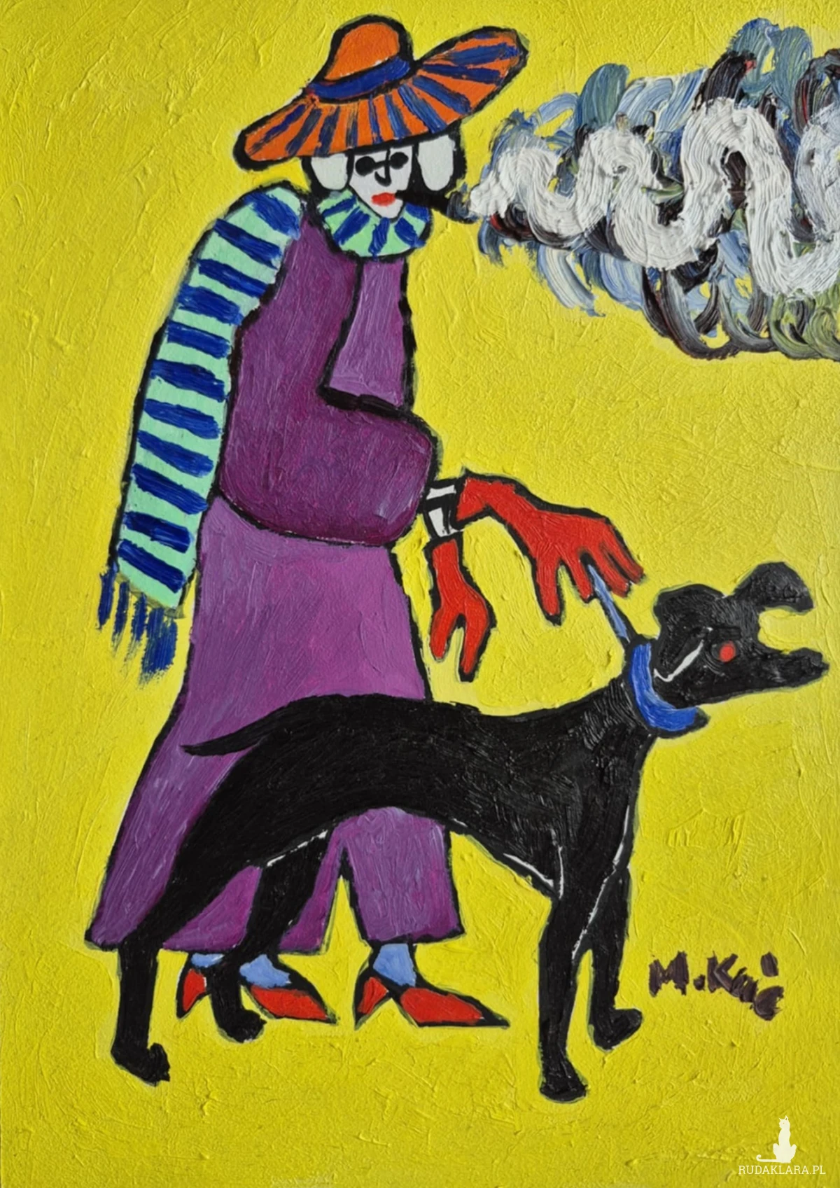 Obok niej znajduje się czarny pies o wydłużonej sylwetce, prowadzony na smyczy. Jego ciało jest niemal graficzne – płaskie, mocno obrysowane konturem. Czerwone detale (dłonie kobiety, buty, oko psa) wprowadzają rytm i lekki niepokój, jakby obraz balansował między codzienną sceną a czymś surrealnym.