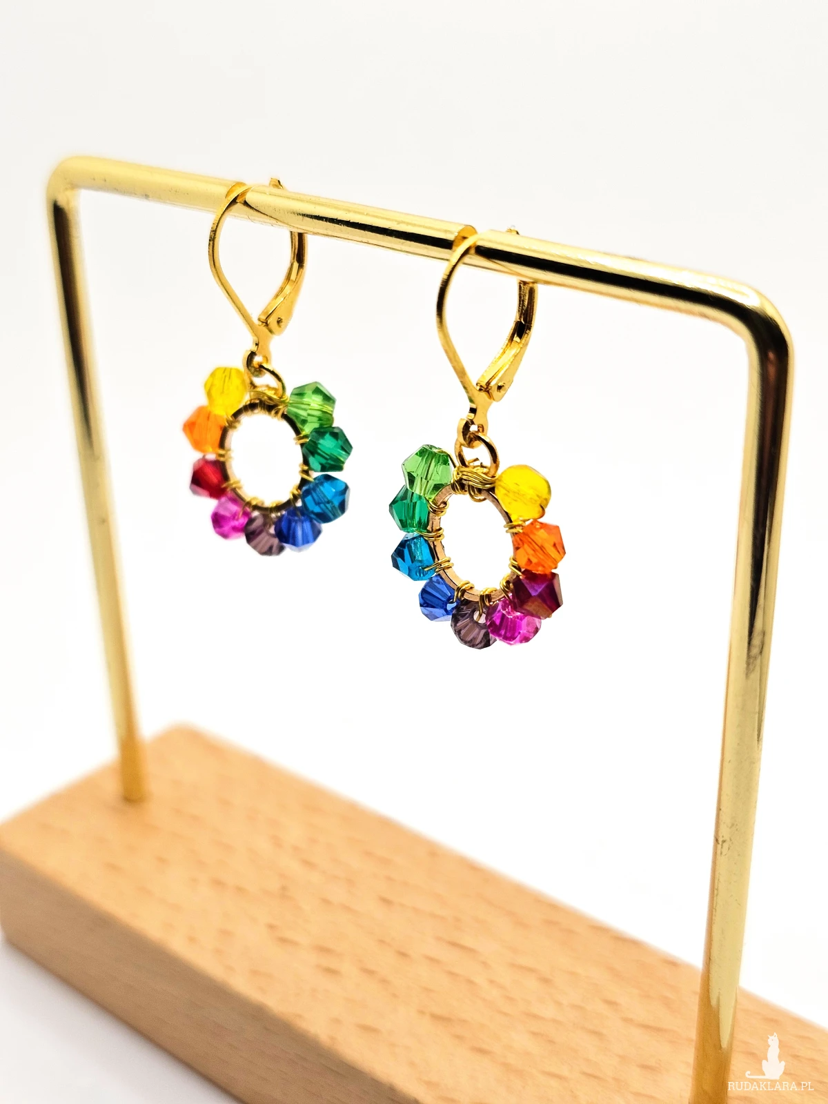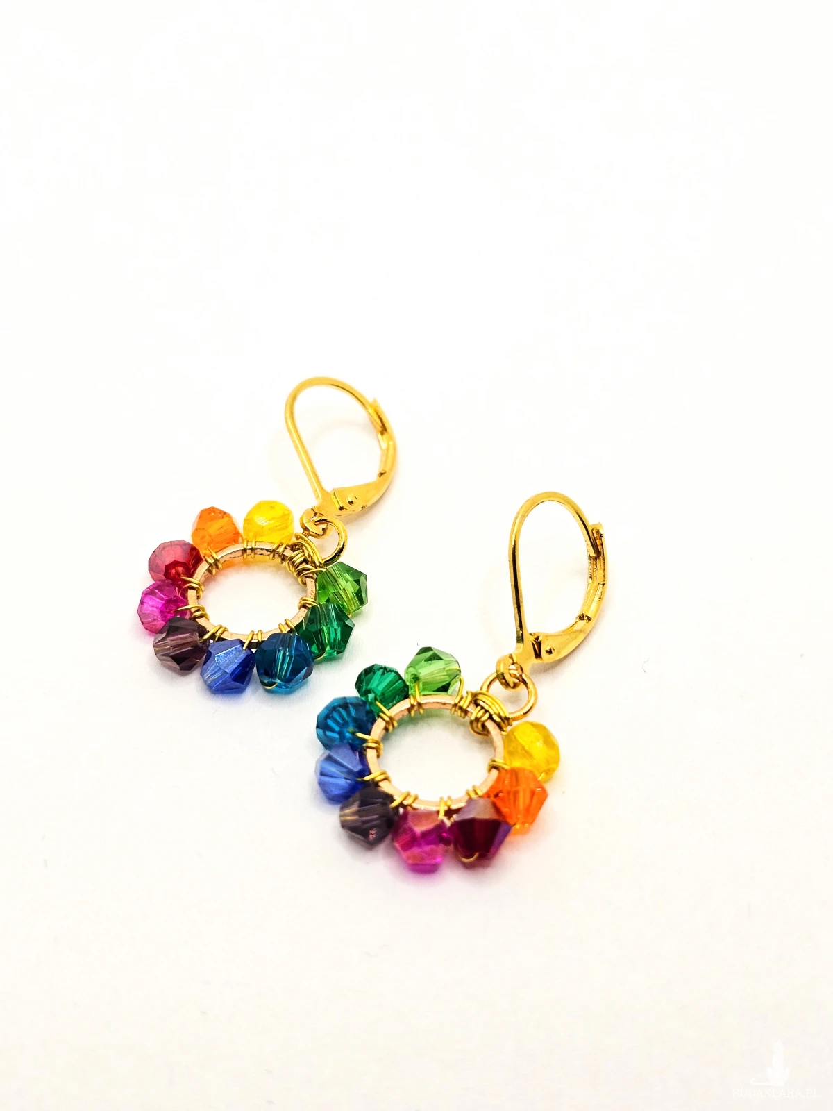 Wiszące kolczyki z szklanymi koralikami i kryształkami. Metalowa baza opleciona kolorowymi koralikami. Kolory w kolczykach: złoty, niebieski, fioletowy, różowy, czerwony, pomarańczowy, żółty, zielony, turkusowy. Kolczyki zawieszone na biglach angielskich w kolorze złotym.