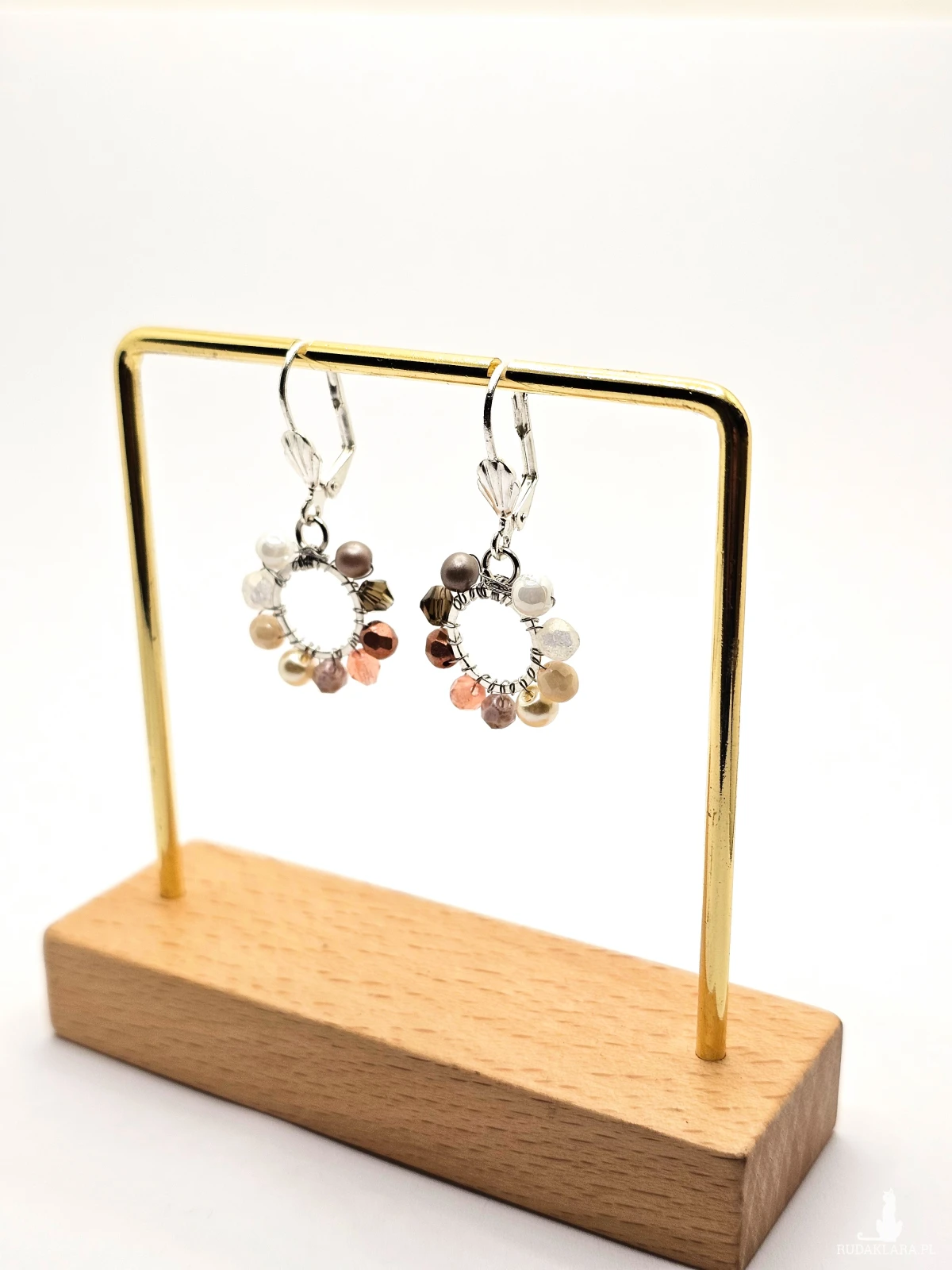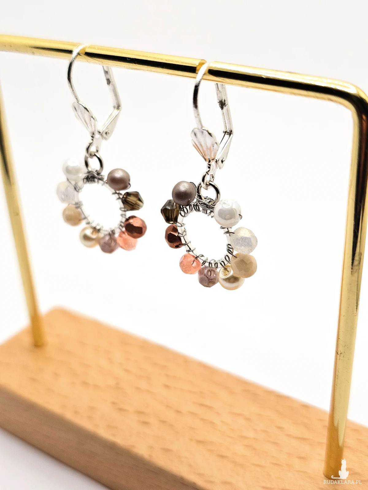 Wiszące kolczyki z szklanymi koralikami i kryształkami. Metalowa baza opleciona kolorowymi koralikami. Kolory w kolczykach: srebrny, biały, kremowy, beżowy, perłowy, różowy. Kolczyki zawieszone na biglach angielskich w kolorze srebrnym.