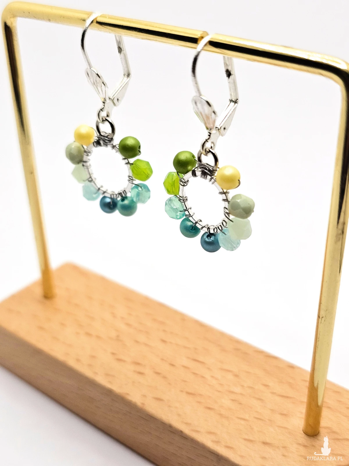 Wiszące kolczyki z szklanymi koralikami i kryształkami. Metalowa baza opleciona kolorowymi koralikami. Kolory w kolczykach: srebrny, żółty, limonkowy, miętowy, turkusowy. Kolczyki zawieszone na biglach angielskich w kolorze srebrnym.