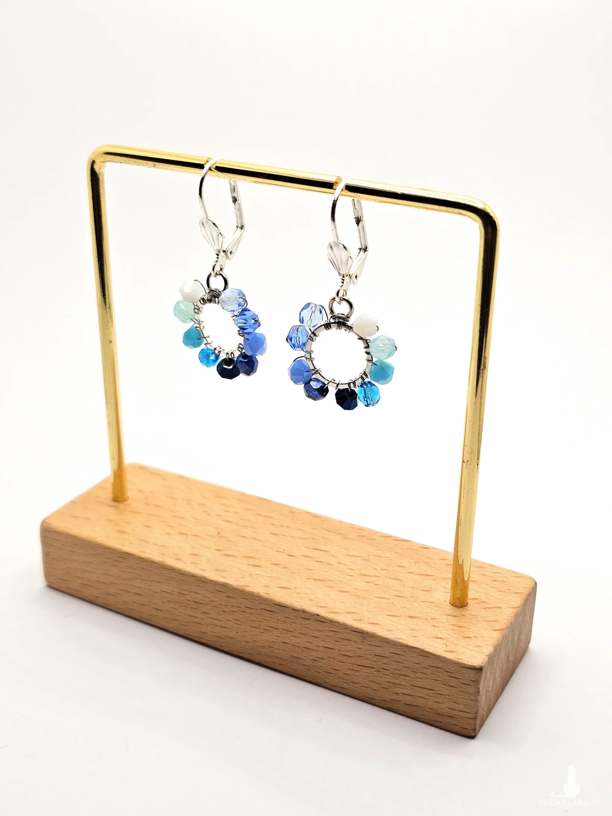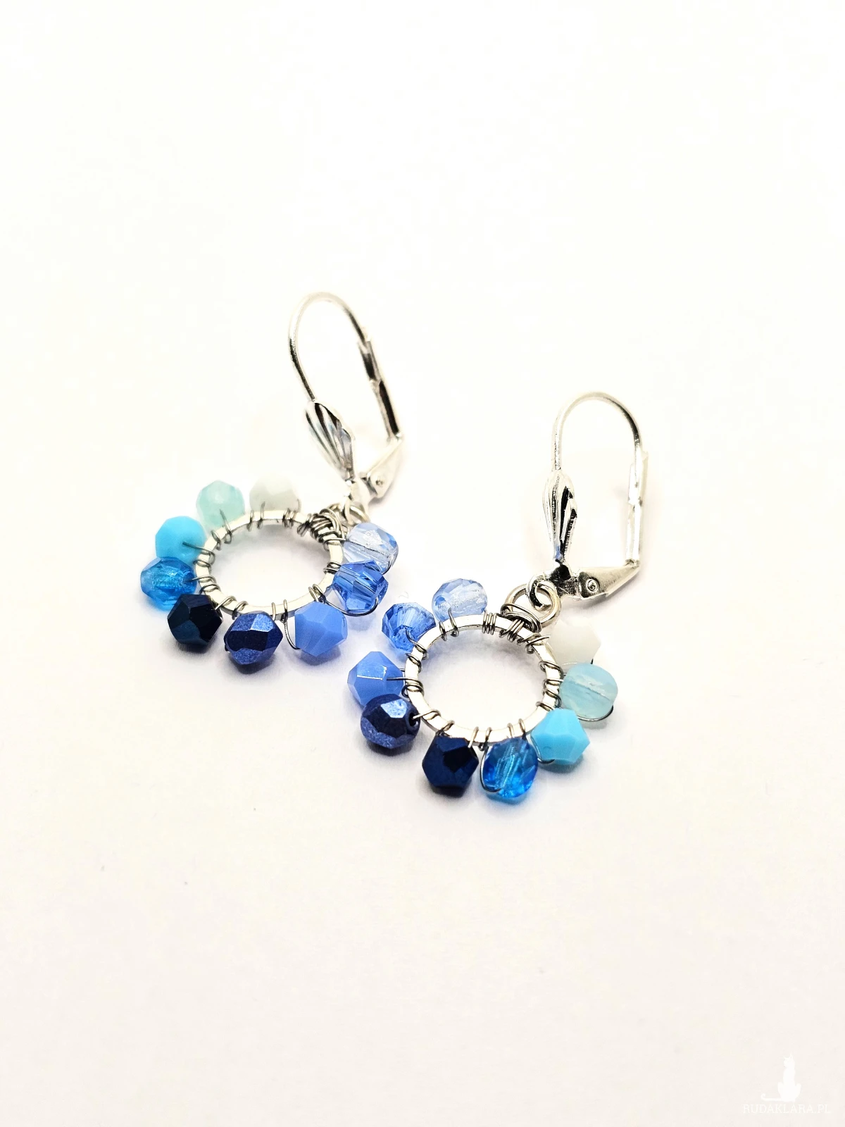 Wiszące kolczyki z szklanymi koralikami i kryształkami. Metalowa baza opleciona kolorowymi koralikami. Kolory w kolczykach: srebrny, biały, błękitny, niebieski. Kolczyki zawieszone na biglach angielskich w kolorze srebrnym.