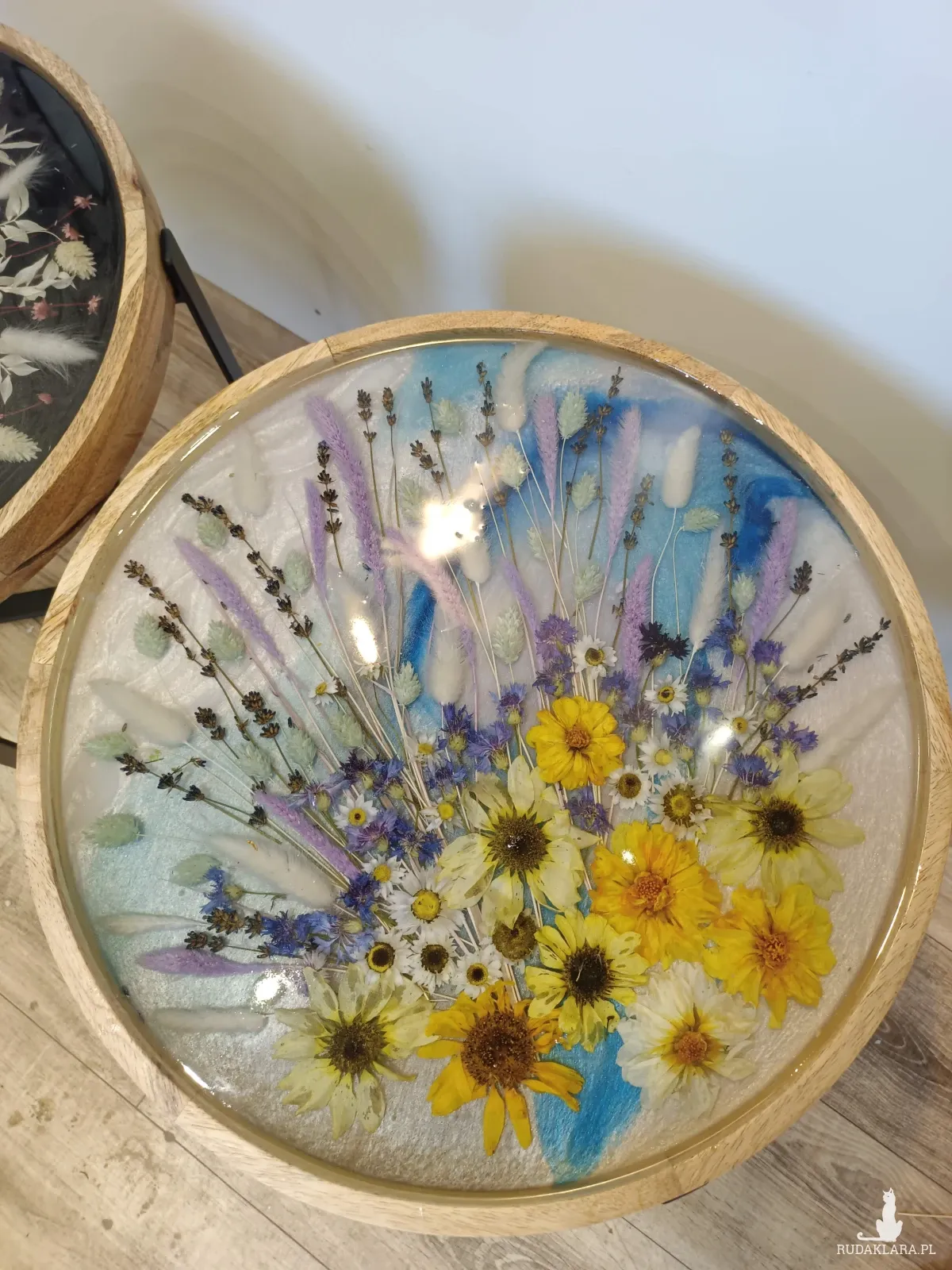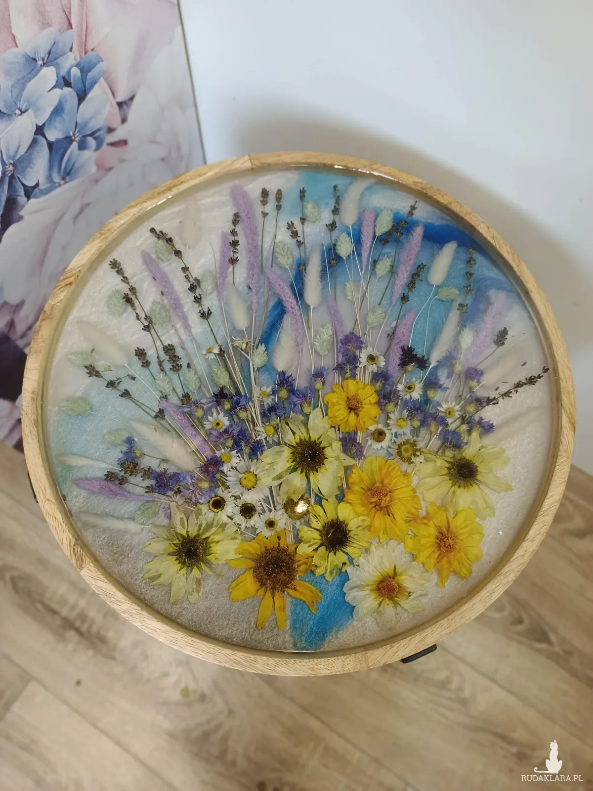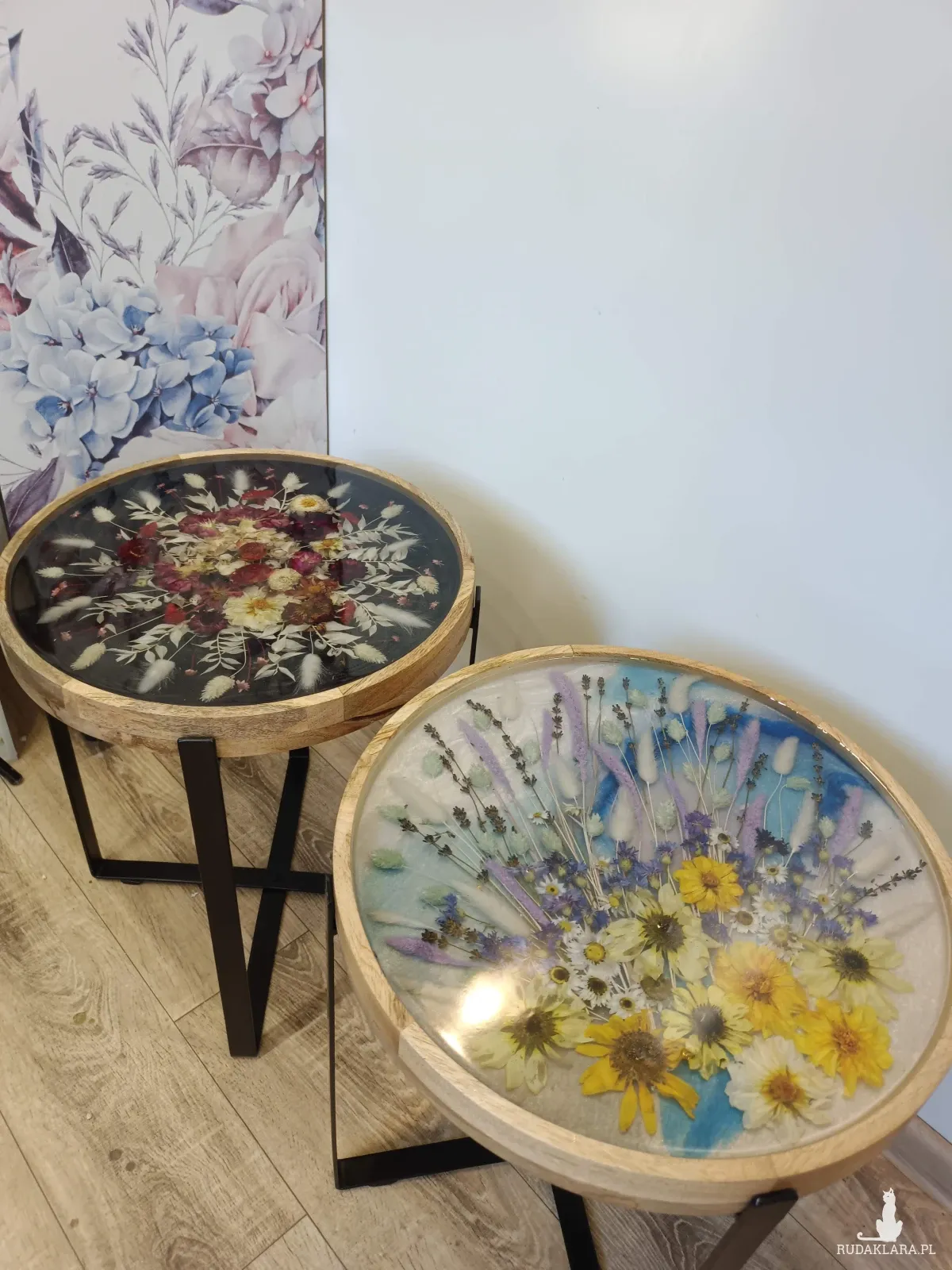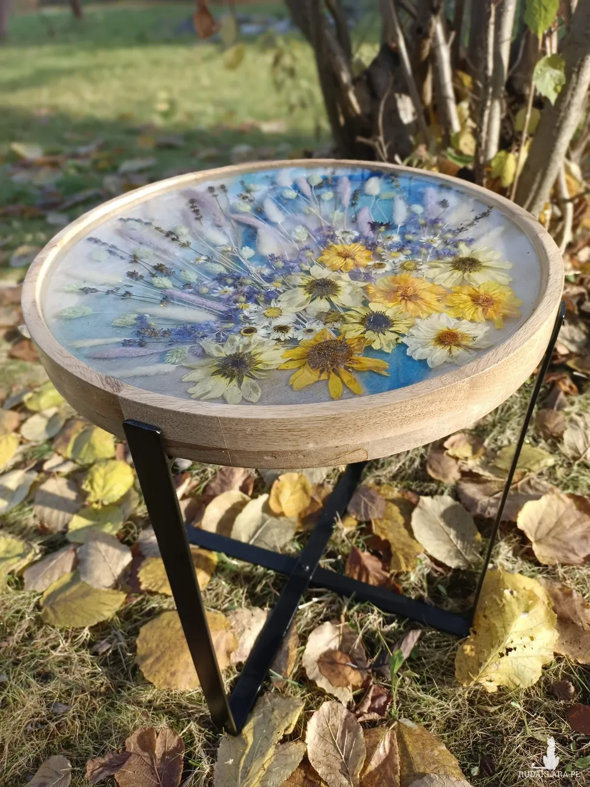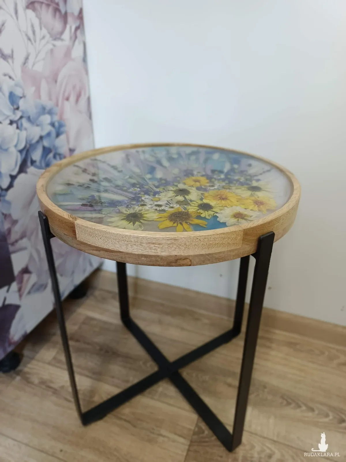 Elegancki stolik kawowy z drewnem i elementami metalowymi z kompozycją kwiatową zamkniętą w żywicy epoksydowej. . Jego klimat przenosi nas do letniego ogrodu. Stolik jest niewielkich rozmiarów, ale swoim wyglądem przyciąga wzrok i może być