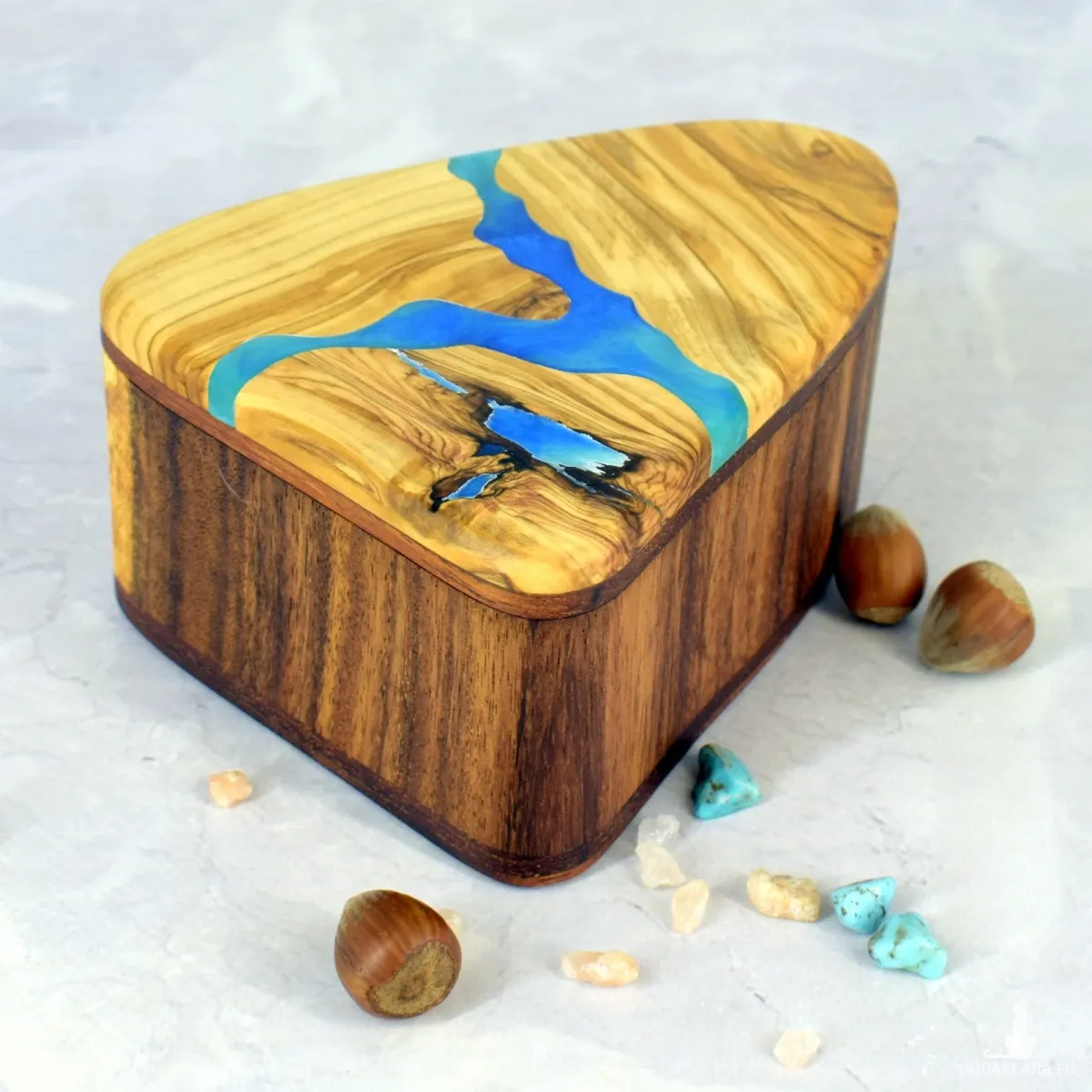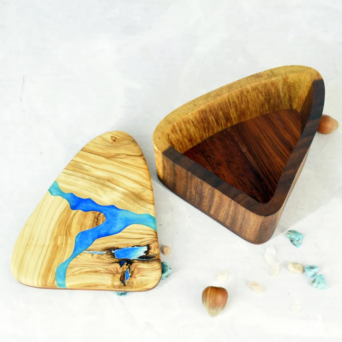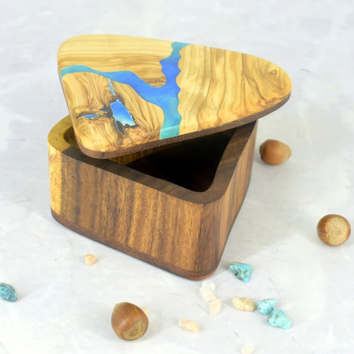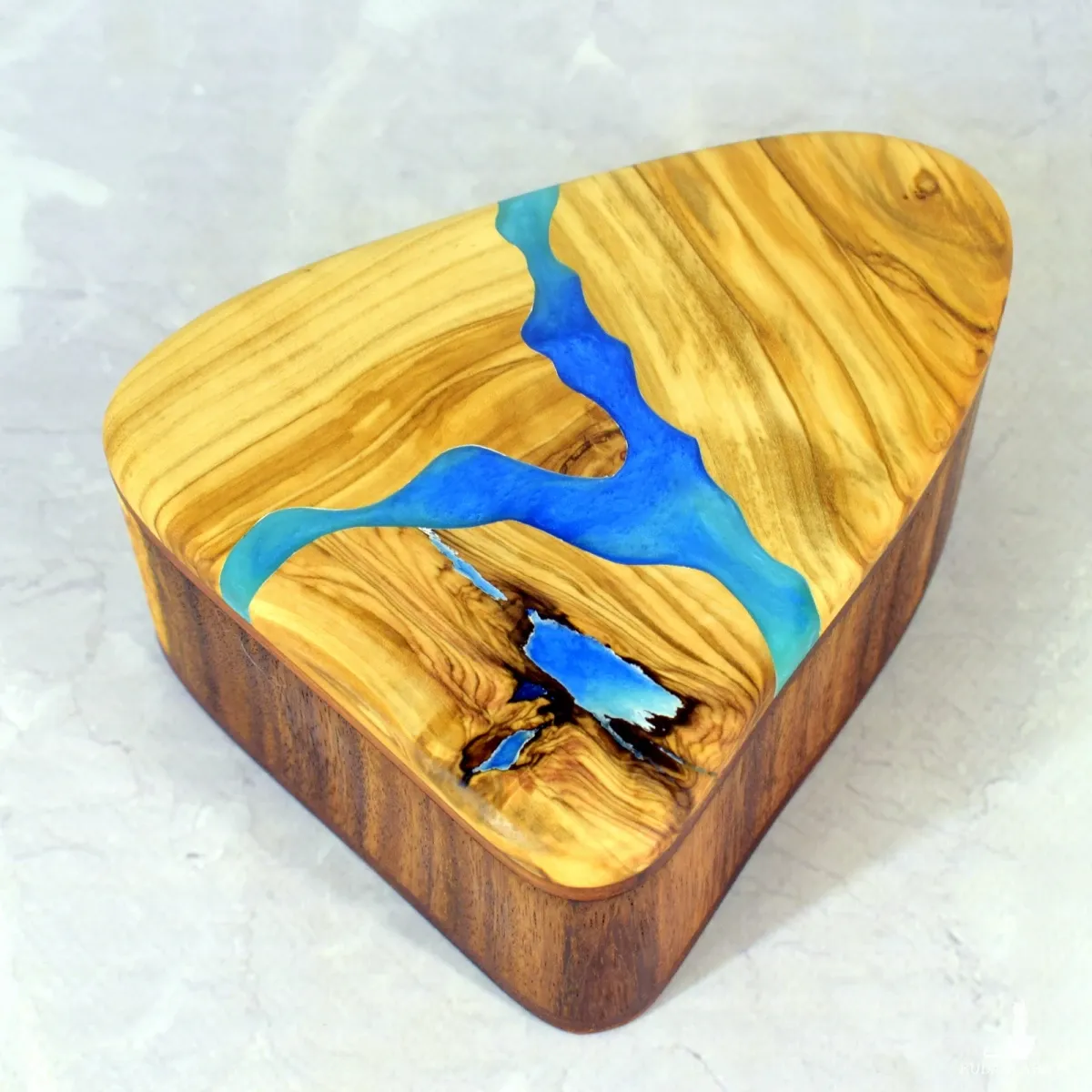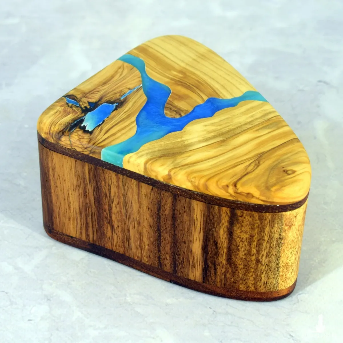 Ręcznie wykonana szkatułka z drewna oliwnego i suaru, ozdobiona akcentem z żywicy epoksydowej. Ciepłe odcienie miodu i karmelu pięknie kontrastują z połyskiem żywicy, tworząc elegancki i naturalny efekt.