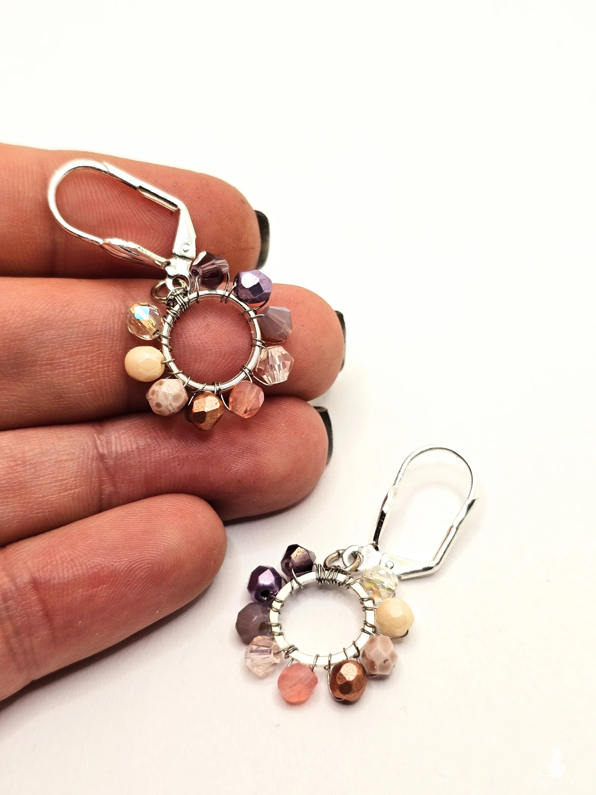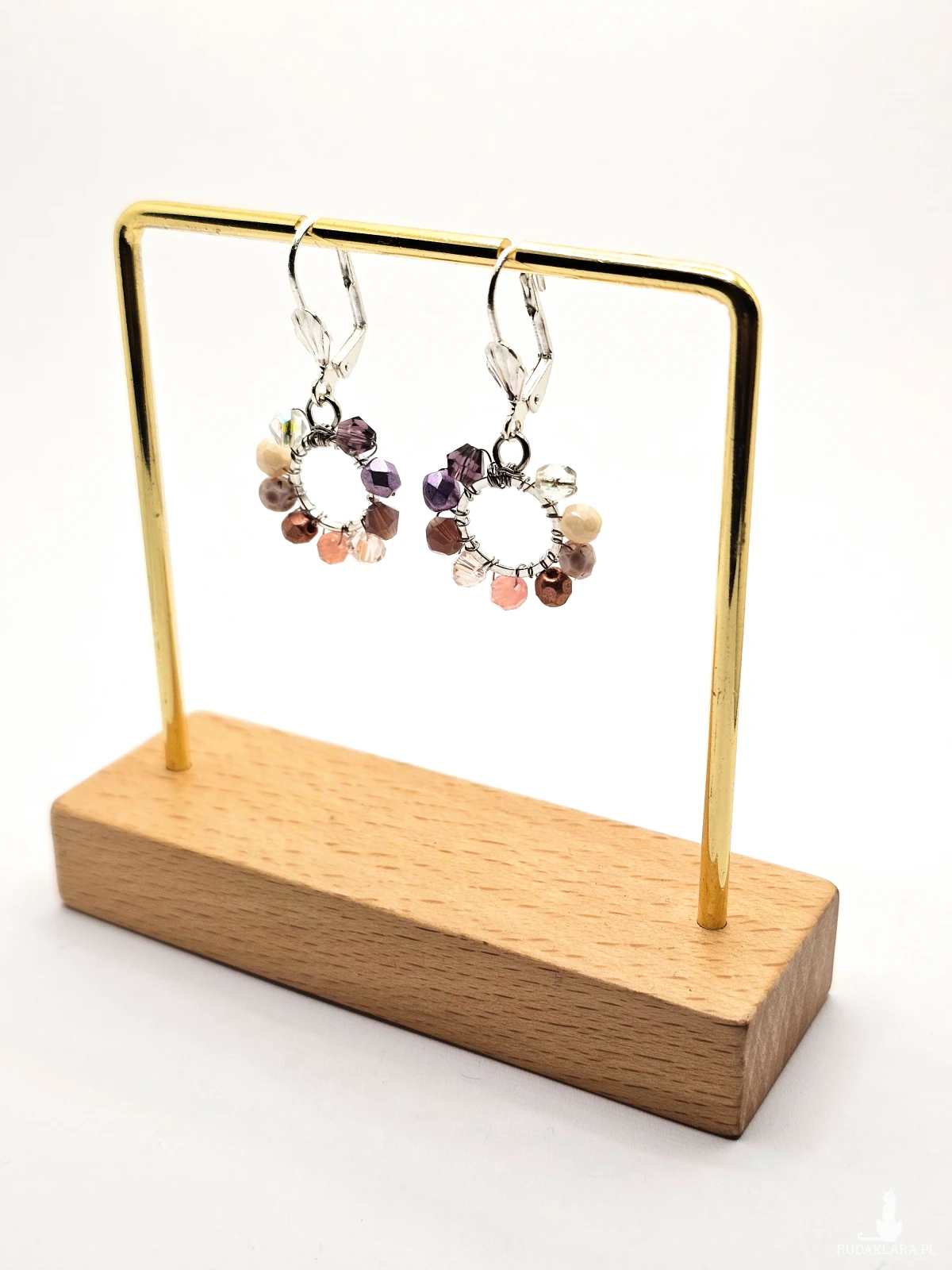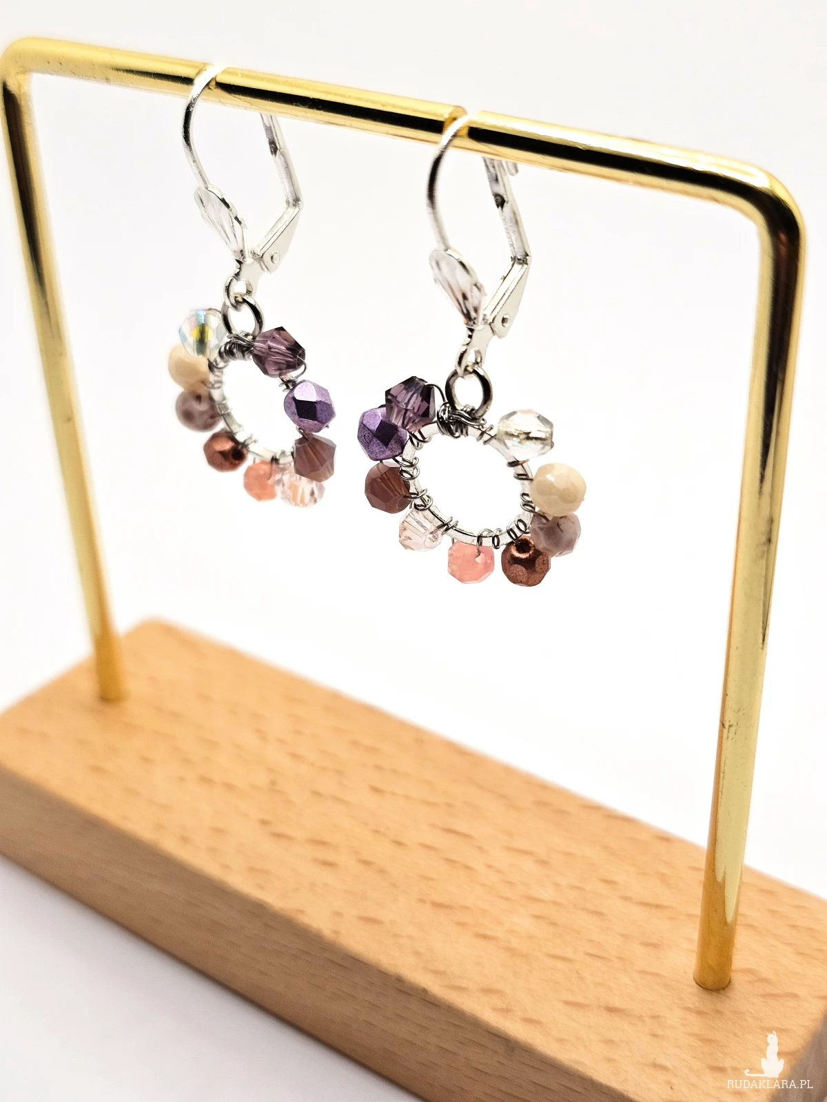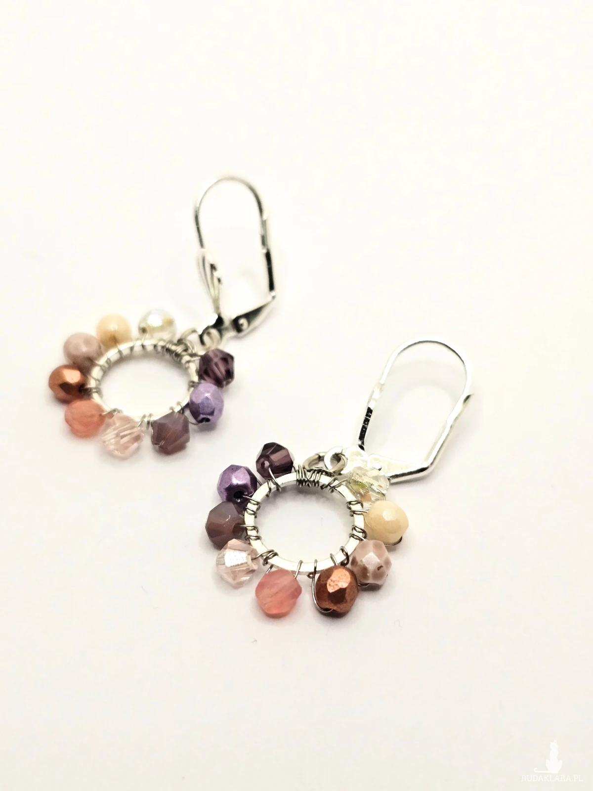 Wiszące kolczyki z szklanymi koralikami i kryształkami. Metalowa baza opleciona kolorowymi koralikami. Kolory w kolczykach: srebrny, fioletowy, różowy, miedziany, kremowy. Kolczyki zawieszone na biglach angielskich w kolorze srebrnym.
