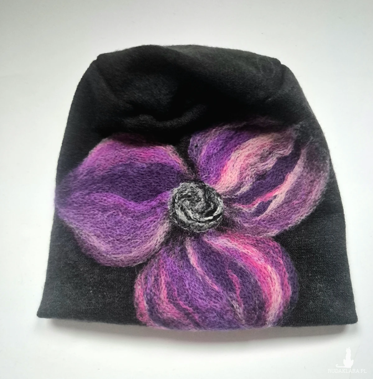 czapka  wełniana filcowana zimowa czarna   handmade w kwiaty na podszewce-- rozmiar uniwersalny, wełniana, filcowana wełną merynosów, bardzo ciepła, fantastyczna, miła, miękko układa się na głowie, niesamowicie zwraca uwagę, doskonałą na codzienne noszenie jak i na prezent, zawsze możesz ją założyć po basenie i przeżyjesz,box a1