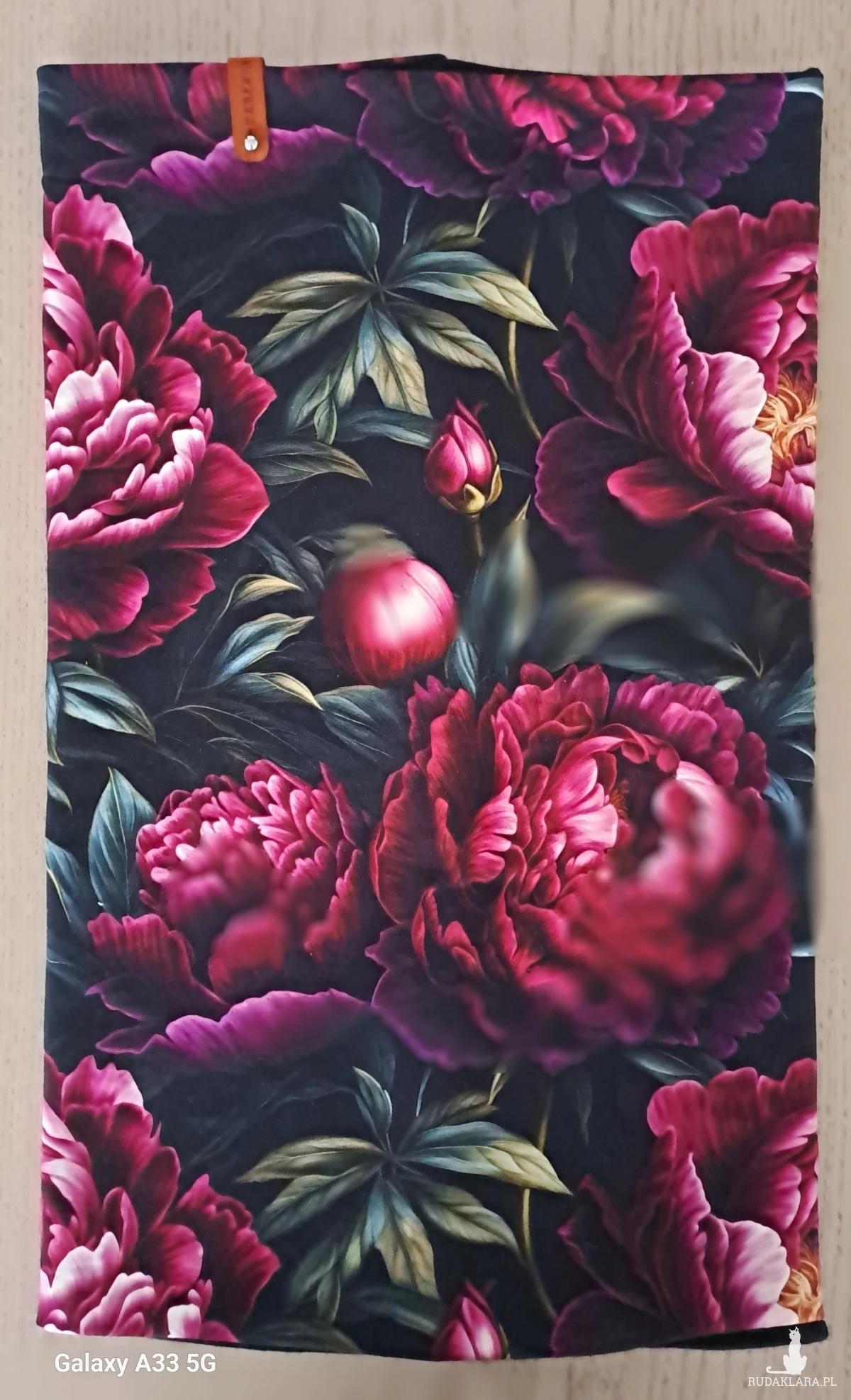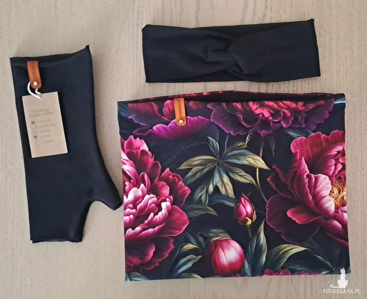 Ten piękny komplet jest uszyty z dresówki drapanej i wzorzystej dresówki pętelki. Komin na obwód 68cm i wysokość 52cm. Mitenki mają długość 28cm i obwód dłoni 18-19cm. Opaska ma wysokość 8,5cm oraz obwód 54-56cm.