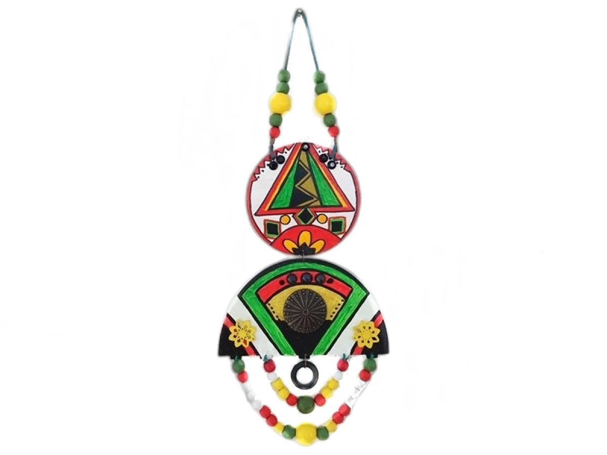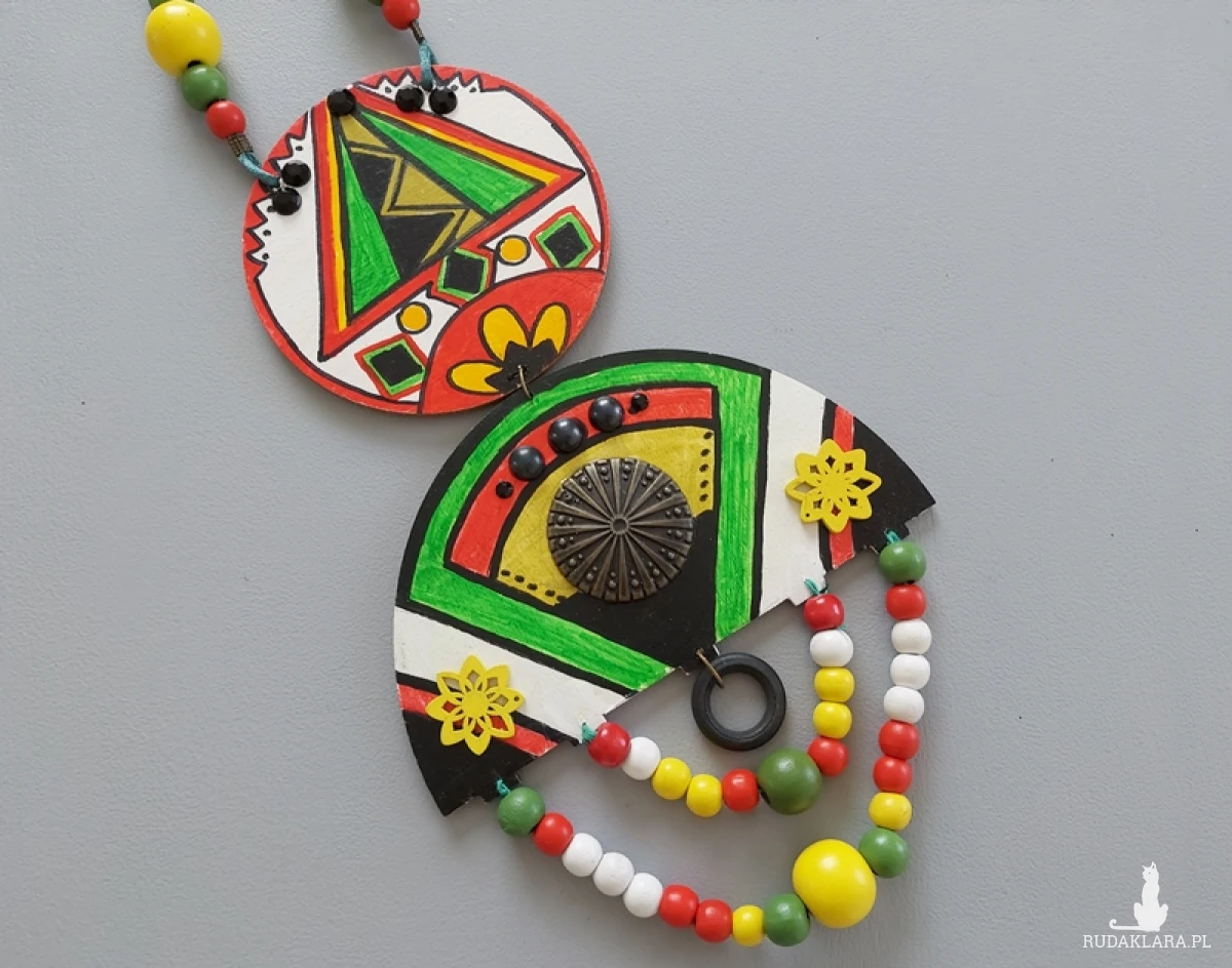 Wykonana z drewna i ręcznie malowana, łączy w sobie elementy artystyczne i naturalne, a całość uzupełniają drewniane koraliki oraz ozdobne elementy biżuteryjne.