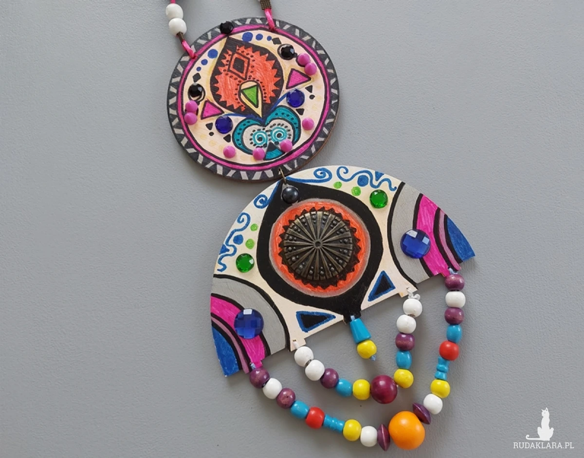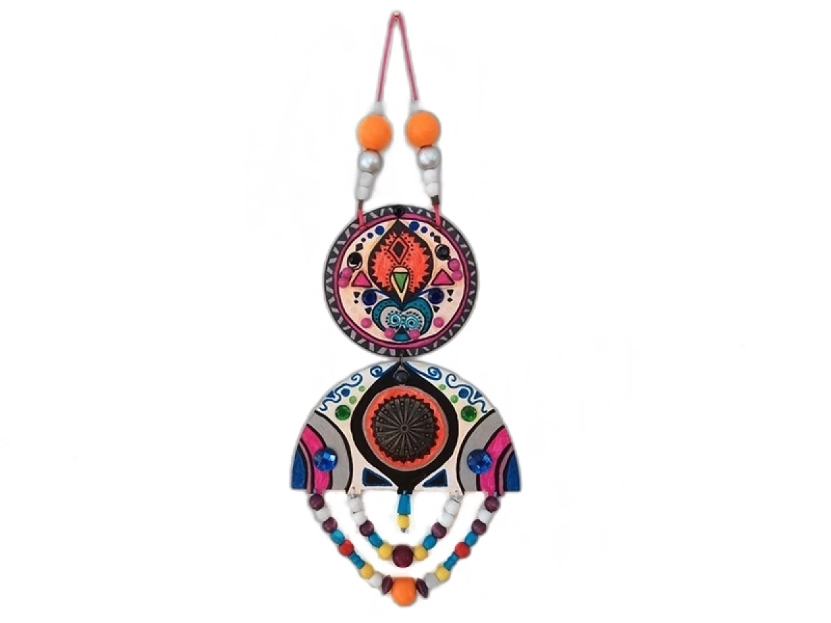 Ta efektowna, inspirowana orientalnym stylem zawieszka jest unikatowym egzemplarzem. Składa się z ręcznie malowanych elementów drewnianych, uzupełnionych drewnianymi koralikami i ozdobionych dekoracyjnymi aplikacjami jubilerskimi.