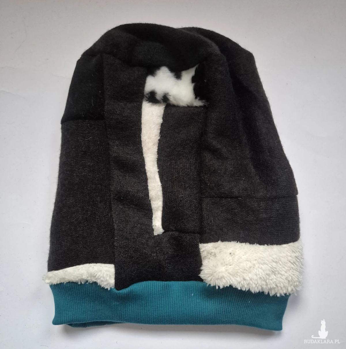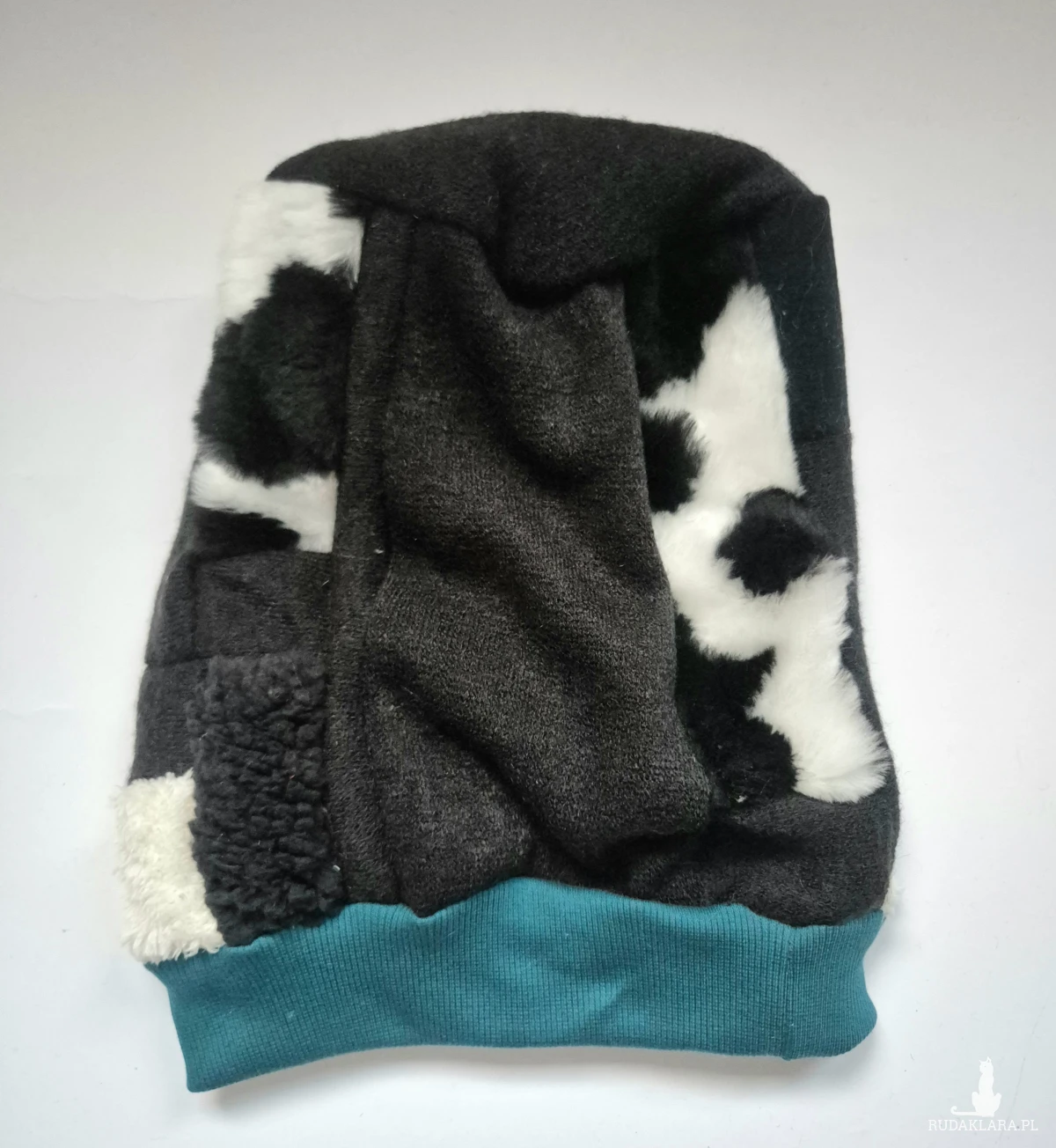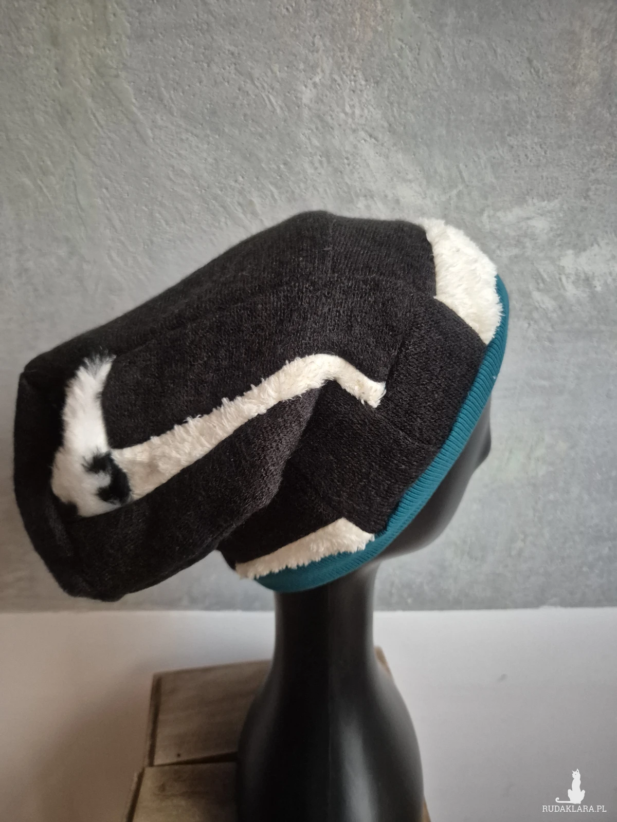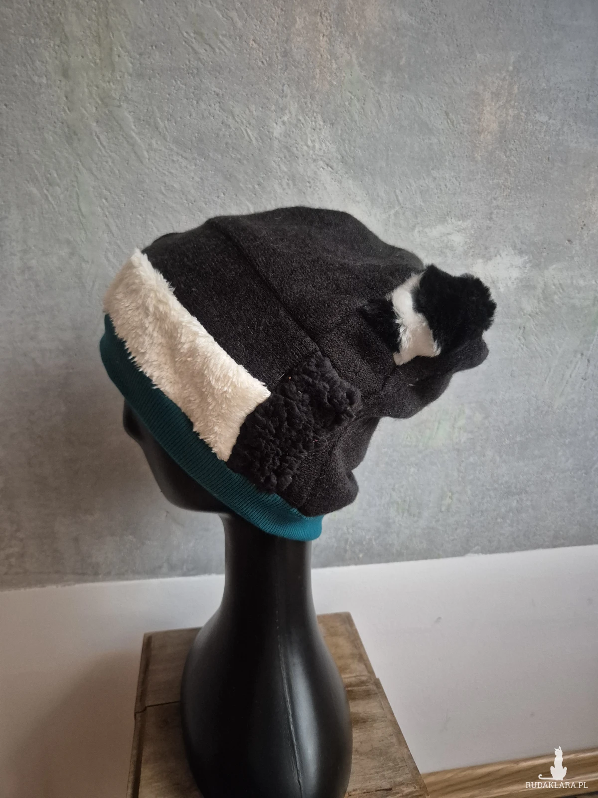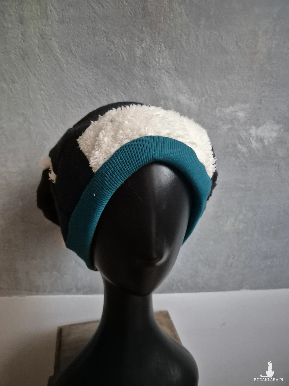Czapka z elementami sztucznego futerka szyte patchworkowo na podszewce rozmiar uniwersalny Smerfetka z turkusowym ściągaczem polecam świetna ciepła Box A1