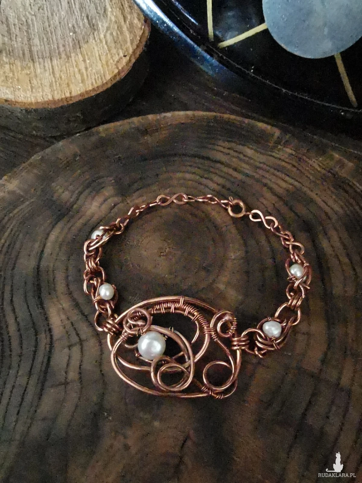 Bransoletka miedziana z naturalnymi perłami. Szerokość w najszerszym miejscu: 2,6cm, całkowita długość 19cm (ze względu na przedłużkę będzie pasować na nadgarstek 15-18,5cm)