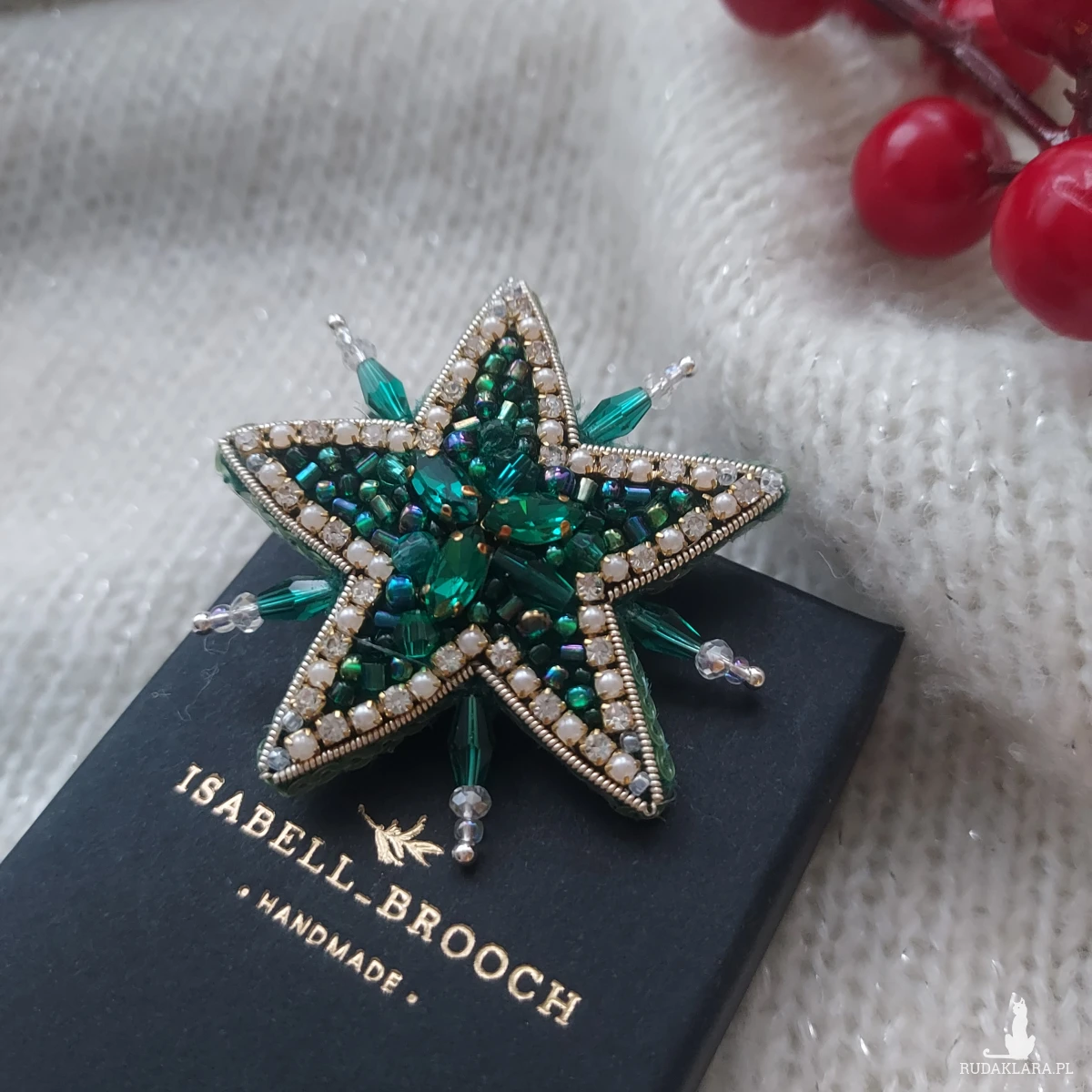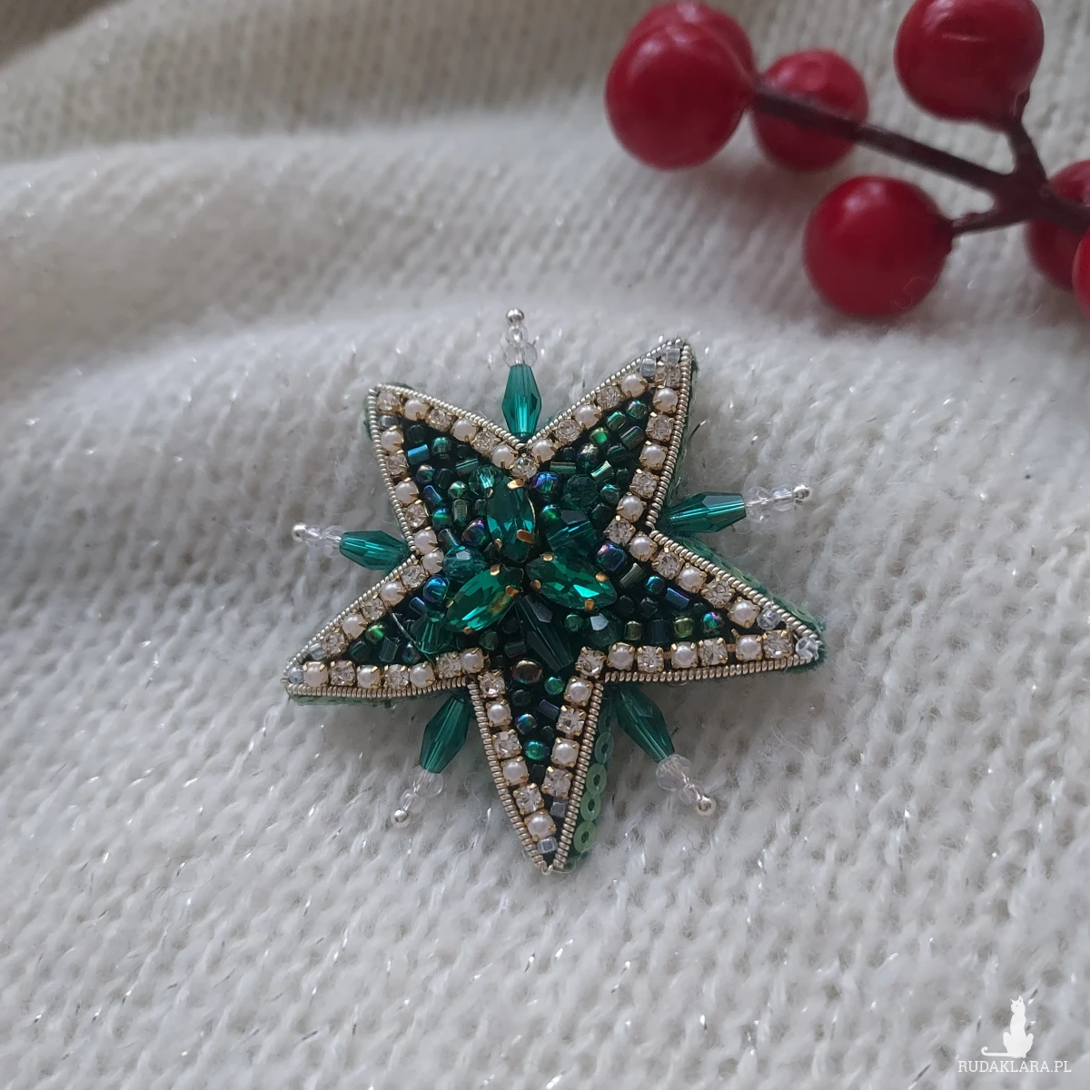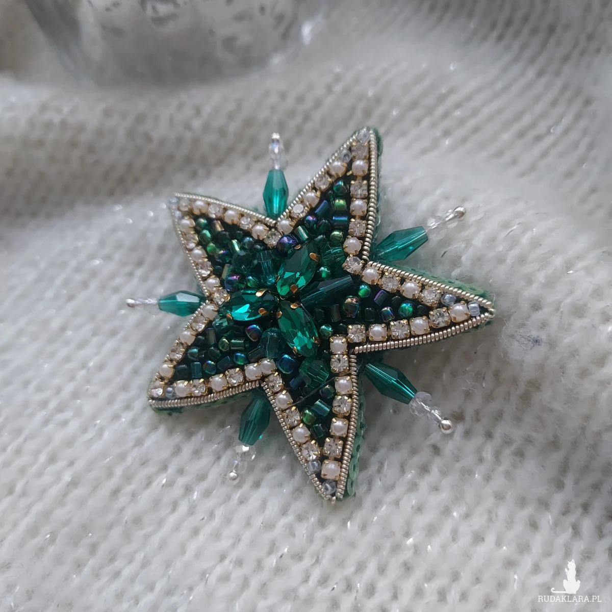 Broszka szmaragdowo-srebrna gwiazda - wykonana techniką haftu koralikowego. Zdobiona taśmą cyrkoniową doda niebanalnego wyrazu i blasku zarówno codziennym, jak i eleganckim, wieczorowym kreacjom.