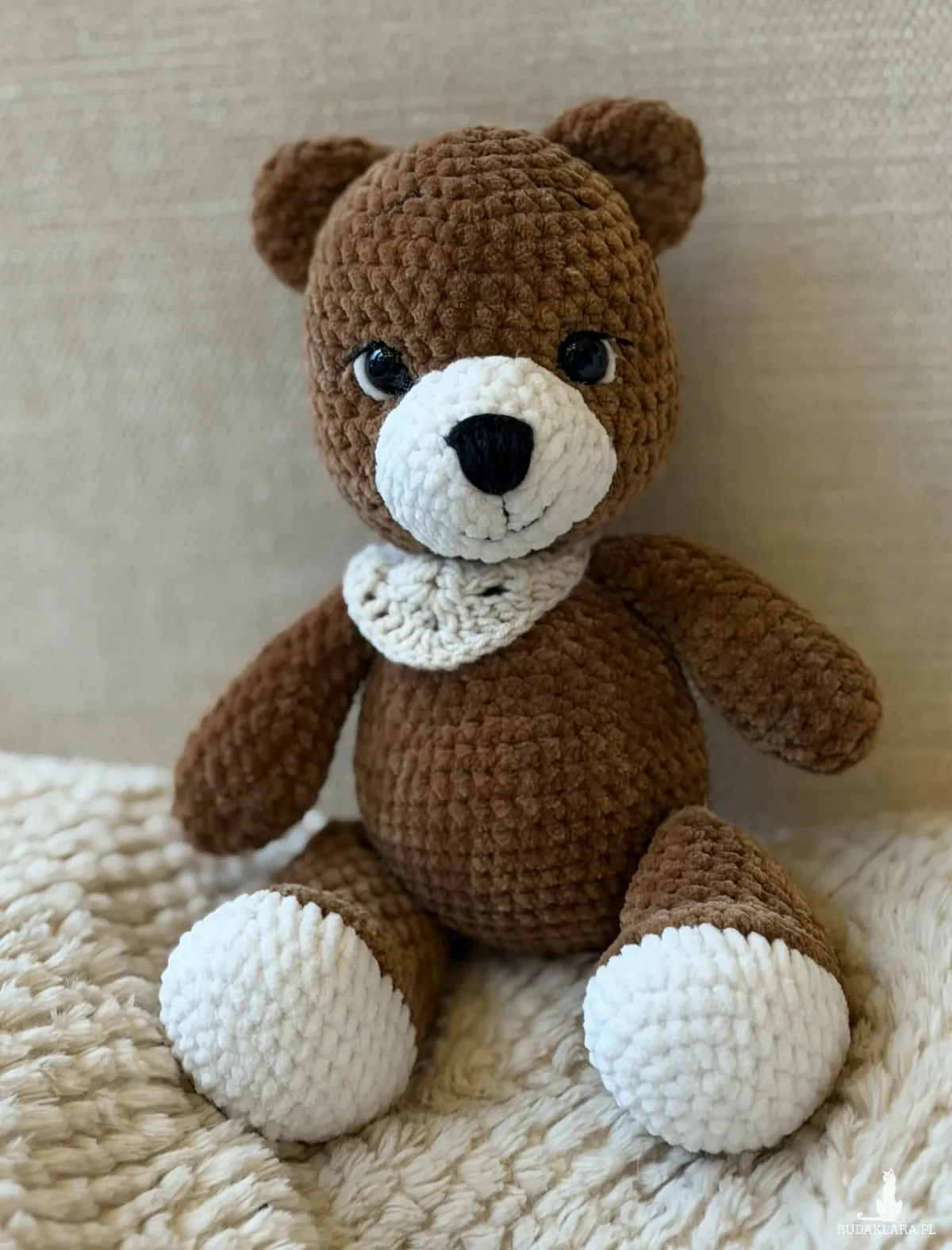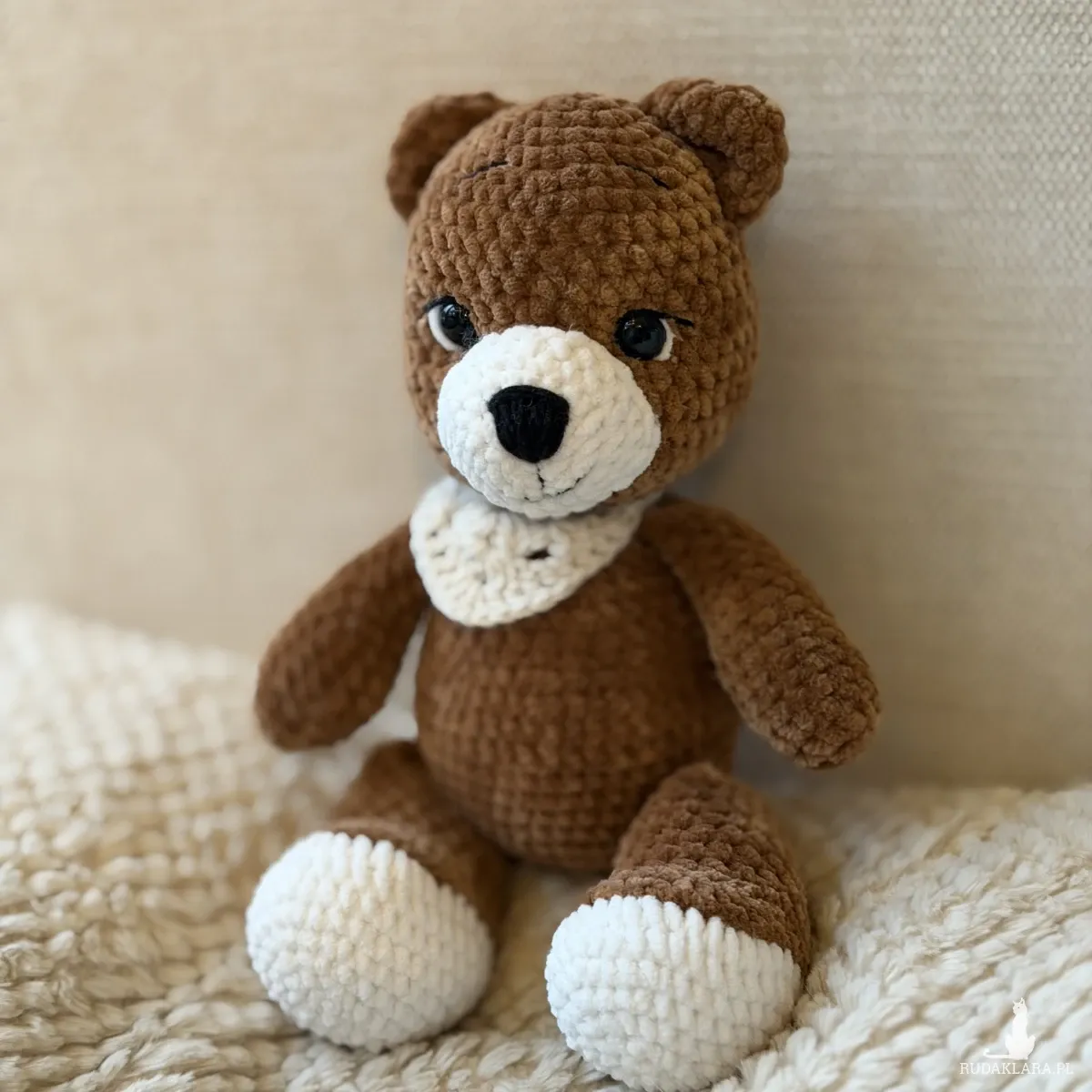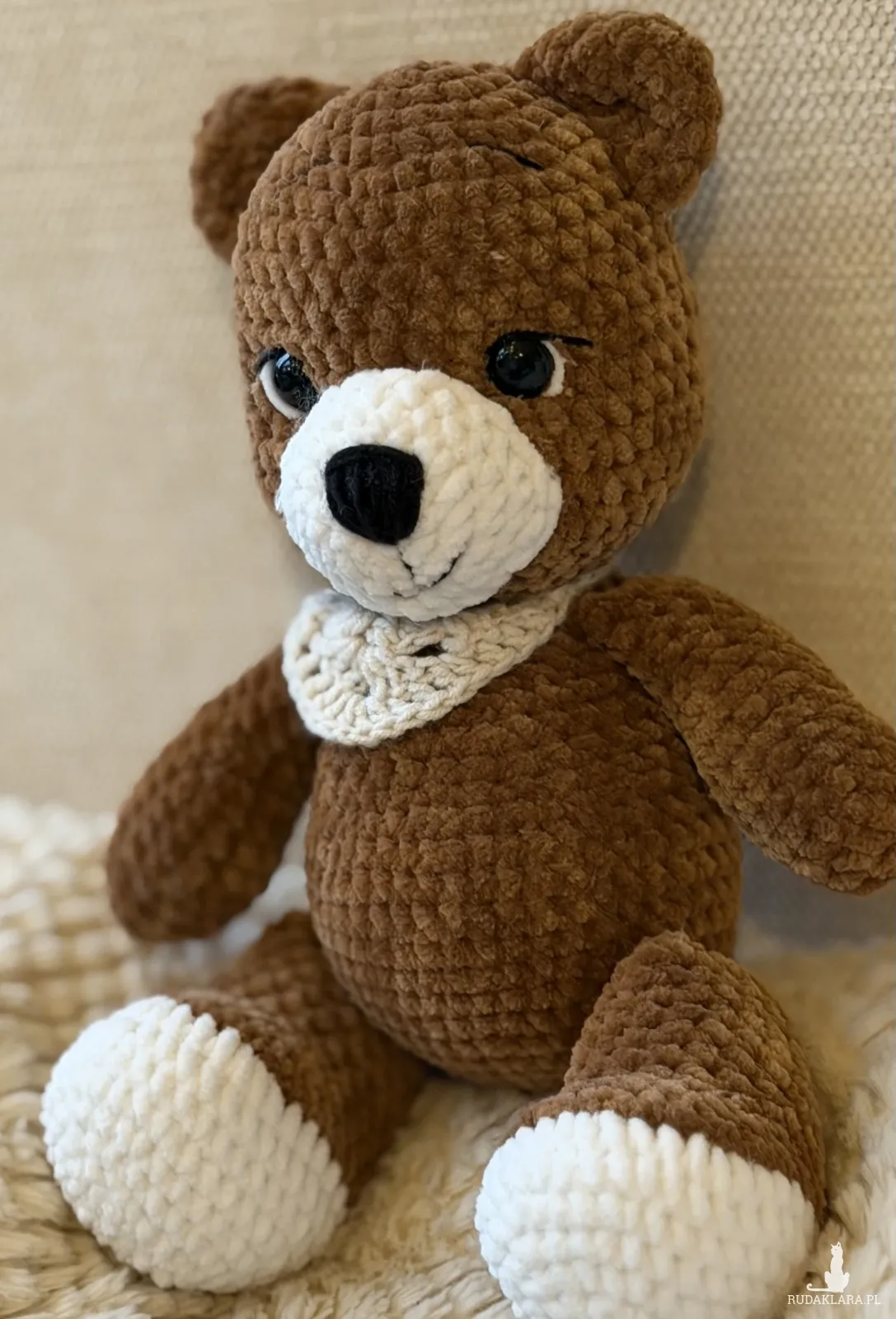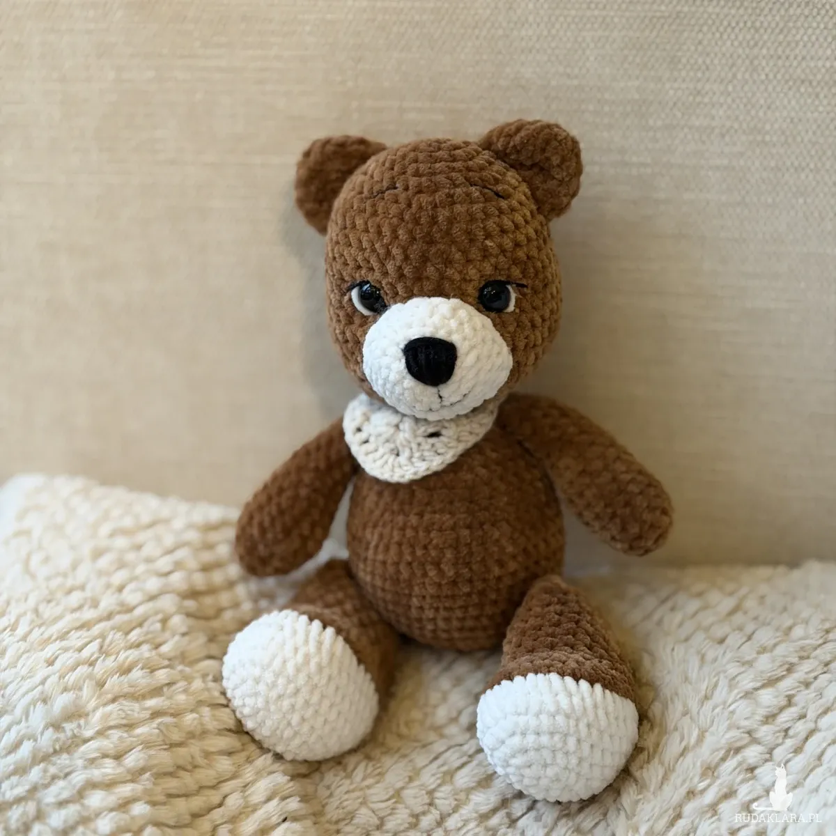 Uroczy miś wykonany ręcznie na szydełku z miękkiej, pluszowej włóczki w ciepłym brązowym kolorze. Apaszka również robiona na szydełku dodaje mu wyjątkowego, przytulnego charakteru. Idealny do przytulania oraz jako dekoracja pokoju.