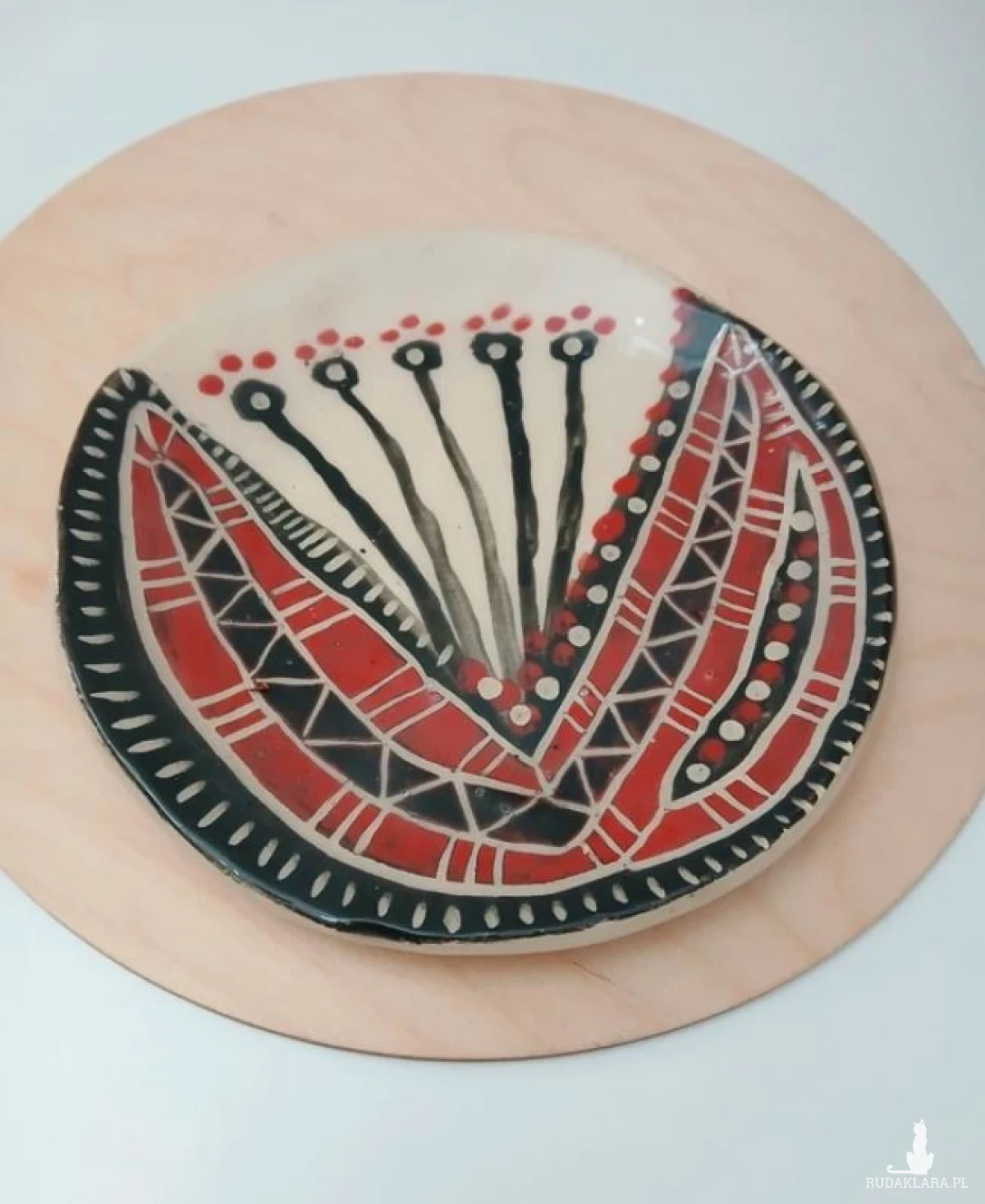 Ręcznie robiony talerz dekoracyjny świąteczny ozdobny talerzyk, podstawka, paterka średnica 16cm Talerzyk gliniany, ceramiczna podstawka, naczynie z gliny dekorowanej angobami metodą sgrafitto. Transparentne szkliwo. Można myć w zmywarce. Wypalany w piecu ceramicznym 1080°c Rustykalny folk folklor aztecki meksykański cottagecore