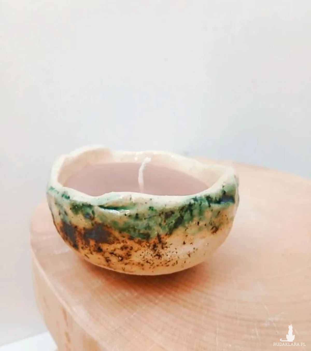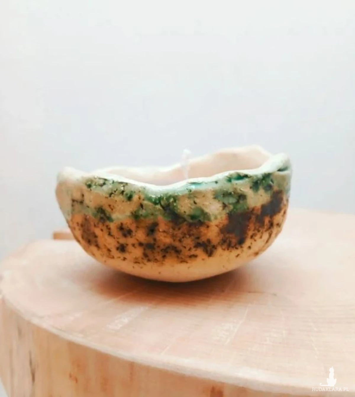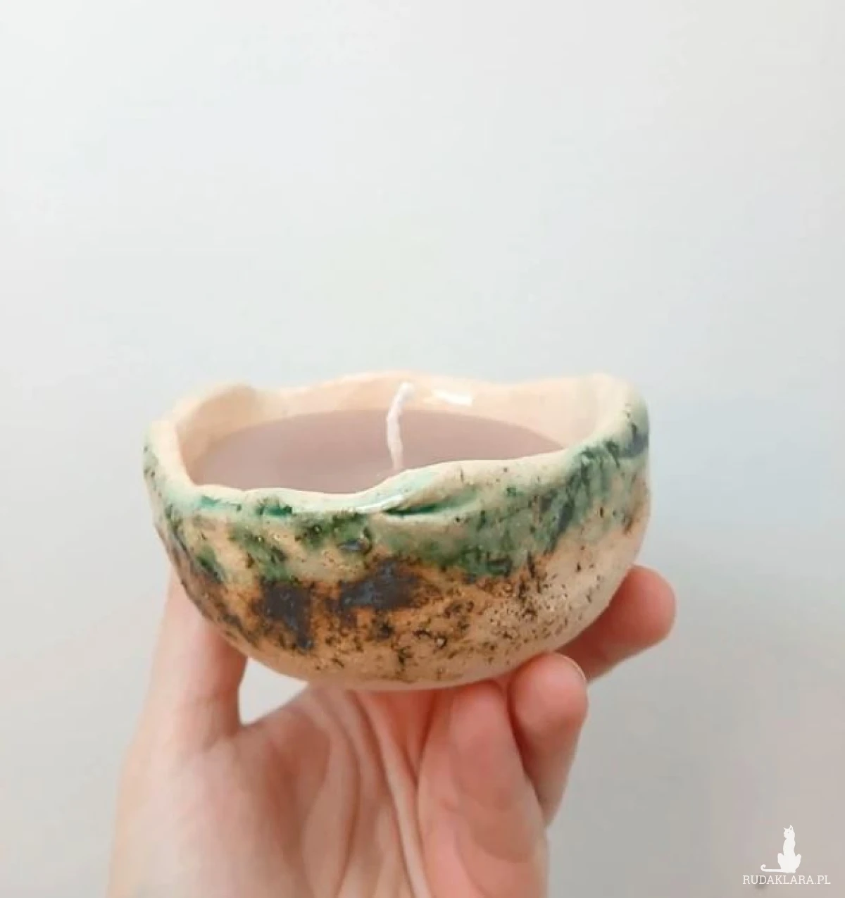 Świeczka w recznie robionej glinianej misce, artystyczny ceramiczny lampion, świeczka w ceramicznym naczyniu. Pomysł na prezent. Świeca bezzapachowa, nietoksyczna, sojowa. Miseczka 8cm srednicy, 5cm wysokości. Zapakowana w celofan z kokardą. Naturalna, organiczna forma surowa glina świeca ekologiczna wegańska rzemieślnicza rękodzieło galeria sztuki sztuka użytkowa folk
