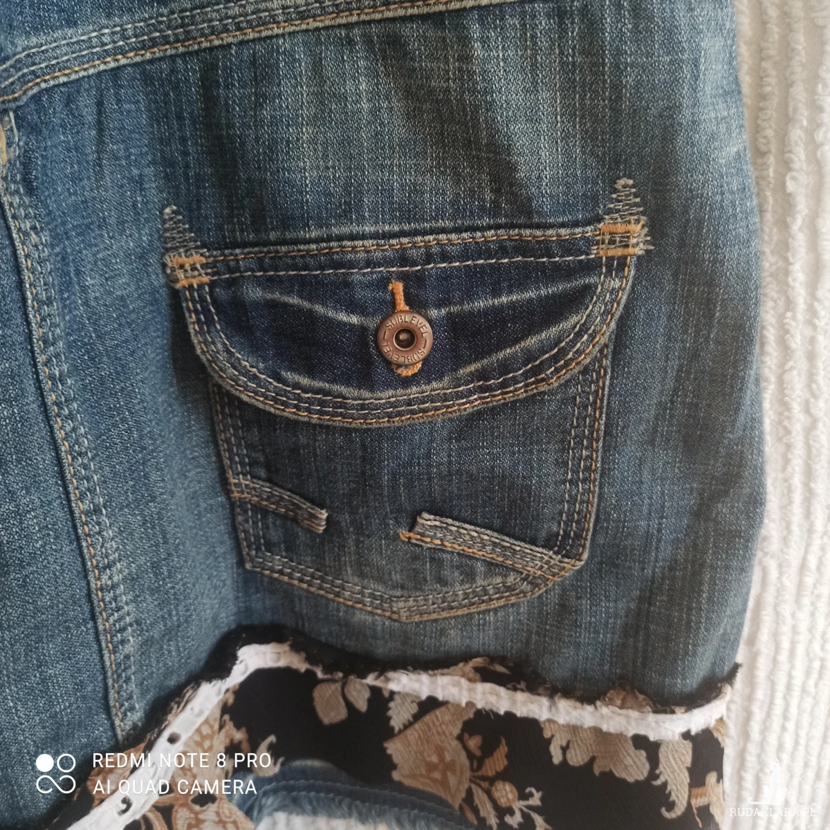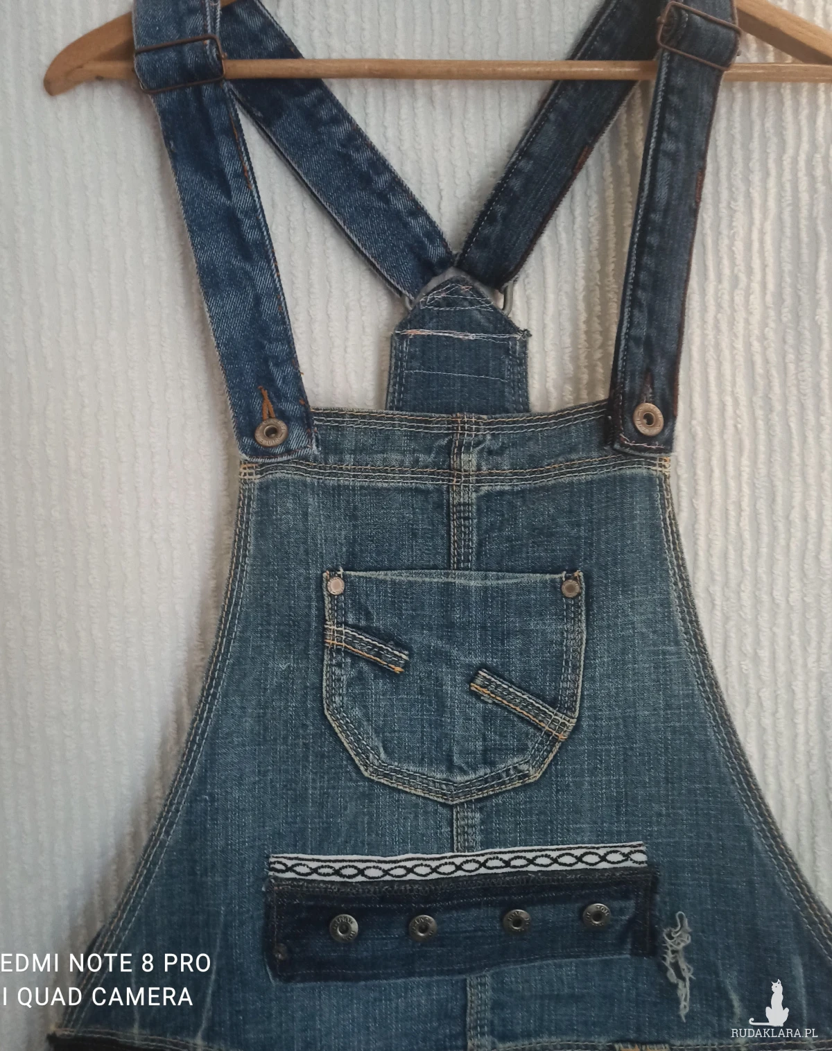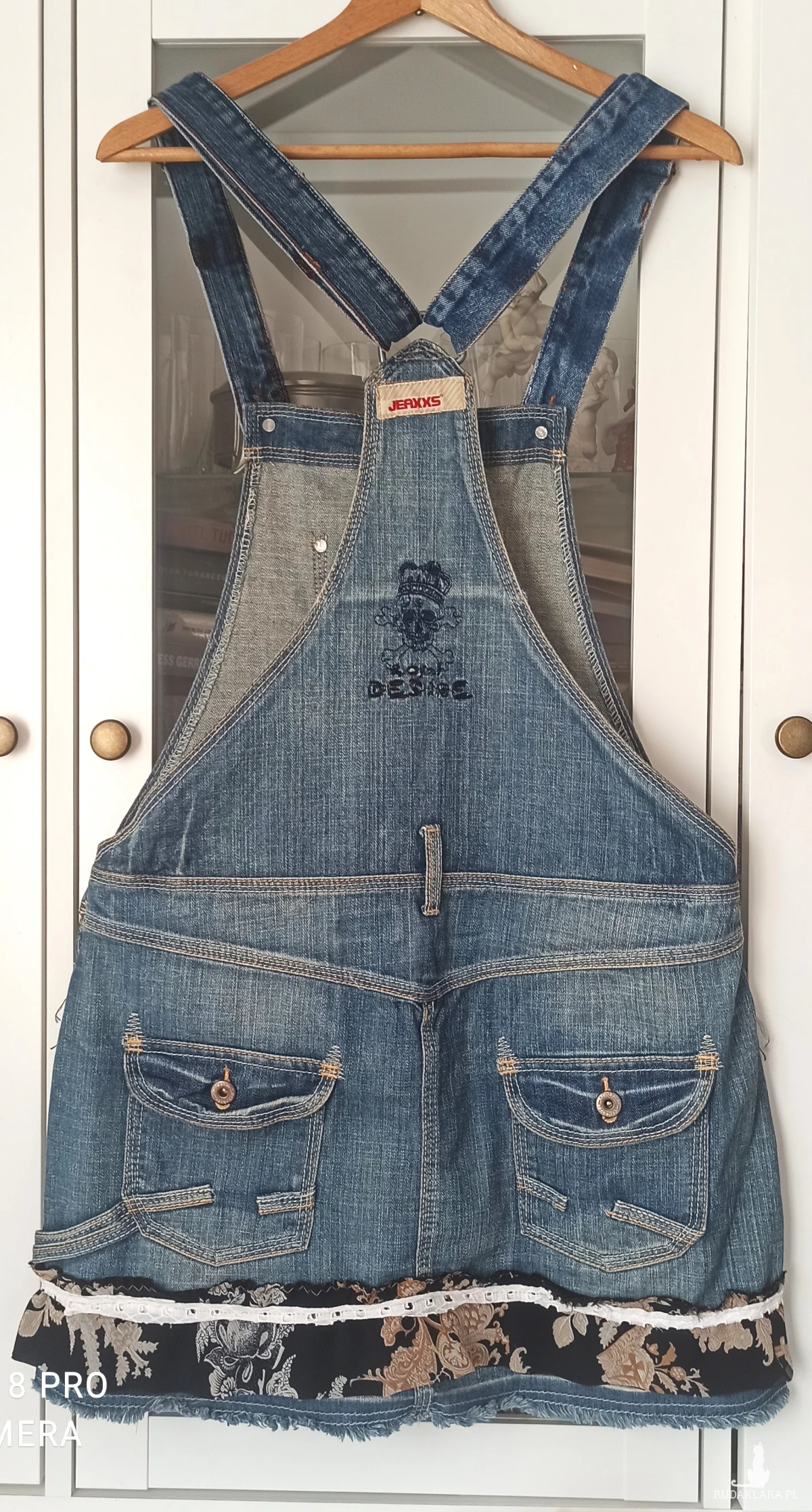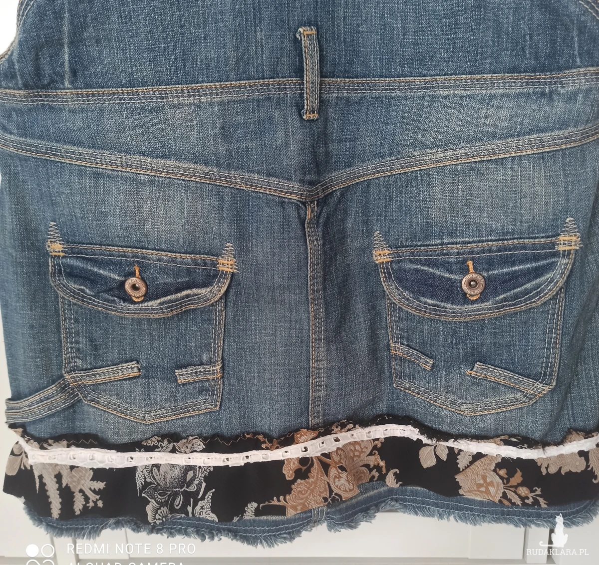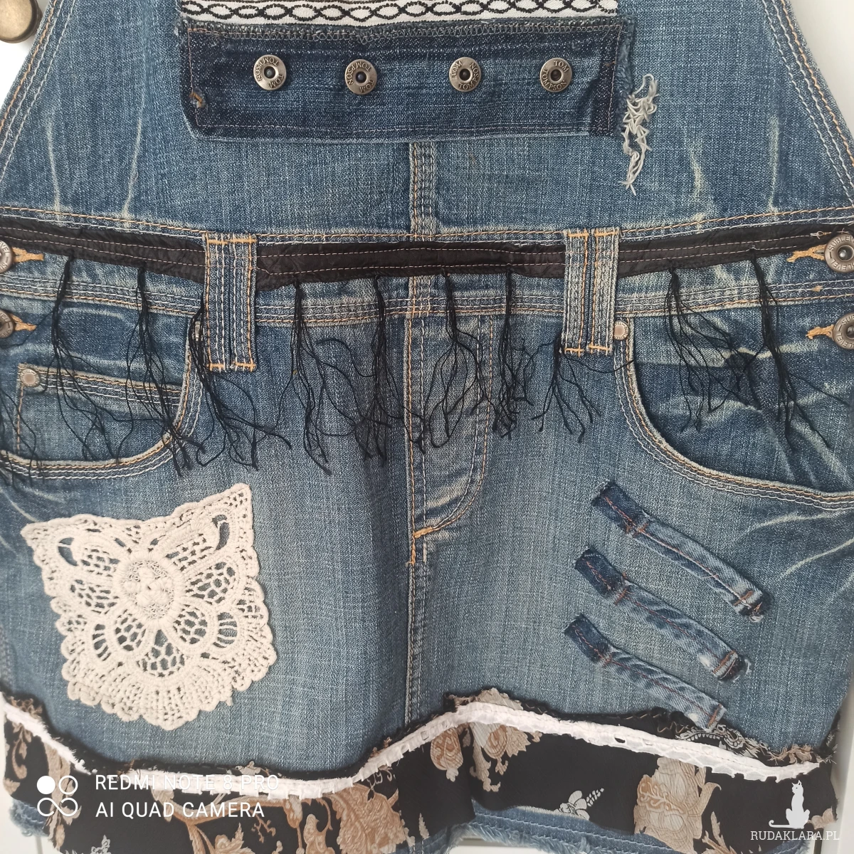 Oryginalna spódnica streetwear, moda rycyklingowa. Mini na szelkach,wykonana z niebieskiego denimu dla kobiet lubiących oryginalne i nietuzinkowe ubrania. Jedyna w swoim rodzaju, która przyciąga wzrok. U dołu falbanka z lekkiej żorżetowej kolorowej tkaniny w kwiaty przymocowana białą taśmą. Przód z czarnymi frędzlami w pasie, koronka i elementy denimu z guzikami. Z przodu 4 kieszenie, z tyłu dwie . Wszystkie kieszonki dekoracyjnie zdobione szwami. Zapinana na dwa guziki po obu stronach. Szelki regulowane, można dostosować do swoich wymagań. Elementy zdobień ręcznie wykonane, idealny dla osób, które lubią wyrażać swój styl. Dzięki takiemu zestawieniu spódni cmca tworzy odważny, a zarazem kobiecy look. Starannie wykonana spódnica, gotowa znaleźć się w Twojej garderobie. Jest lekka i wygodna. Denim pochodzi z recyklingu, dzięki czemu zyskuje nowe życie. Można prać.