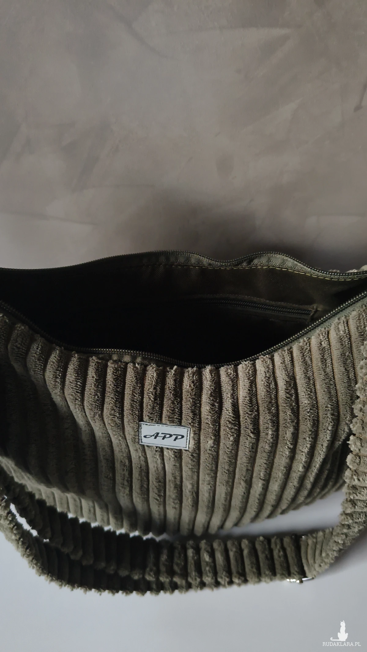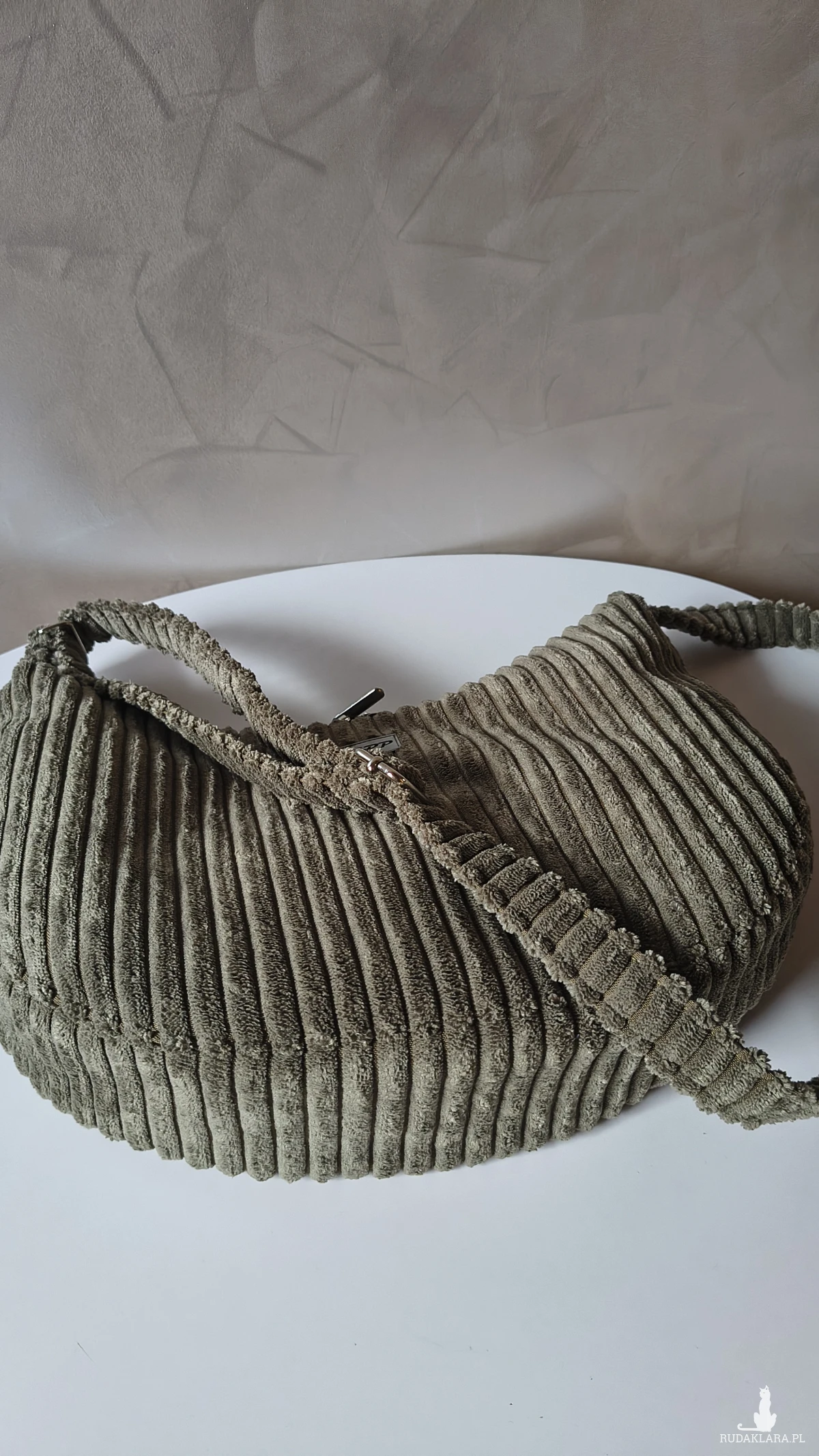 Powstała że sztruksu tapicerskiego, co gwarantuje jej wytrzymałość i długie użytkowanie. Wewnątrz znajduje się wodoodporna podszewka z kieszonką na zamek. Pasek regulowany również wykonany ze sztruksu, a więc delikatny dla naszego ciała. Torbę można nosić na ramieniu lub przez ramię. Okucia srebrne, niklowane.