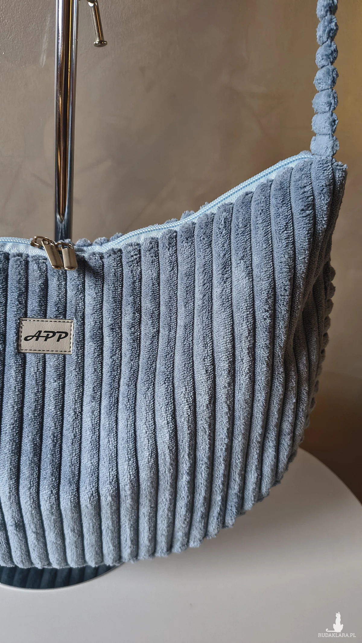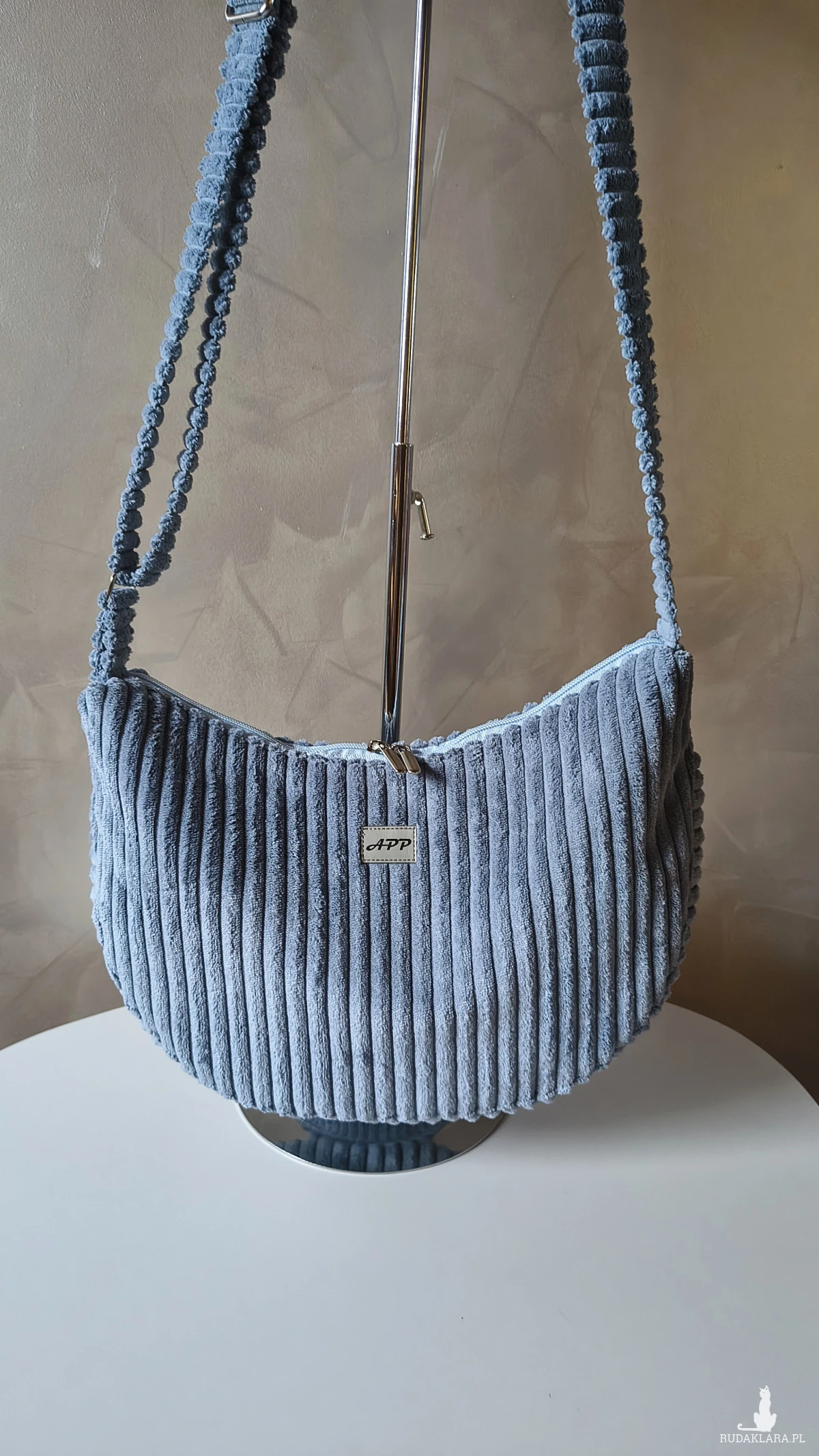 Powstała że sztruksu tapicerskiego, co gwarantuje jej wytrzymałość i długie użytkowanie. Wewnątrz znajduje się wodoodporna podszewka z kieszonką na zamek. Pasek regulowany również wykonany ze sztruksu, a więc delikatny dla naszego ciała. Torbę można nosić na ramieniu lub przez ramię. Okucia srebrne, niklowane.