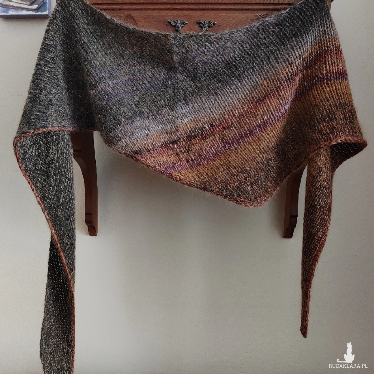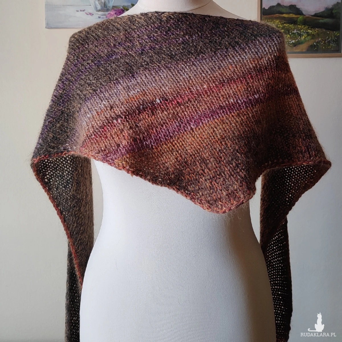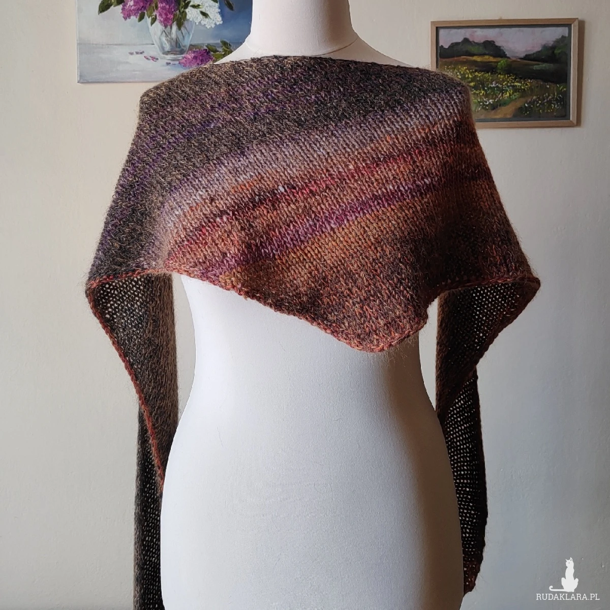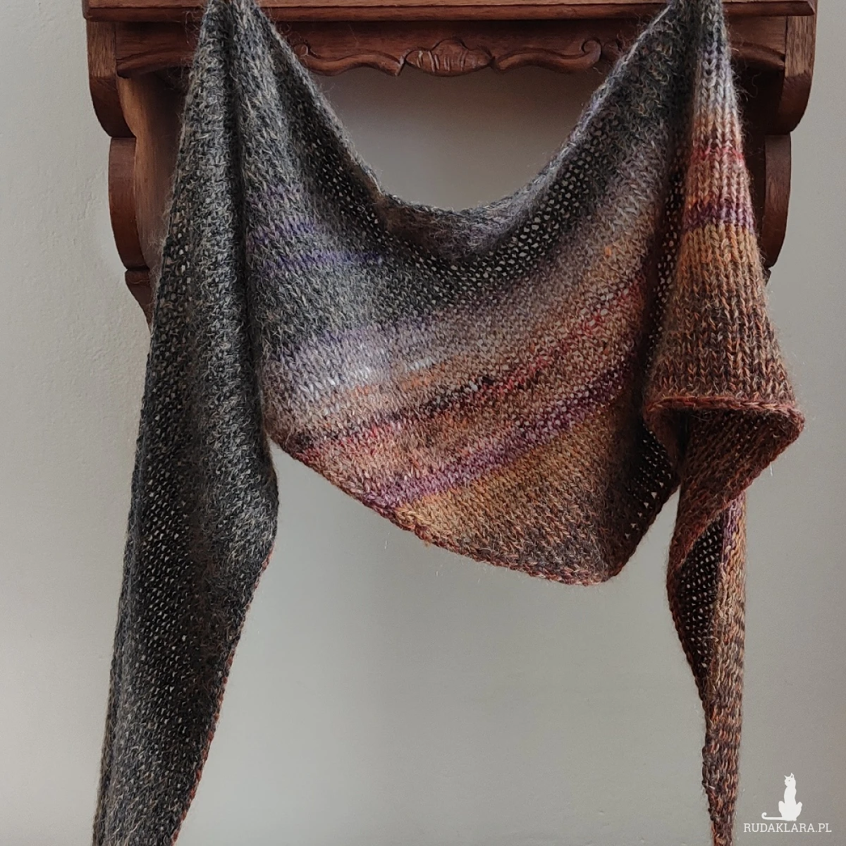 Miły, puchaty, mięsisty, lejący szal lub asymetryczna chusta, wykonana ręcznie na drutach potrójną nitką z doskonałych włóczek (w tym wyjątkowej, kultowej włóczki japońskiej firmy Noro), kanadyjskiego, szlachetnego jedwabiu z moherem i wełenki 100% merino. Łączny skład włóczek to: jedwab, moher, wełenka merino i minimalna ilość poliamidu. Niestety zdjęcia nie oddają piękna kolorów ich gradientów i uroku włóczek. Chusta/szal jest twarzowa, ciepła i pasuje do wielu stylizacji. Wymiary: długość 216 cm., w najszerszym miejscu 35 cm. Na cenę chusty ma wpływ cena włóczek. Pranie wyłącznie ręczne.