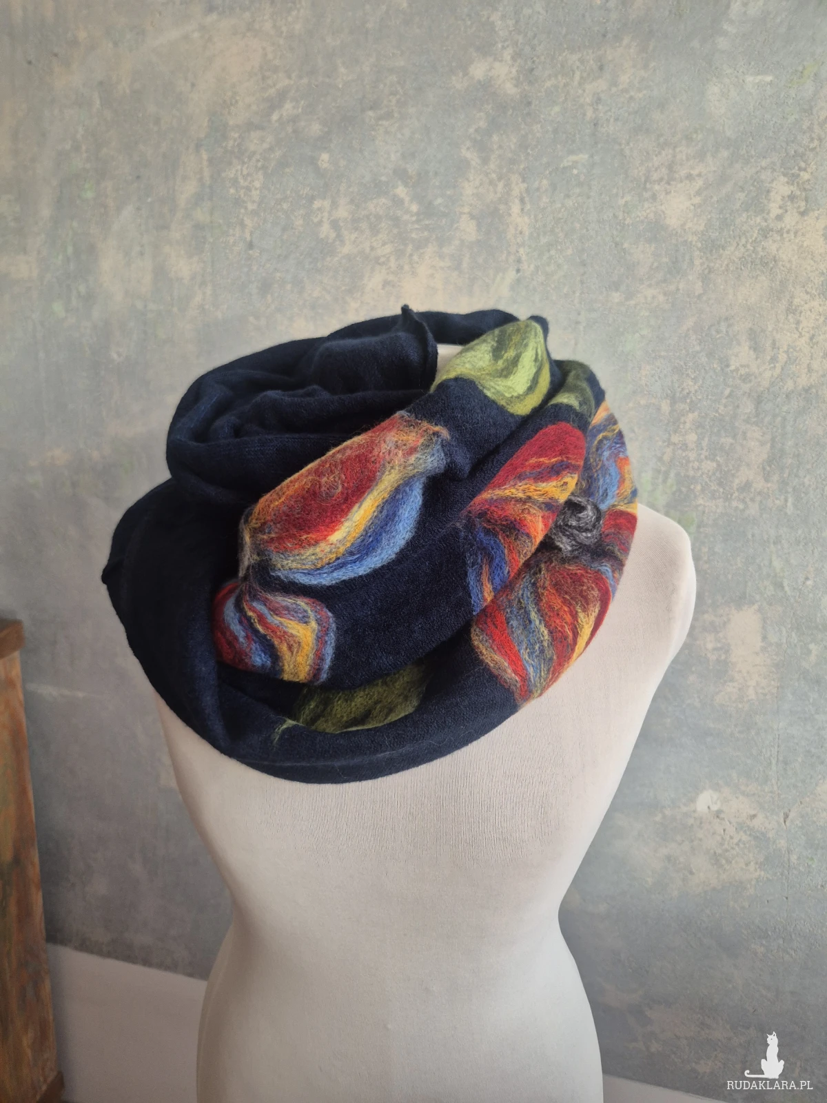 Komin wełniany granatowy ostatni bez powtórek filcowany wełniany miły i ciepły komin handmade, owijany dwa razy, filcowany wełną merynosów, bardzo ciepły i miły, doskonały na prezent, fantastyczny na codzienne noszenie, zwraca uwagę, dodaje koloru, nie zginiesz w tym kominie na ulicy, pojedyncze egzemplarze, polecam bestseller,box 01