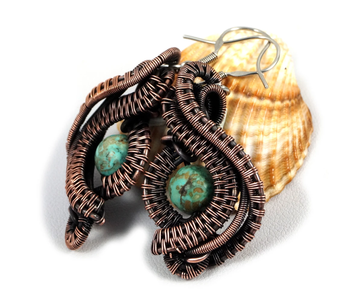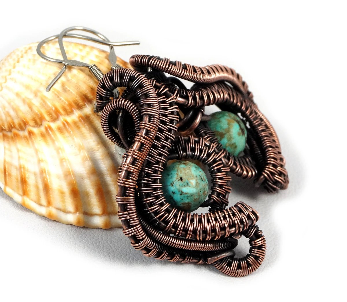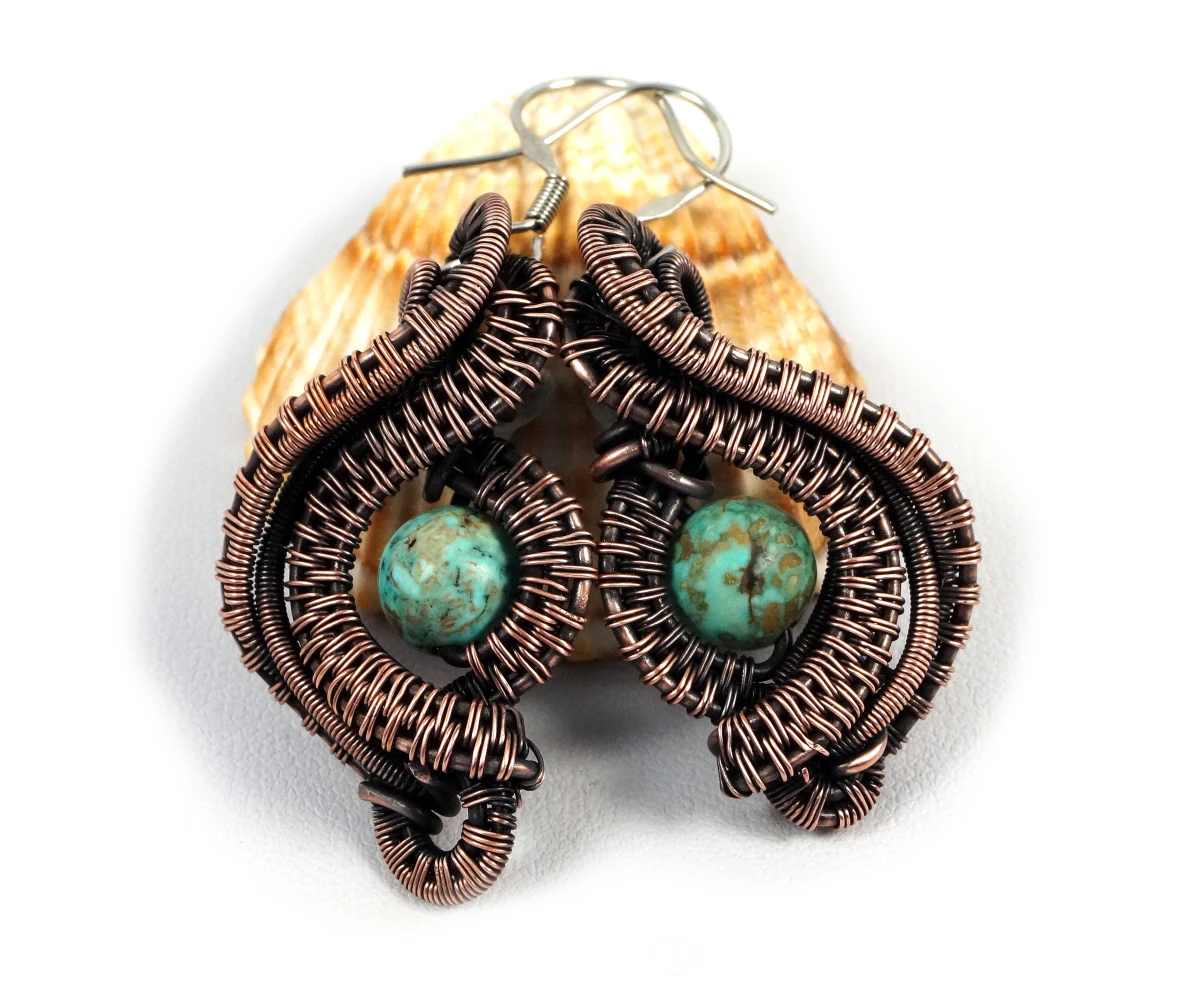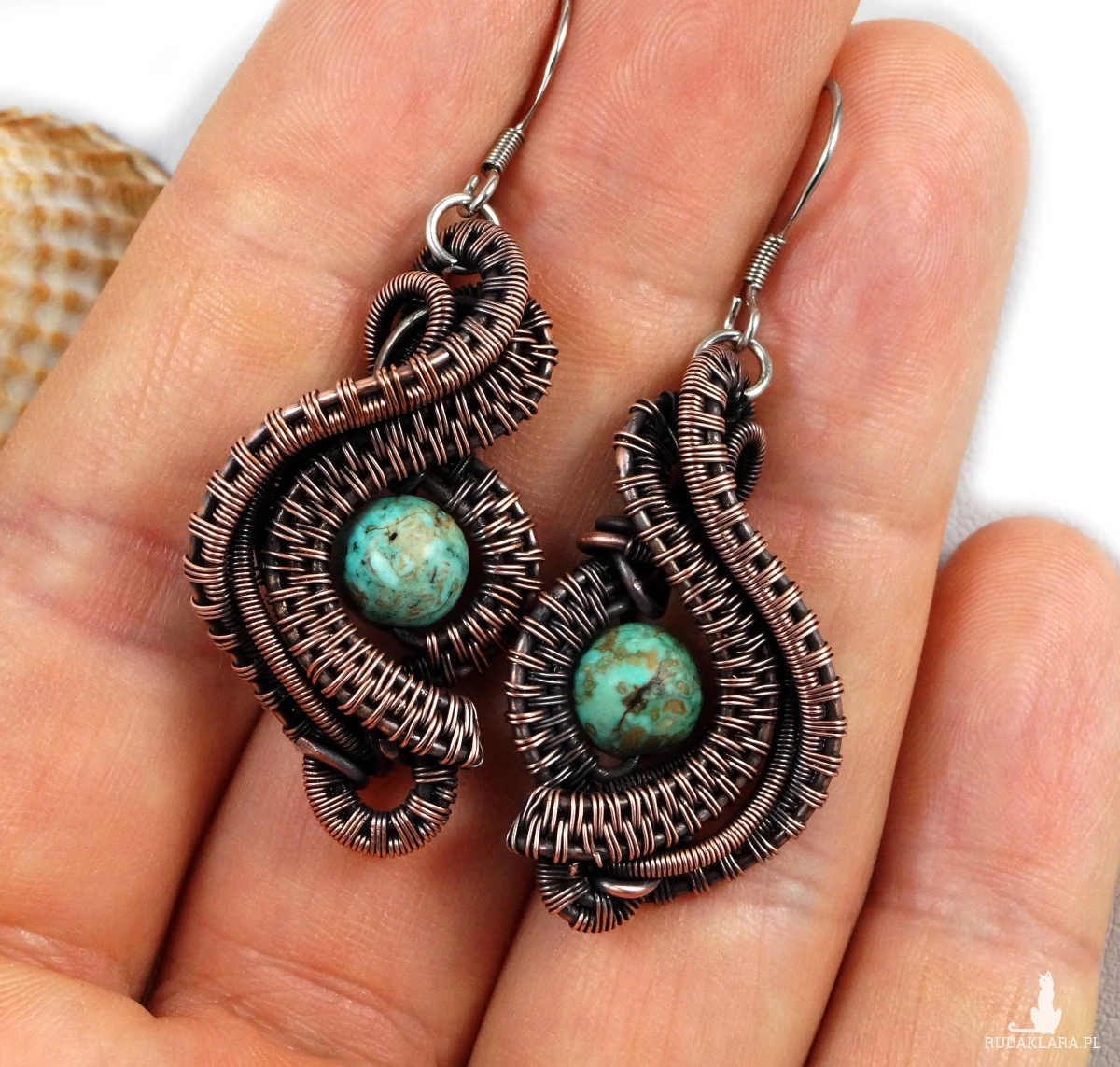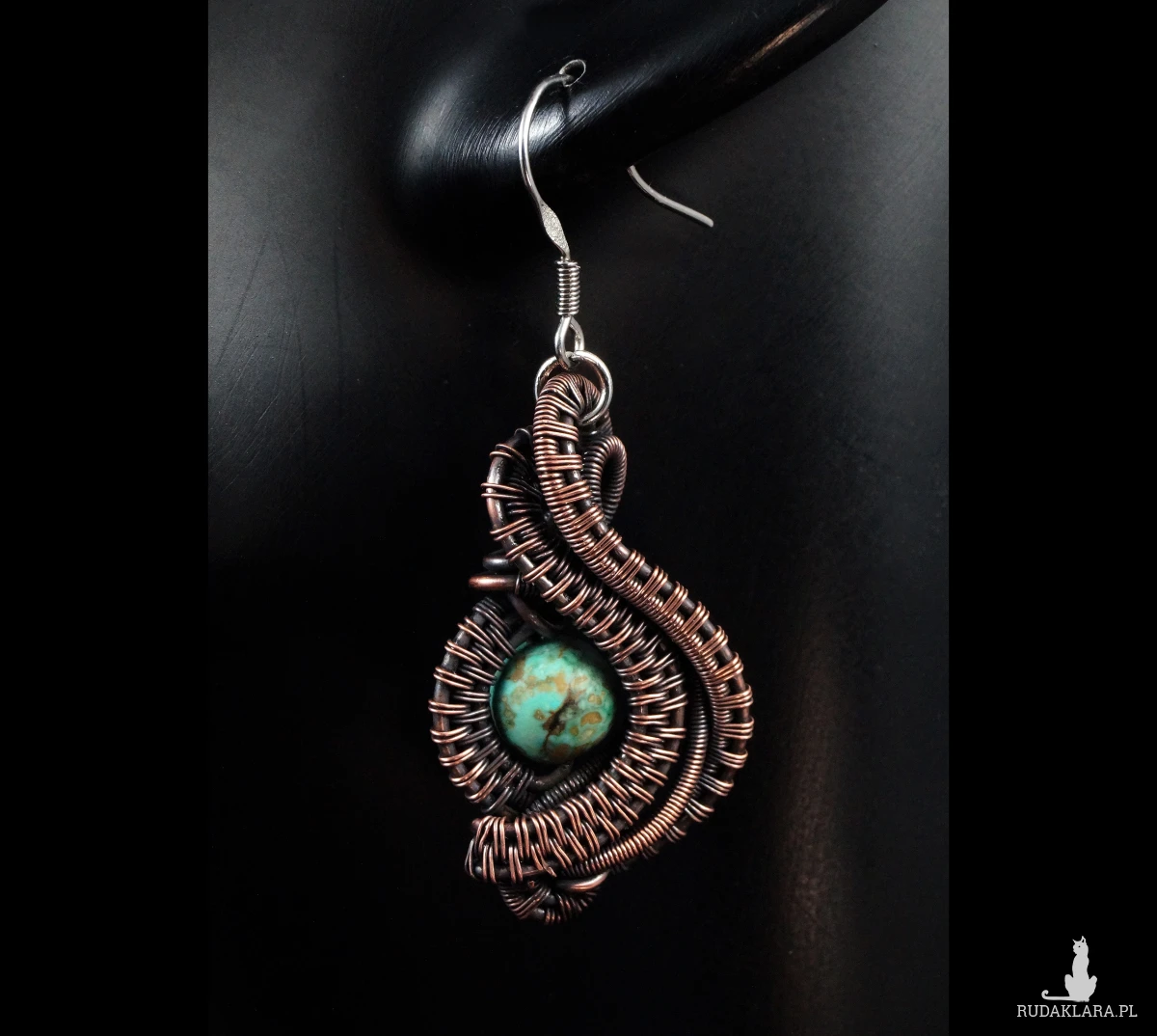 Miedziane, patynowane kolczyki z kuleczkami turkusu zielono niebieskiego.