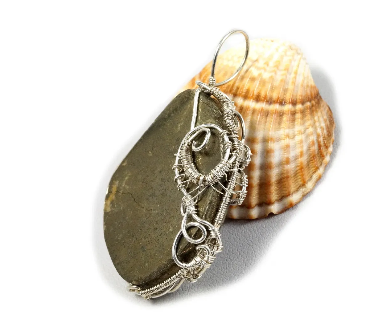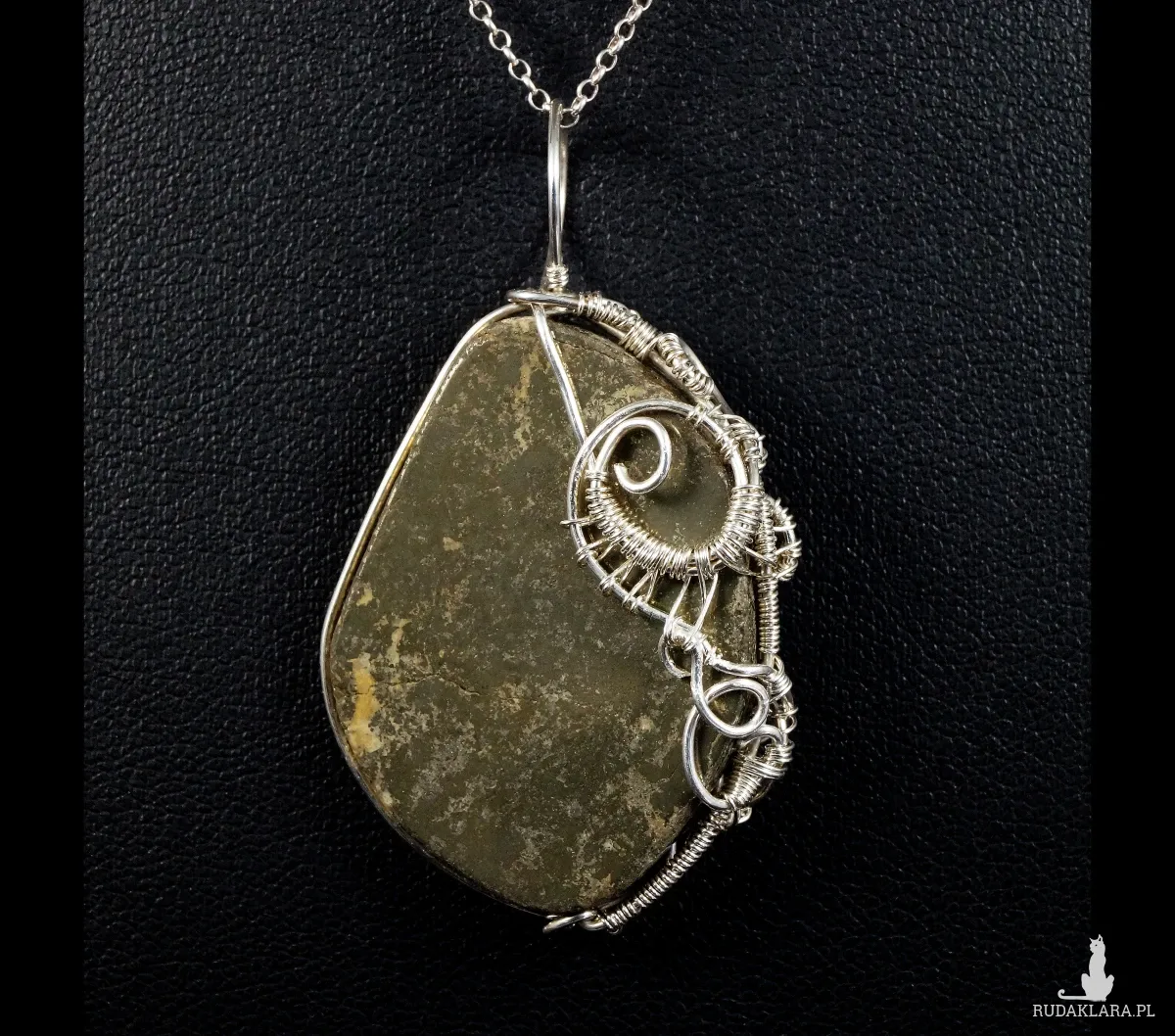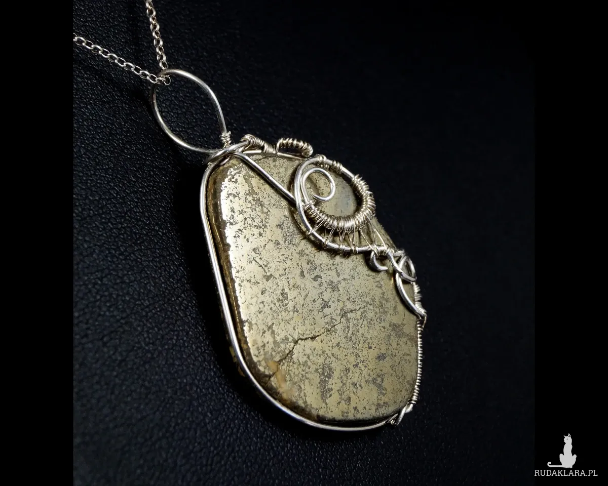 Bajeczny, misternie pleciony wisior z kaboszonem pirytu. Wisior zaprojektowany i wykonany przeze mnie od podstaw bardzo pracochłonną i precyzyjną techniką wire-wrapping ze srebra próby 925, 930 i 999.