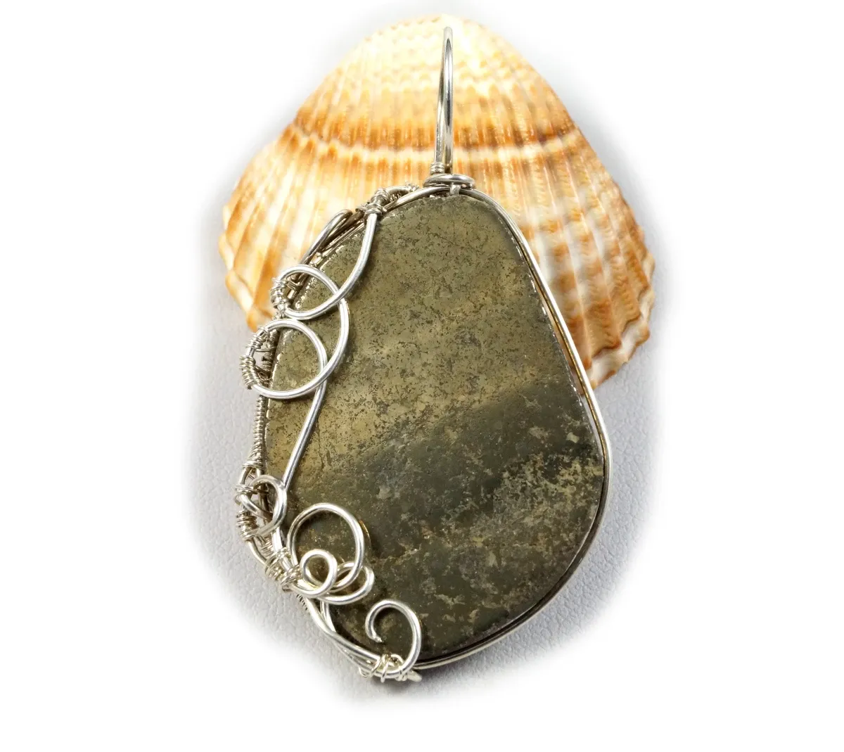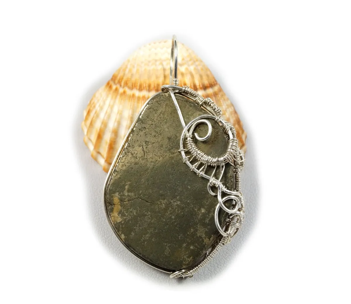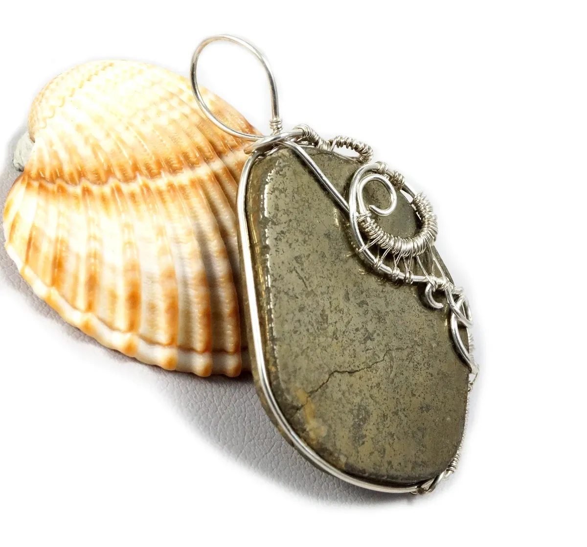 Bajeczny, misternie pleciony wisior z kaboszonem pirytu. Wisior zaprojektowany i wykonany przeze mnie od podstaw bardzo pracochłonną i precyzyjną techniką wire-wrapping ze srebra próby 925, 930 i 999.