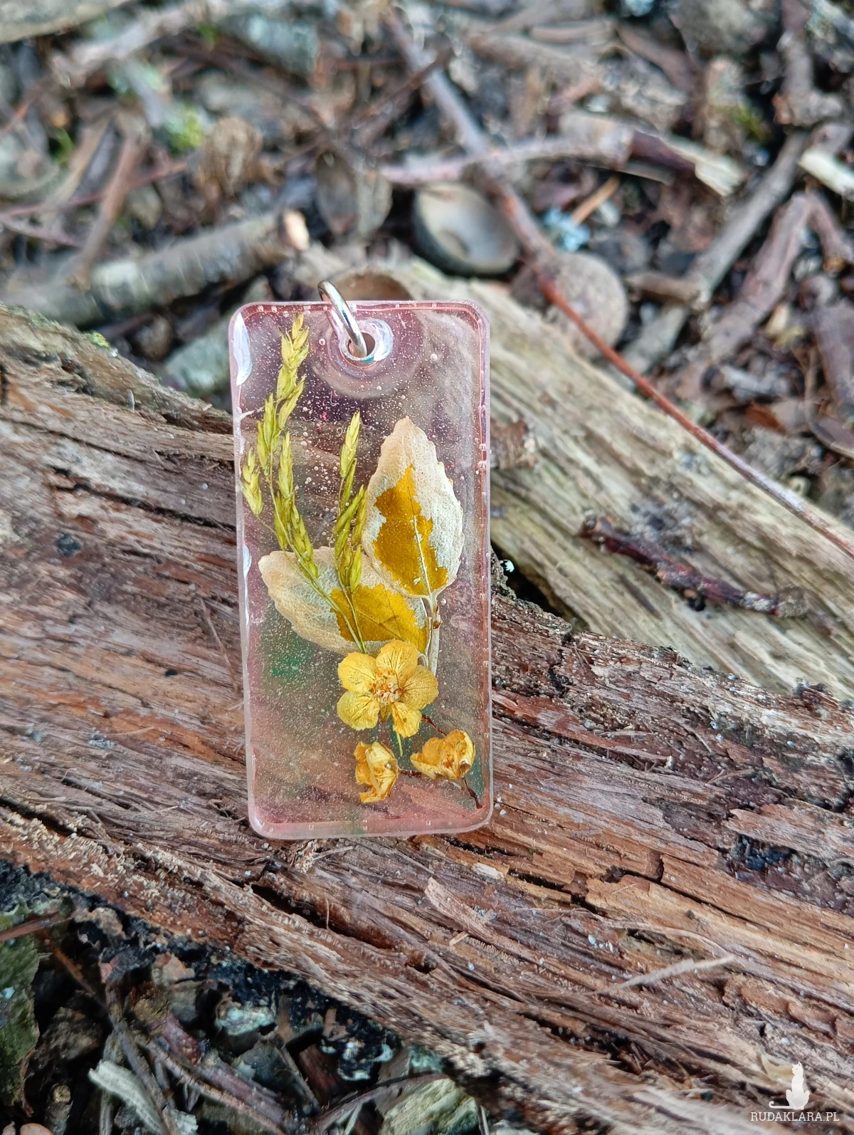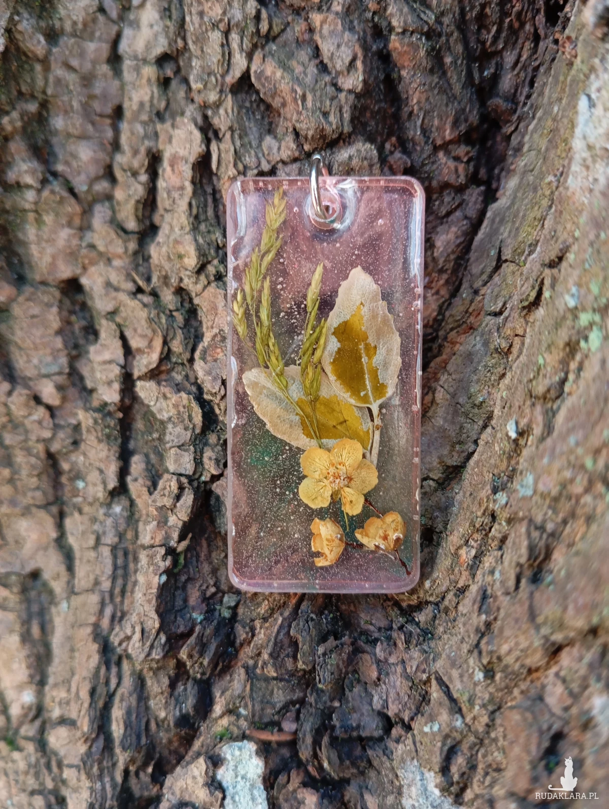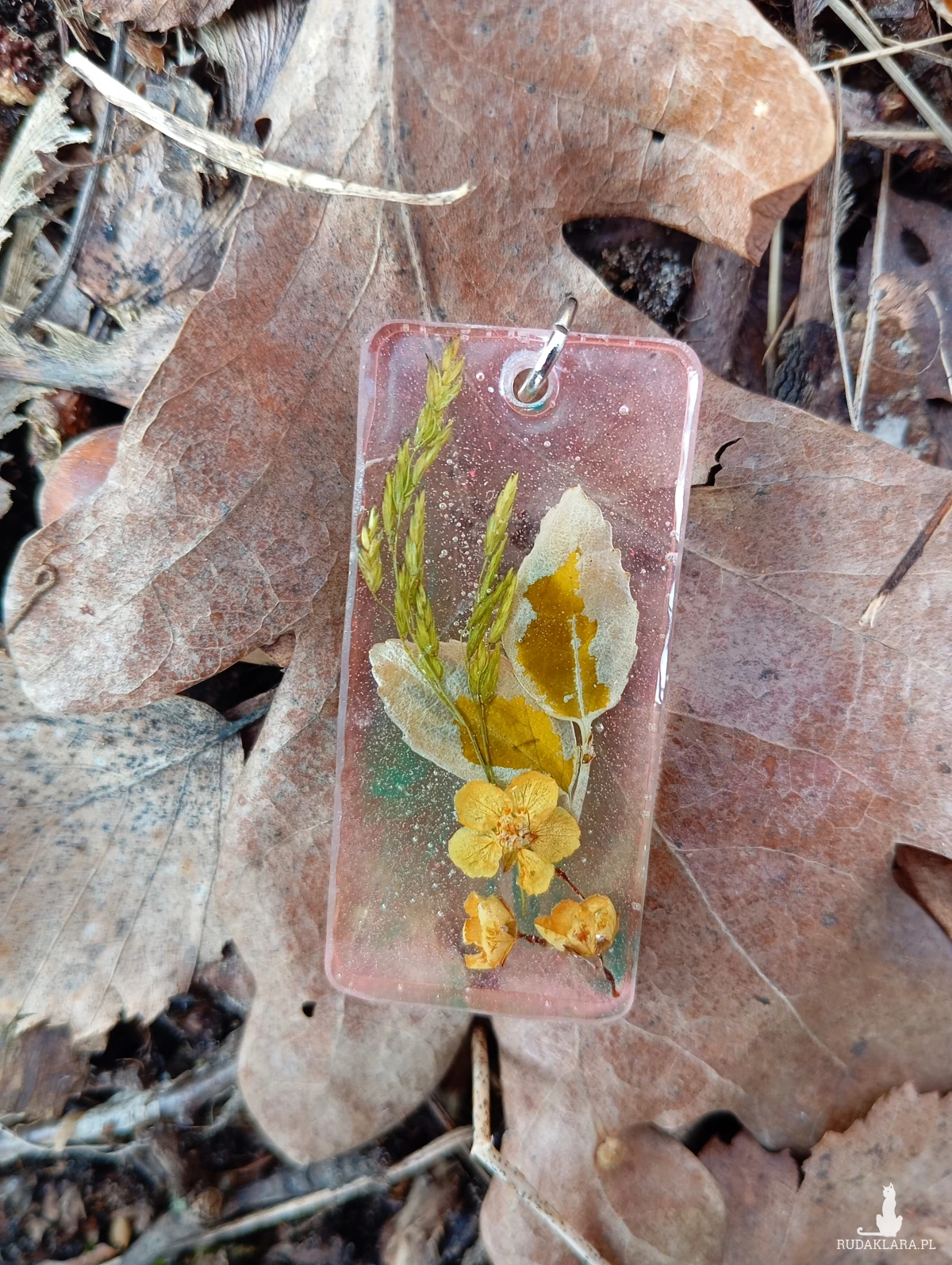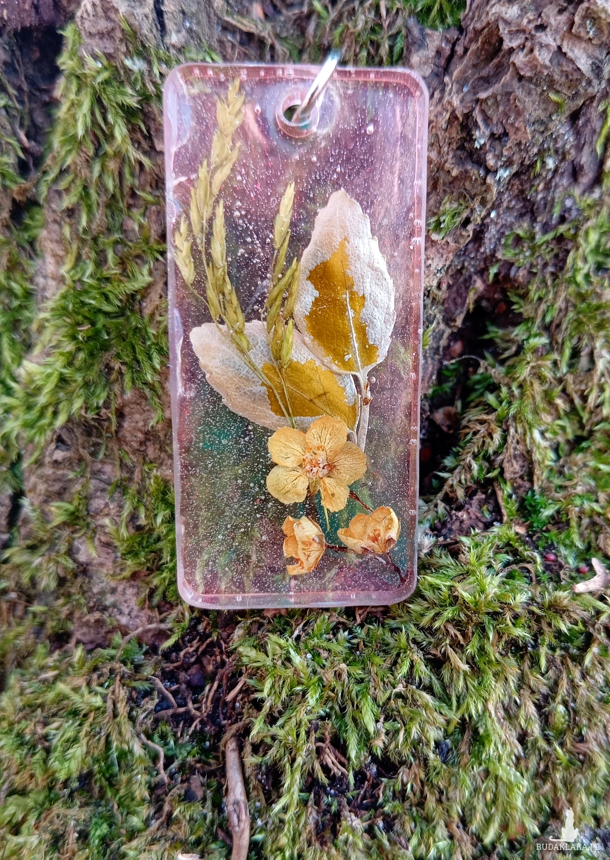 zamknięty w zawieszce z żywicy, z różowo – zieloną poświatą, gdzie zatrzymał