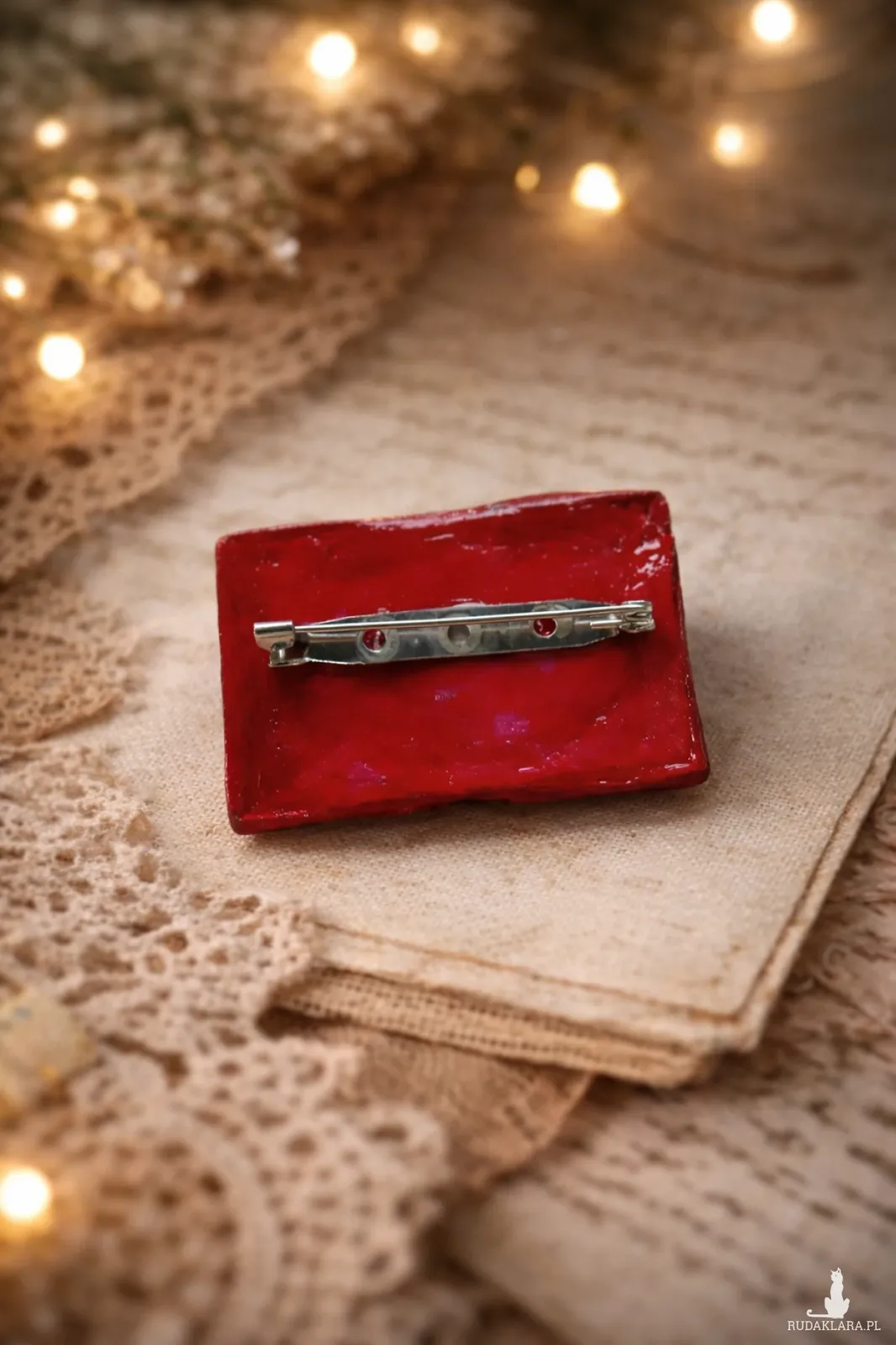 Oryginalna broszka - stara książka została ulepiona z gliny samoutwardzalnej, ozdobiona techniką decoupage. Dominujące kolory to beże, brązy, czerwienie. Broszka zabezpieczona lakierem.Wymiary: 5 cm/3,5 cm/1 cm.