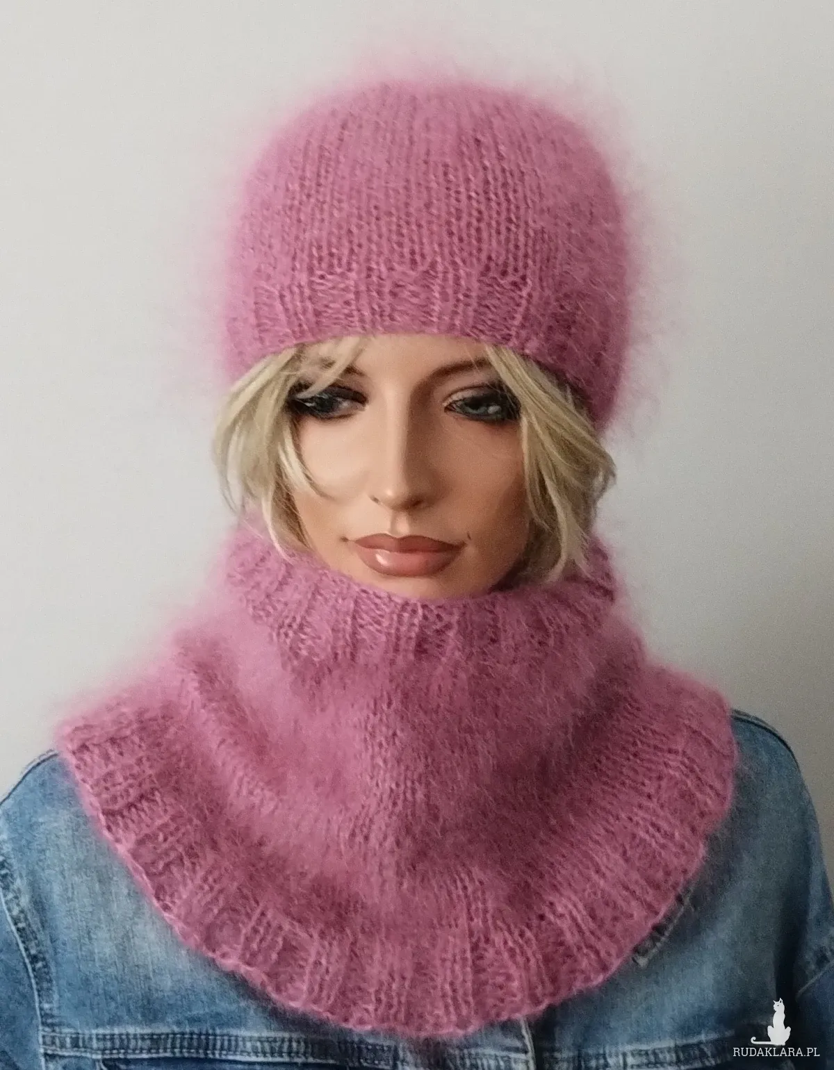 Komplet czapka i komin zrobione ręcznie na drutach z mieszanki 50%akrylu i 50%moheru w kolorze ciemnego różu-ciemnej fuksji.Miękka,nie gryzie.