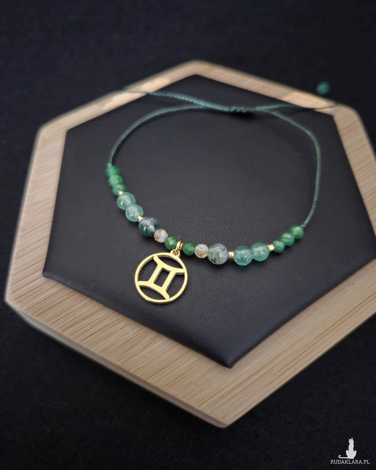 Awenturyn i agat mszysty wprowadzają harmonię, kreatywność i lekkość myślenia, podczas gdy cytryn rozświetla całość energią, optymizmem i radością. Kolorystyka zieleni i delikatnych, ciepłych tonów doskonale oddaje żywiołową, radosną i zmienną naturę Bliźniąt.